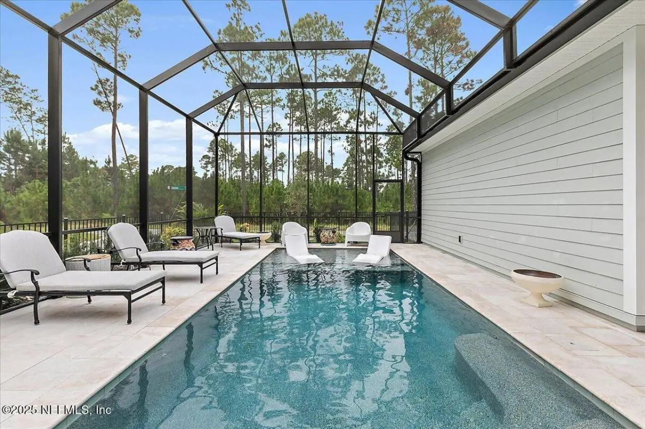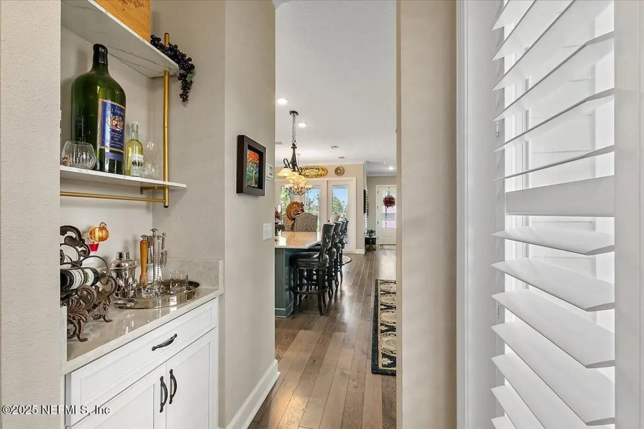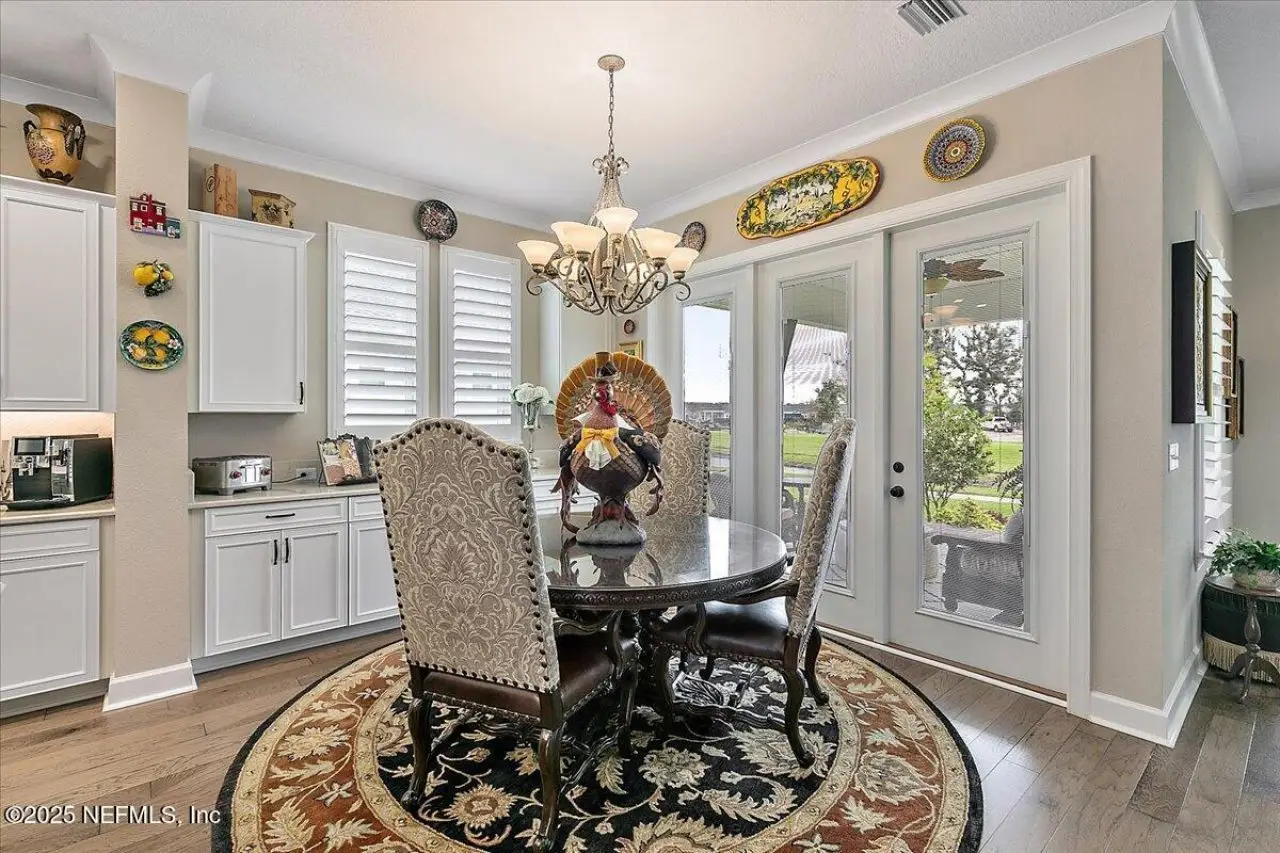 Welcome to this exquisite David Weekley home in the exclusive Seven Pines community. This beautifully designed two-story residence features four bedrooms and three-and-a-half bathrooms, offering both elegance and functionality. Step into a welcoming foyer that opens to the formal dining room, highlighted by upgraded wood flooring, crown molding throughout, and plantation shutters. The gourmet kitchen is a chef’s dream, featuring extended cabinetry and countertops, soft-close drawers, granite surfaces, farmhouse sink, five-burner gas cooktop, wet bar, beadboard accents, under-cabinet lighting, and a stylish backsplash. French doors with built-in blinds open from the dining room to a private outdoor sitting area, perfect for enjoying the morning or evening sun. The primary suite is located on the main floor and includes a custom walk-in closet and a spacious shower. The laundry room, conveniently located next to the primary suite, features upgraded cabinetry. A half bath is also located on the main level. The gathering room offers a spacious area for entertaining and flows seamlessly to the outdoor living space, which includes a covered pool and summer kitchen—ideal for year-round enjoyment. Upstairs, upgraded wood stairs lead to three additional bedrooms and a large bonus/living area, providing flexible space for relaxation, work, or play.