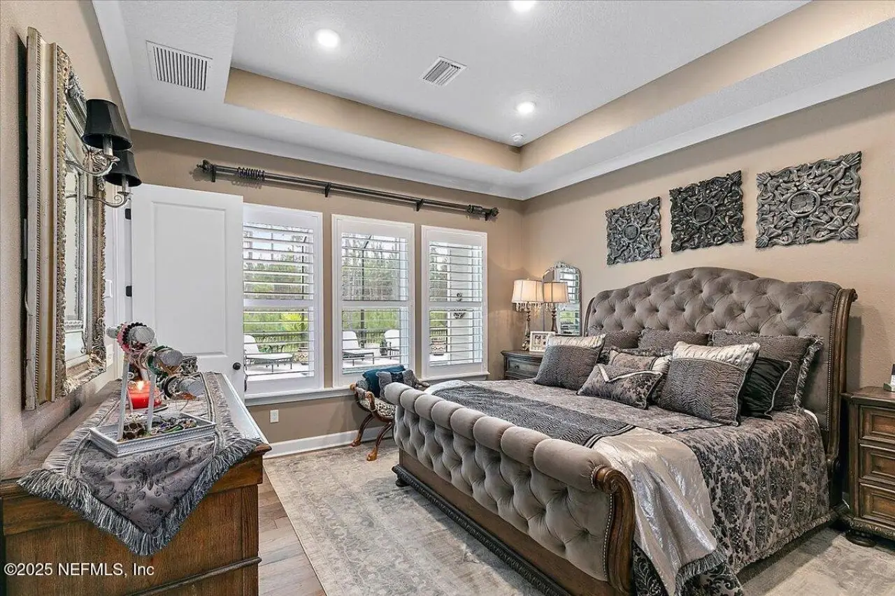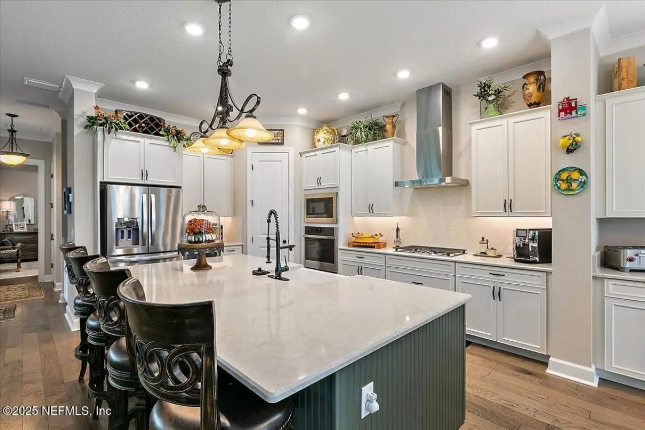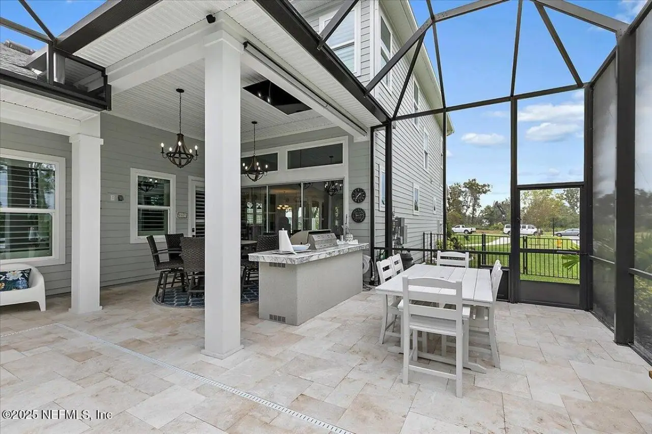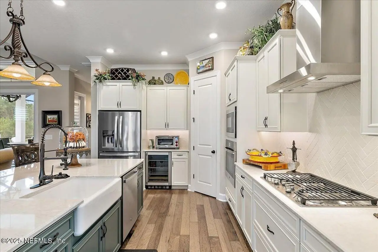 Welcome to this exquisite David Weekley home in the exclusive Seven Pines community. This beautifully designed two-story residence features four bedrooms and three-and-a-half bathrooms, offering both elegance and functionality. Step into a welcoming foyer that opens to the formal dining room, highlighted by upgraded wood flooring, crown molding throughout, and plantation shutters. The gourmet kitchen is a chef’s dream, featuring extended cabinetry and countertops, soft-close drawers, granite surfaces, farmhouse sink, five-burner gas cooktop, wet bar, beadboard accents, under-cabinet lighting, and a stylish backsplash. French doors with built-in blinds open from the dining room to a private outdoor sitting area, perfect for enjoying the morning or evening sun. The primary suite is located on the main floor and includes a custom walk-in closet and a spacious shower. The laundry room, conveniently located next to the primary suite, features upgraded cabinetry. A half bath is also located on the main level. The gathering room offers a spacious area for entertaining and flows seamlessly to the outdoor living space, which includes a covered pool and summer kitchen—ideal for year-round enjoyment. Upstairs, upgraded wood stairs lead to three additional bedrooms and a large bonus/living area, providing flexible space for relaxation, work, or play.