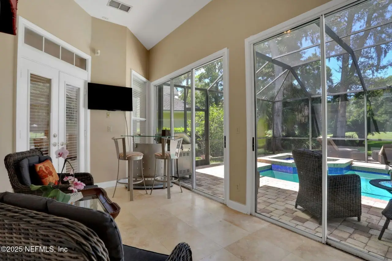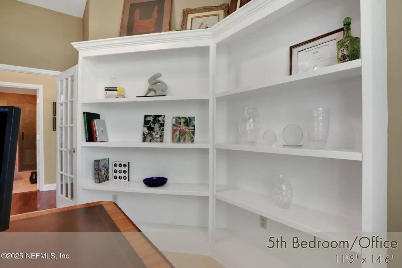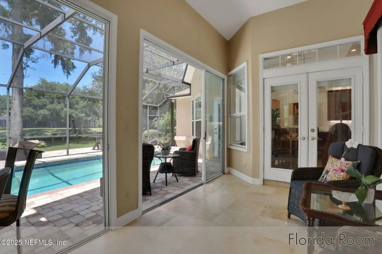 This gorgeous home sits pretty on a spacious lot overlooking the Mark McCumber designed championship golf course in the exclusive gated community of Queen's Harbour. It has five ensuite bedrooms and over 3,300 sq ft of indoor living space. An added bonus is the 860 sq ft of screened outdoor living complete with an inground pool and spa. This home has room for everyone. Pull up the expanded paver driveway and you'll immediately notice the charming courtyard entry garage. The magnificent eight-foot leaded glass double doors topped with an arched transom window create a grand entrance that floods the foyer, living room, and dining room with natural light. Step inside and prepare to be wowed by the incredible water-to-golf course views through the living room's wall of windows. The large-format travertine and gleaming engineered wood floors throughout the main level add an elegant touch that's both beautiful and practical. The spacious dining room can and has hosted dinner parties for twelve or more, making it perfect for entertaining. But the real showstopper is the Great Room, which truly serves as the heart of this home. This naturally-lit space features a wall of windows and glass doors with fabulous water-to-golf views from every angle. The luxuriously updated kitchen is a chef's paradise with a huge island that seats six for dining and gathering space for more. The breakfast nook and comfortable den with gas marble hearth fireplace paired with an arched floor-to-ceiling custom wood display cabinet complete this amazing space.The furniture-inspired Thomasville Custom Cabinetry with two-tier stacked upper cabinets features a glass display gallery to showcase all of for your attractive dishware and collectibles. Soft-close doors, custom inserts, and soft-glide drawers highlight the quality construction. The exotic and rare double straight-edge granite countertops with matching seamless backsplash create a cohesive, designer-inspired look.Two built-in tumbled travertine beverage stations add convenience and style. One serves as a coffee station while the other handles adult beverages, both feautue ambient lighting and custom glass shelving. The glass entry pantry closet with custom shelving keeps everything organized and clutter-free.The kitchen comes equipped with a top-of-the-line Thermador appliance package including a six-burner gas range topped with a limestone exhaust hood, seven-foot three-door French-style refrigerator, and Sapphire dishwasher.Off the great room, through the breakfast nook to the sun room featuring double sliders leading to the outdoor screened living space with sparkling pool and spa overlooking the park-like backyard and long views of the golf course. A huge open patio extends the outdoor entertainment options even further.The thoughtful three-way split bedroom floor plan works perfectly for multi-generational living. The primary bedroom, located just off the foyer, features a vestibuled entry with an oversized bedroom on one side and a resort-style bath on the other. This tremendous bathroom includes a soaker tub, oversized shower, two separate vanities, water closet, and two walk-in closets. The sleeping area has a generously sized sitting area with French doors to the sun room and pool.On the opposite side of the home, the guest bedroom wing includes bedrooms two and three sharing a Jack and Jill bath with double sinks and linen closet. Both bedrooms are generously sized, with one featuring a walk-in clos