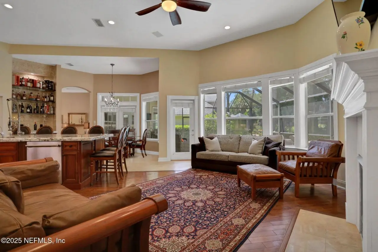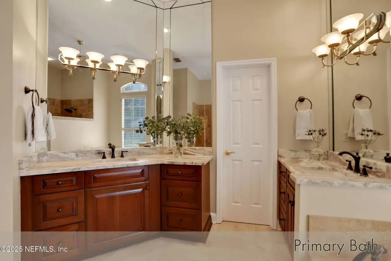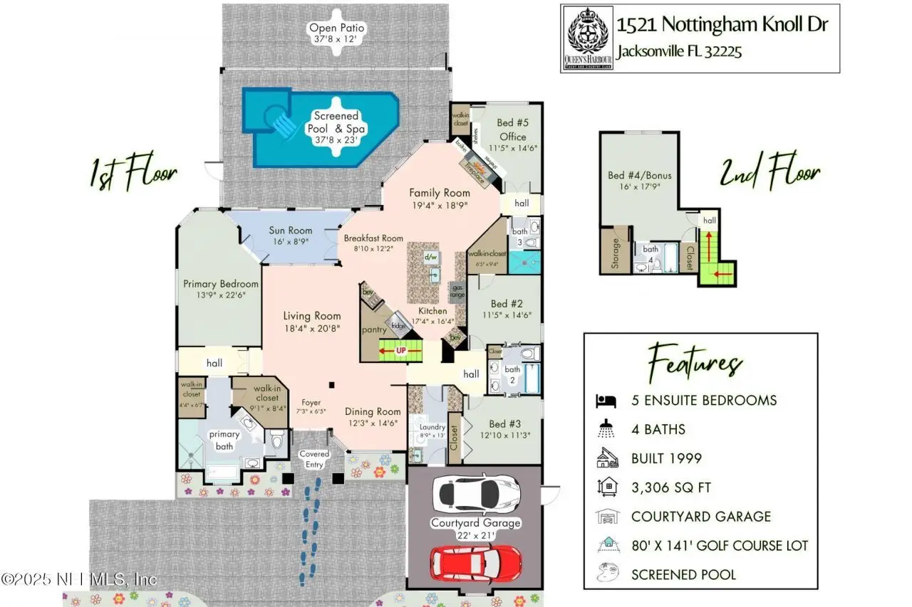 This gorgeous home sits pretty on a spacious lot overlooking the Mark McCumber designed championship golf course in the exclusive gated community of Queen's Harbour. It has five ensuite bedrooms and over 3,300 sq ft of indoor living space. An added bonus is the 860 sq ft of screened outdoor living complete with an inground pool and spa. This home has room for everyone. Pull up the expanded paver driveway and you'll immediately notice the charming courtyard entry garage. The magnificent eight-foot leaded glass double doors topped with an arched transom window create a grand entrance that floods the foyer, living room, and dining room with natural light. Step inside and prepare to be wowed by the incredible water-to-golf course views through the living room's wall of windows. The large-format travertine and gleaming engineered wood floors throughout the main level add an elegant touch that's both beautiful and practical. The spacious dining room can and has hosted dinner parties for twelve or more, making it perfect for entertaining. But the real showstopper is the Great Room, which truly serves as the heart of this home. This naturally-lit space features a wall of windows and glass doors with fabulous water-to-golf views from every angle. The luxuriously updated kitchen is a chef's paradise with a huge island that seats six for dining and gathering space for more. The breakfast nook and comfortable den with gas marble hearth fireplace paired with an arched floor-to-ceiling custom wood display cabinet complete this amazing space.The furniture-inspired Thomasville Custom Cabinetry with two-tier stacked upper cabinets features a glass display gallery to showcase all of for your attractive dishware and collectibles. Soft-close doors, custom inserts, and soft-glide drawers highlight the quality construction. The exotic and rare double straight-edge granite countertops with matching seamless backsplash create a cohesive, designer-inspired look.Two built-in tumbled travertine beverage stations add convenience and style. One serves as a coffee station while the other handles adult beverages, both feautue ambient lighting and custom glass shelving. The glass entry pantry closet with custom shelving keeps everything organized and clutter-free.The kitchen comes equipped with a top-of-the-line Thermador appliance package including a six-burner gas range topped with a limestone exhaust hood, seven-foot three-door French-style refrigerator, and Sapphire dishwasher.Off the great room, through the breakfast nook to the sun room featuring double sliders leading to the outdoor screened living space with sparkling pool and spa overlooking the park-like backyard and long views of the golf course. A huge open patio extends the outdoor entertainment options even further.The thoughtful three-way split bedroom floor plan works perfectly for multi-generational living. The primary bedroom, located just off the foyer, features a vestibuled entry with an oversized bedroom on one side and a resort-style bath on the other. This tremendous bathroom includes a soaker tub, oversized shower, two separate vanities, water closet, and two walk-in closets. The sleeping area has a generously sized sitting area with French doors to the sun room and pool.On the opposite side of the home, the guest bedroom wing includes bedrooms two and three sharing a Jack and Jill bath with double sinks and linen closet. Both bedrooms are generously sized, with one featuring a walk-in clos