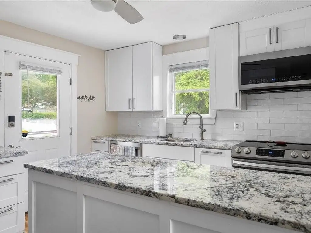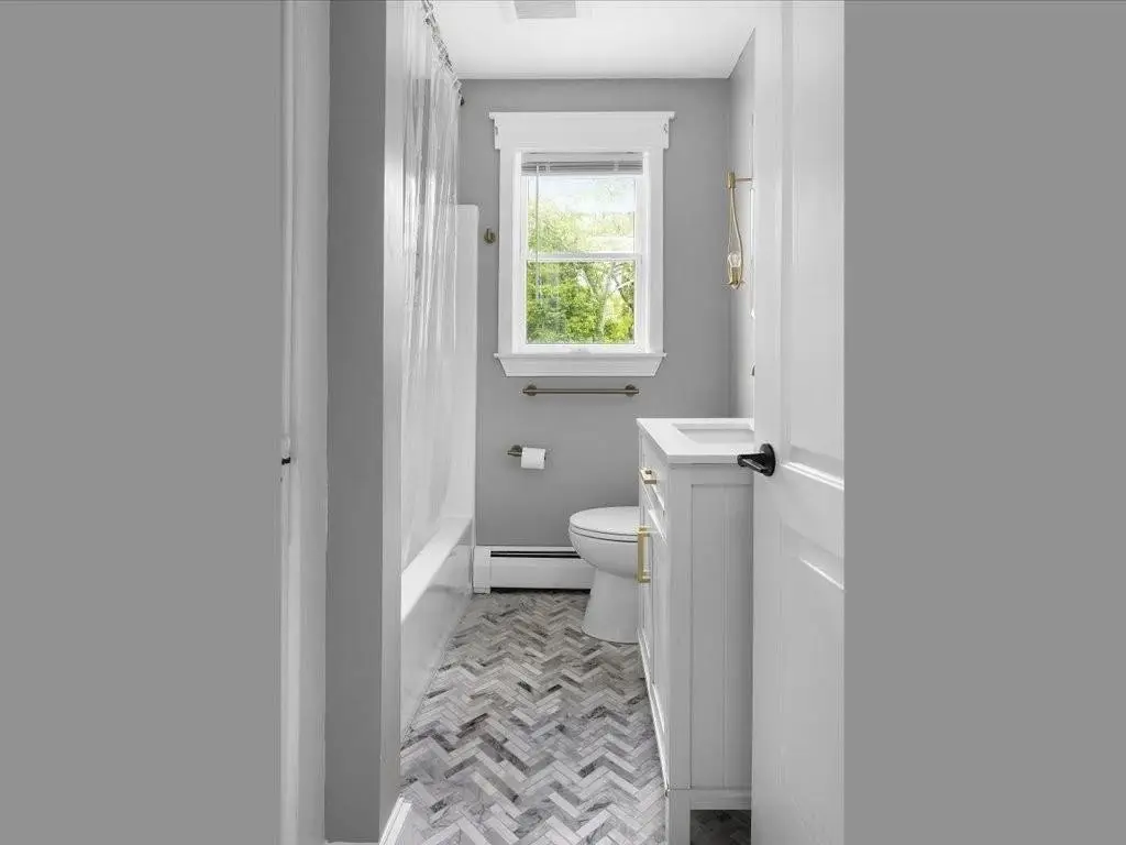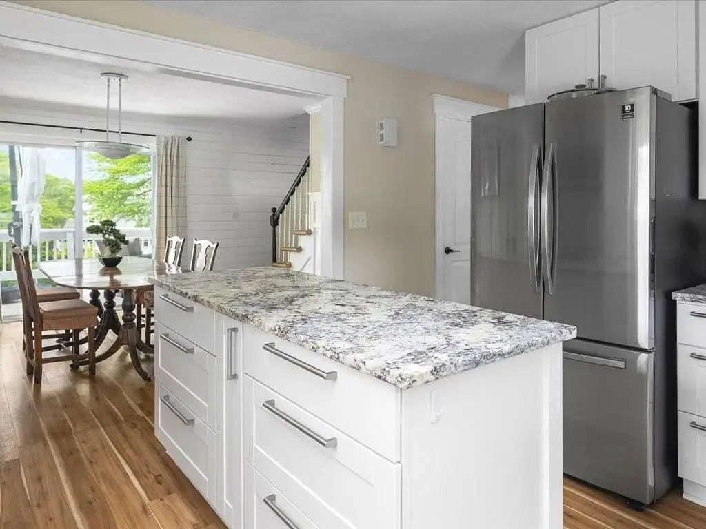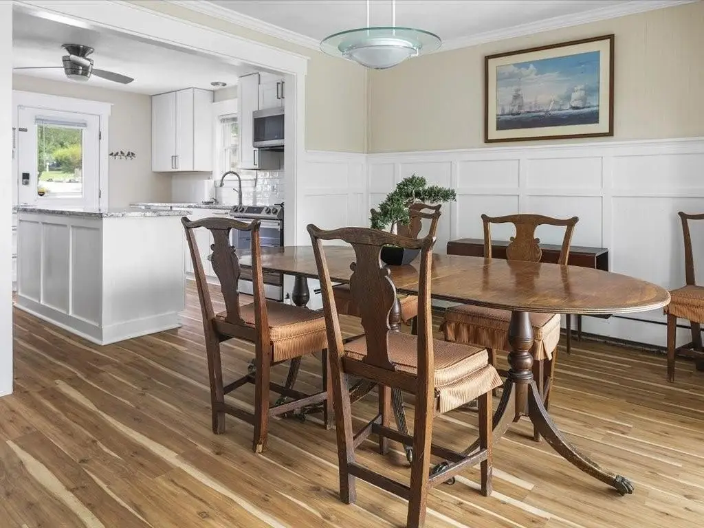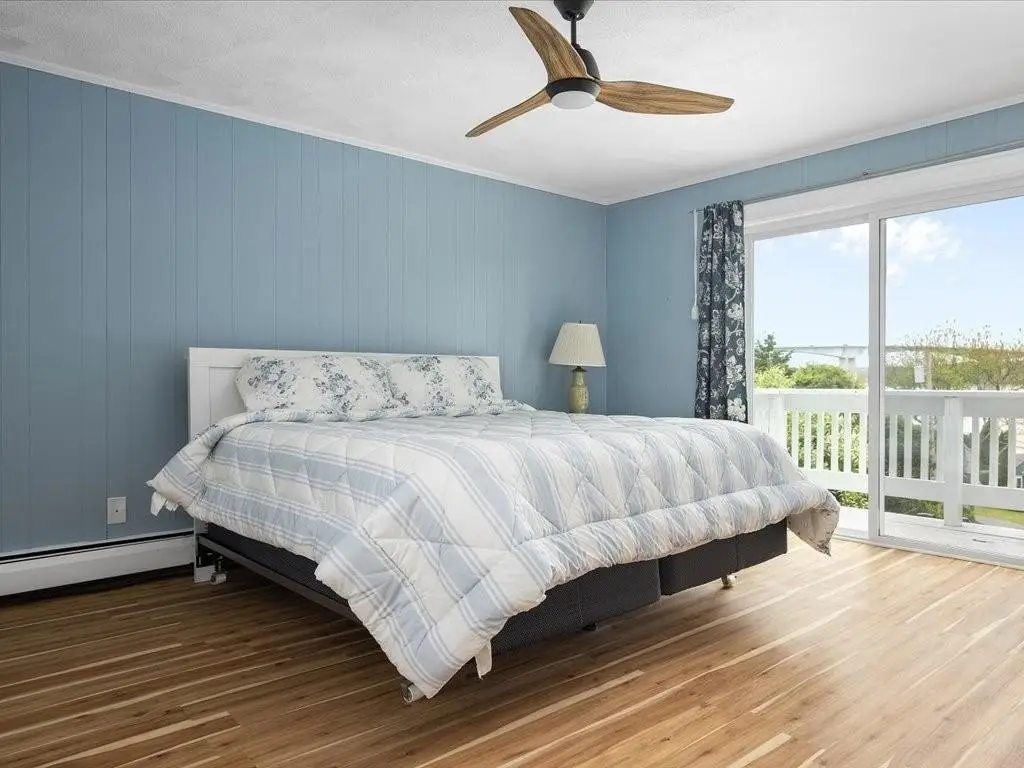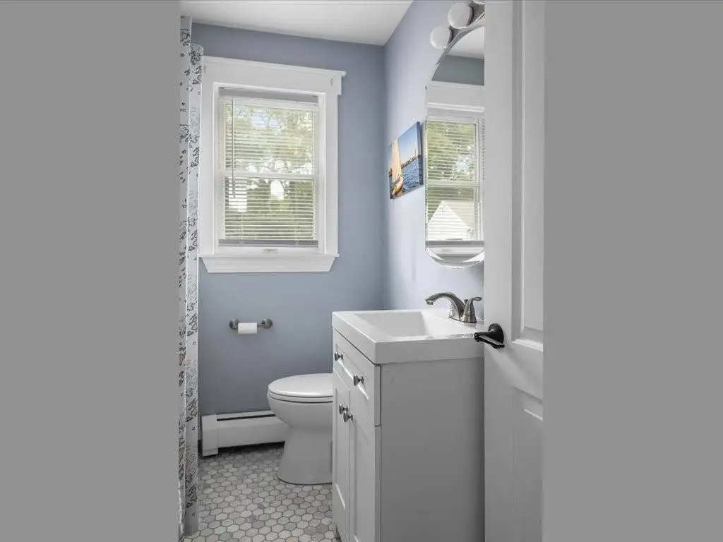 Directly across from a beach right of way to the West Passage of Narragansett Bay, this chic, coastal, recently renovated contemporary enjoys sunset, Bay and Jamestown Bridge views. The tasteful, sun-swept home has hickory floors throughout, ship lap detail, an open plan and chef's kitchen with generous storage, a center island, granite counters and stainless appliance. The dining room enjoys water views and has wainscoting and glass sliders that open to a waterside deck while the living room also opens to a waterside deck and has an electric fireplace for ambiance in the fall and winter. There's a full bath on the first floor, while two bedrooms, each with waterside balconies and views, and a full bath complete the second floor. A finished walk-out lower level with a combination media room and office has built-in bookcases and a glass sliding door that leads to a water side entertainment area and the gently sloping back lawn. The lower level also offers a laundry room with a sink, a storage/utility area and a full shower bath. Accessed at the end off a quiet street, it's just a short distance from Sunset Beach and offers easy access to downtown Jamestown as well as Route 138E and Route 138W. Unique. Move in and enjoy the summer.
