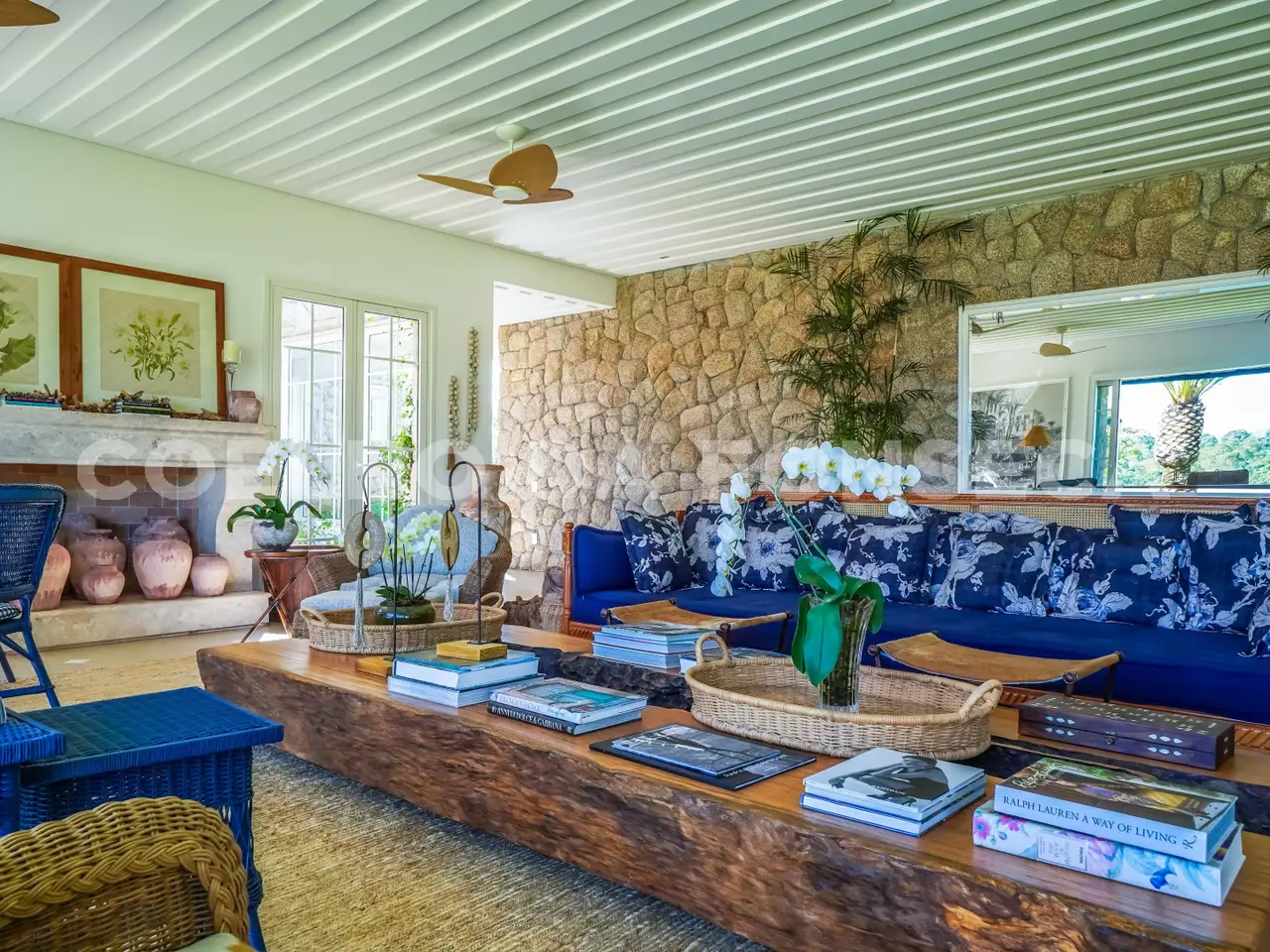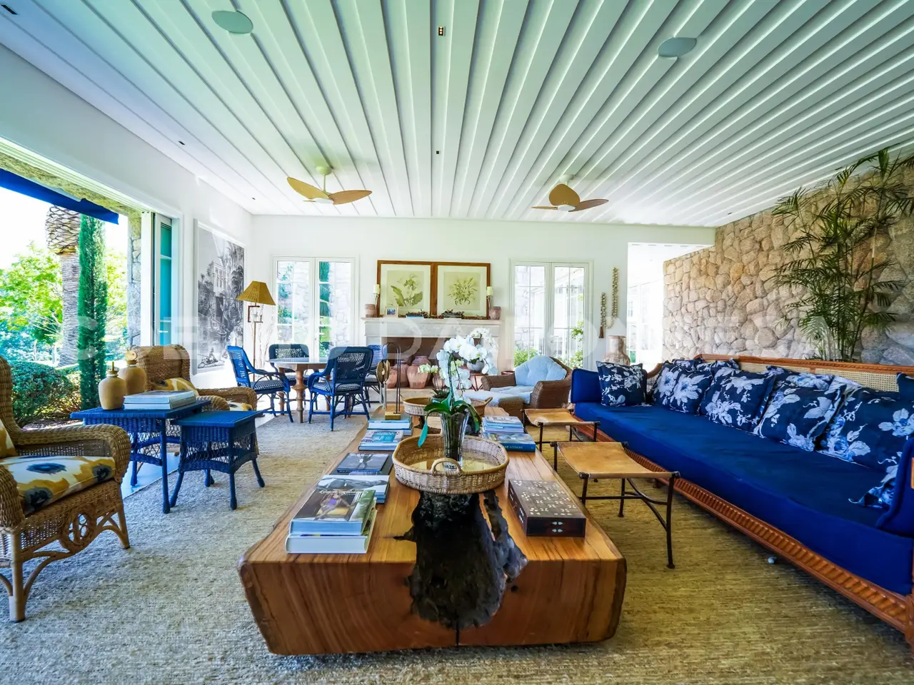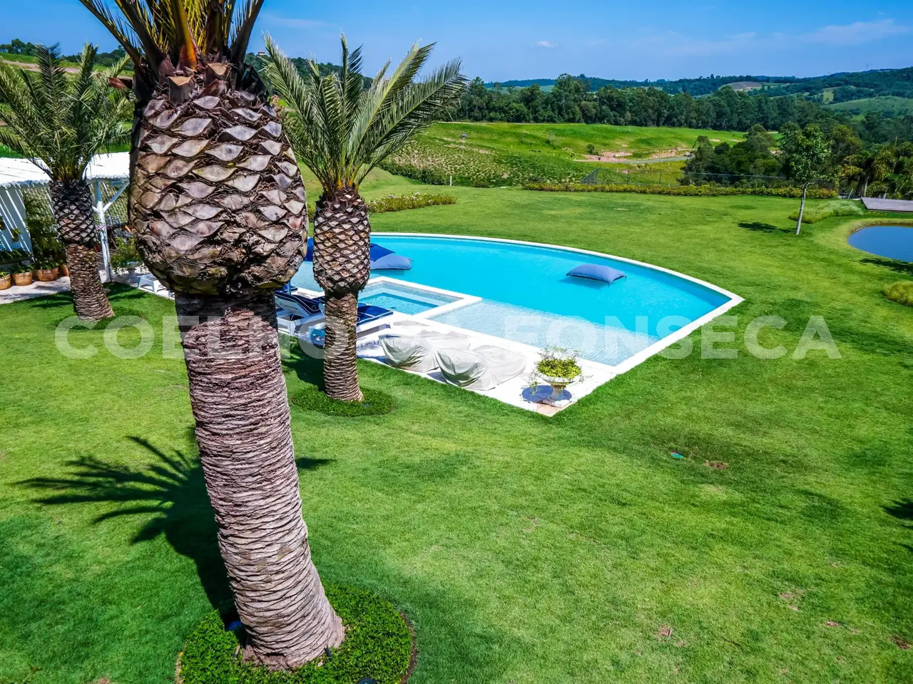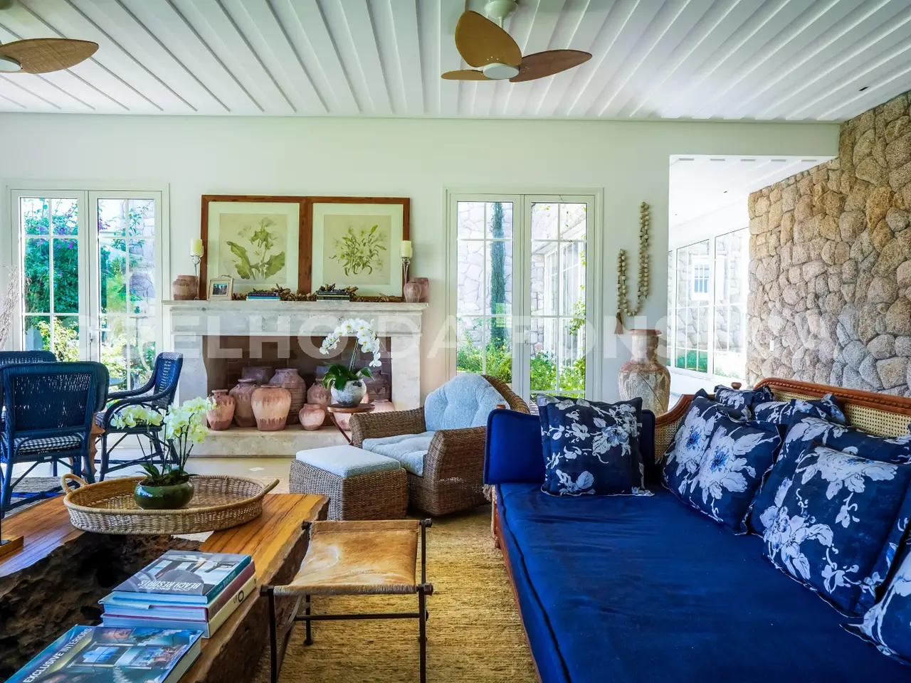 Where Nature Meets Sophistication. There are places that are not just homes, but settings for stories, unforgettable moments and a connection with what really matters. This house was born from this dream: a refuge amidst lush nature, where comfort, exclusivity and well-being come together. From the choice of the land - one of the most privileged in the condominium, elevated, with a long view and indescribable sunsets - to the smallest details of the landscaping and architecture, everything was thought out to provide a unique experience. More than 110 adult trees were carefully planted, creating a garden that blends in with the native forest, with a stream, waterfall and a lake that make the environment even more special. The grand 16x8 meter swimming pool, flanked by a raw travertine marble deck, becomes an invitation for moments of relaxation. Next to it, a pergola with space for snacks complements this perfect setting for entertaining friends and family. Inspired by classic European elegance with a contemporary touch of modern barn houses, it brings a timeless aesthetic. The soft off-white tones harmonize with the rustic stones, creating a welcoming and sophisticated atmosphere. Inside, the coziness comes to life with exclusive wicker and wood furniture, custom-designed with references to the Ralph Lauren Home style. The balcony connects the living room to the garden, providing a view worthy of a painting. The travertine marble fireplace, accompanied by sofas and armchairs for up to 16 people, creates a perfect space for moments of contemplation. Separated by a trellis with climbing plants, the gourmet dining room, pizza oven, barbecue and all the necessary equipment for unforgettable gastronomic experiences.