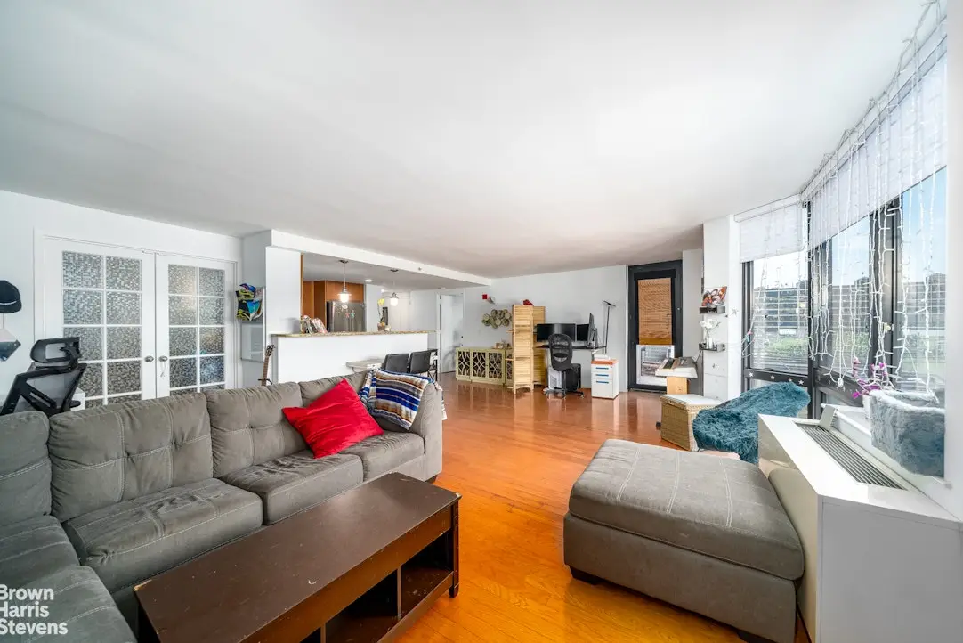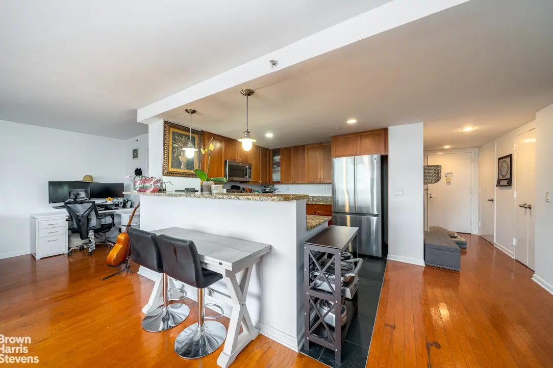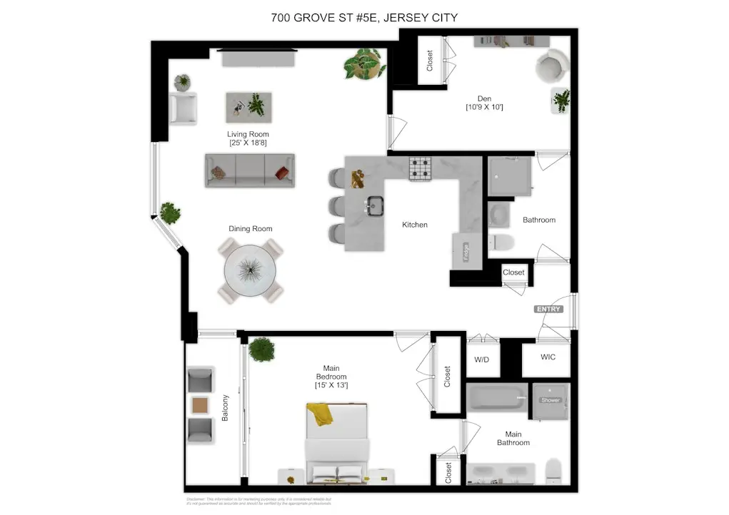 Sun drenched west facing spacious open living / dining area 2BR 2BA (1BR + den) with newly renovated flooring throughout, 1296 SqFt at highly desirable 700 Grove - a steel and concrete construction. Perfect entertaining with a Gourmet open kitchen featuring granite counters, breakfast bar, slate tile flooring and stainless steel appliances. The spacious master suite offers plenty of storage and connects to an en-suite bathroom featuring large soaking tub, separate shower and marble double vanity. Den can be used as a second bedroom or office space. Modern guest bathroom. Convenience of an in home washer dryer. One indoor garage Parking space included. Rent includes heat, cold/hot water, cooking gas, cable TV and high speed internet. Building amenities include large gym, 24hr doorman residents lounge, landscaped courtyard BBQ grills and shuttle to Hoboken PATH. Available Jan 1st (Pictures from previous occupancy)