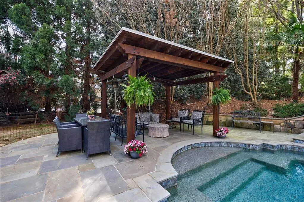 Discover this exceptional estate home in the prestigious COUNTRY CLUB of the SOUTH, offering a luxurious walkout pool and spa directly from the main level. The secluded backyard oasis features a waterfall spillover from the elevated hot tub spa, ample green space for outdoor games, and a charming gazebo cabana perfect for shaded relaxation and outdoor entertainment. The pool surround features blue stone slate creating beautiful setting. Upon entering through the elegant French doors, you'll be welcomed by an entry foyer with a striking central staircase. The formal living room seamlessly flows into the expansive keeping room featuring a fireplace flanked by built-in bookcases, creating a perfect space for entertaining. The banquet-sized dining room adjoins the chefs kitchen, which boasts a 48-inch gas range, stainless steel appliances, a center island, and a generous breakfast bar. The sunlit breakfast room and keeping room overlook the beautiful pool area. A thoughtfully designed rear foyer provides access to the four-car garage, a spacious mudroom, a casual powder room, and a laundry room with a utility sink. This area also offers easy access to the backyard for convenient poolside entertaining. The upper-level primary suite is a true retreat, featuring a sitting area with a cozy fireplace, a wall of windows, and an updated spa-like bath with a stand-alone soaking tub. The suite includes a massive flex space room, two independent walk-in closets, and a third walk-in closet complete with a built-in desk. Three additional en-suite bedrooms are located on the upper level, each with its own updated bath and ample closet space. The finished terrace level offers even more space for relaxation and entertainment with a wet bar, family room, game area, and exercise room. A private terrace-level bedroom with a full bath and French door access to a covered patio completes the space. Every corner of this home offers generous living areas designed for both comfort and luxury. Enjoy the security and prestige of living in a gated community with optional Country Club membership, providing access to premier golf, tennis, and resort-style amenities. Don't miss this extraordinary opportunity to own a home that combines elegance, space, and an unbeatable location!