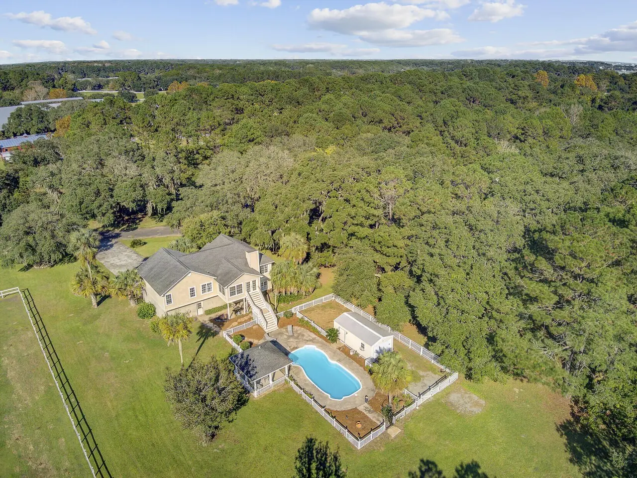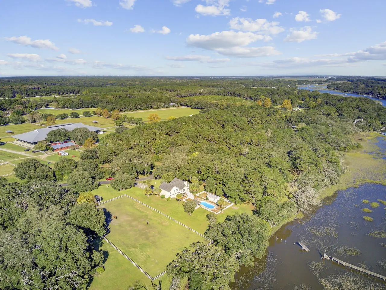 What makes this Johns Island property special? Come and see! The home is within Brickhouse Plantation and set on an estate sized creek front lot overlooking the Abbapoola Creek which leads to the Stono River. This beautiful property near the end of the cul-de-sac is fronted by the pastures of Charleston Area Therapeutic Riding Center with its gorgeous landscape and horses. The backyard is immense and overlooks the creek. A dock is in place that needs repairs and can access the deeper part of the creek. Beside the property is another private pasture with two horses owned by a nearby neighbor. This home exudes peacefulness and tranquility! Enjoy the abundant wildlife including wild turkeys, peacocks and deer in addition to the beautiful horses. The elevated home features vaulted ceilings, a gas fireplace and a sunroom overlooking the pool and Abbapoola Creek. The main living areas and bedrooms are on one level. Below the home is a generously sized 2 car garage and an enclosed heated and cooled recreation area and office. The fenced pool area has a gazebo for relaxing and for protection from the summer sun and there's also a fenced pet area. The neighborhood with only 8 homes on estate sized lots enjoys a community property with a boat ramp. Owner states the equestrian center offers boarding for the horses. These properties in Brickhouse Plantation rarely come on the market, so don't miss this opportunity! The home needs some updating and repairs and is priced accordingly.