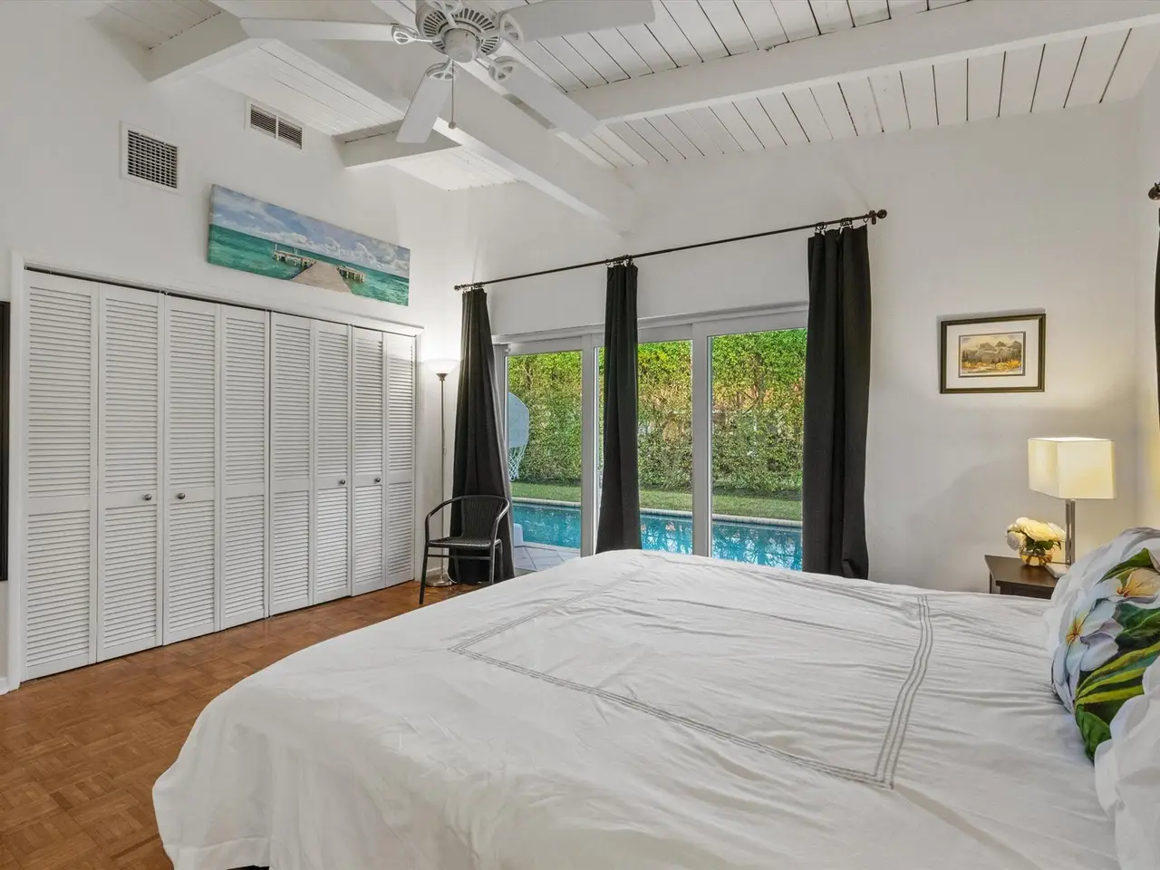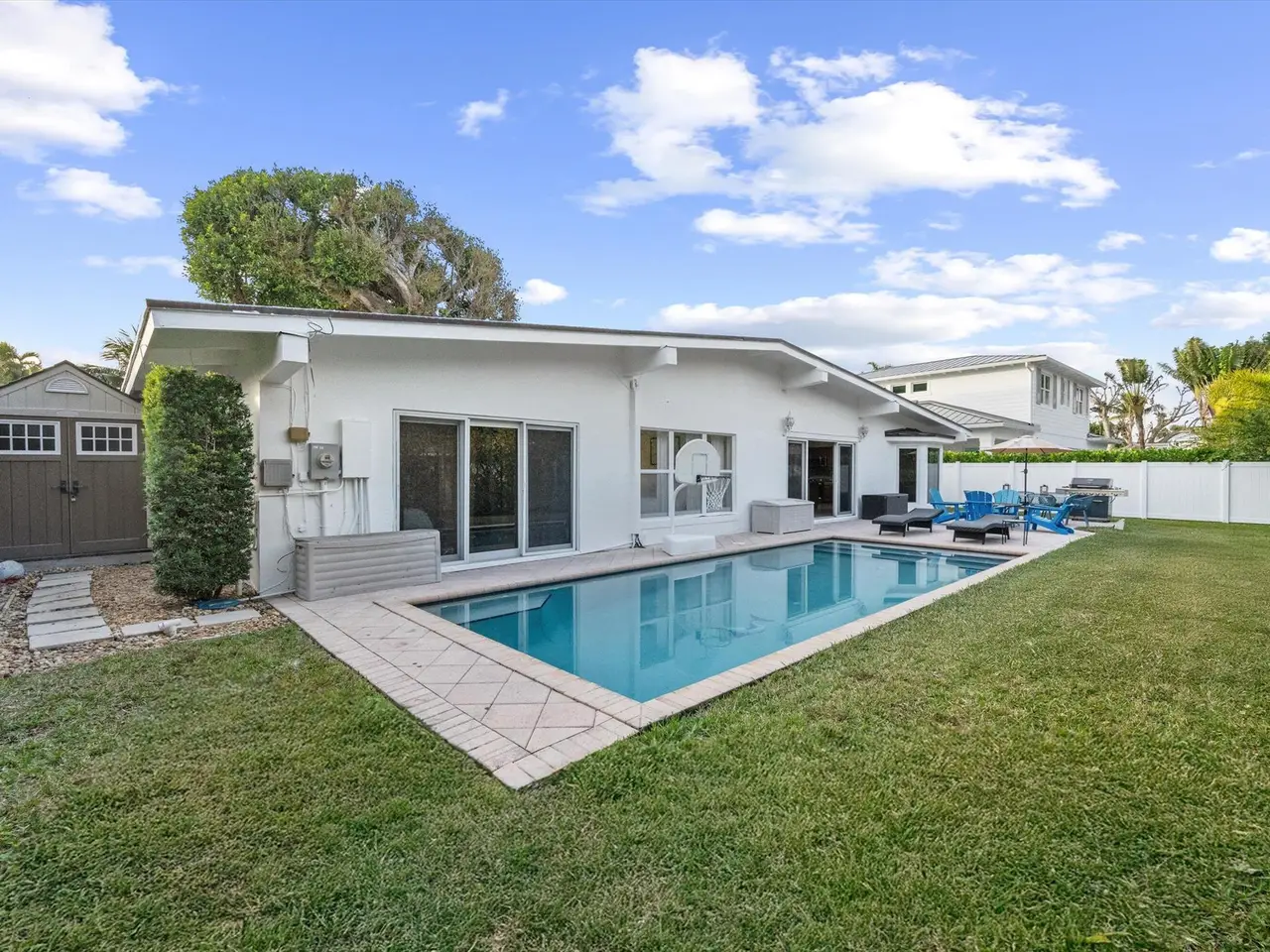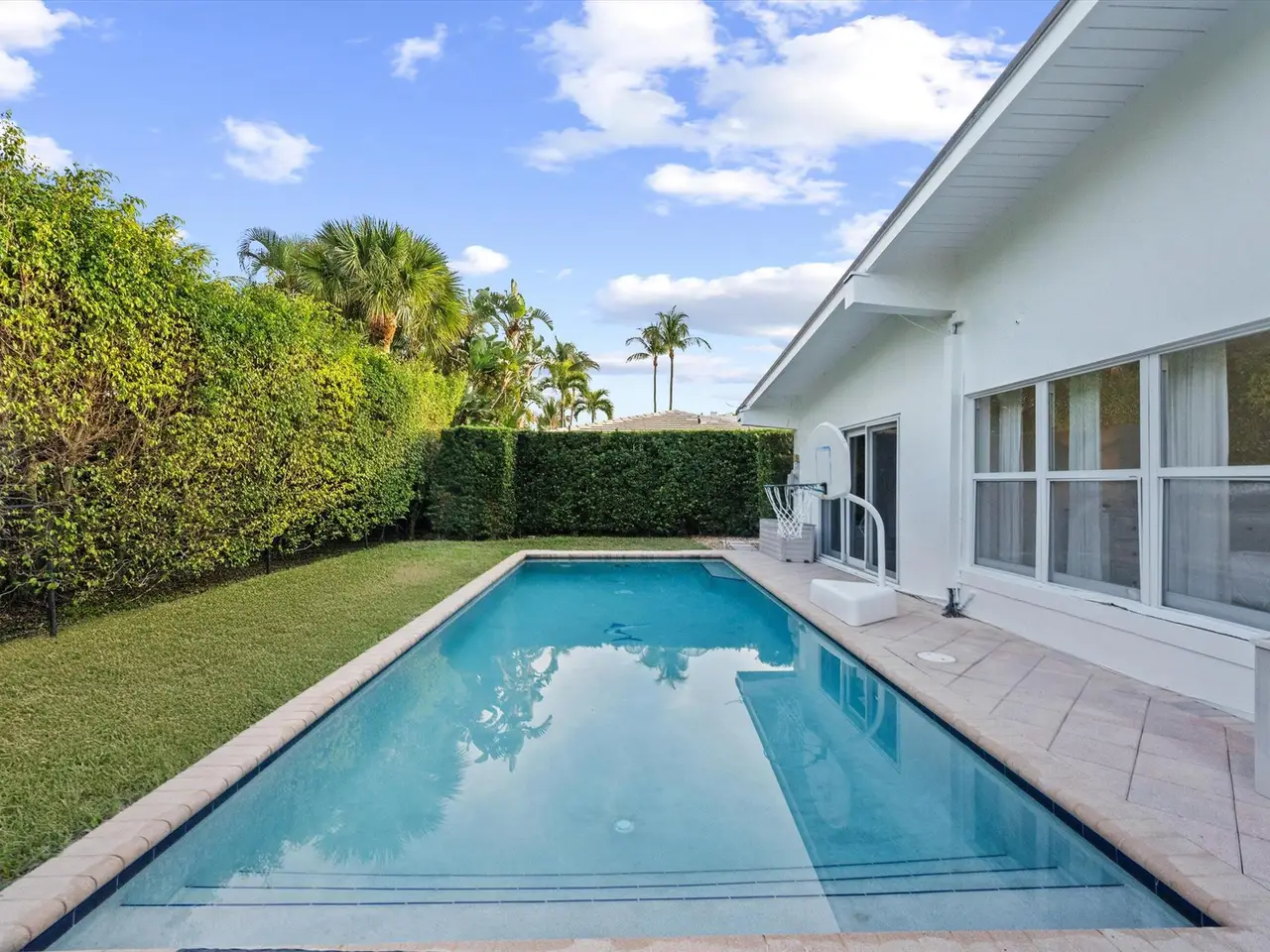 Just steps from the private, secured beaches of Jupiter Inlet Colony, this one-level Mid-Century coastal retreat sits on a prime interior lot, offering both charm and opportunity. Fully furnished and turnkey, this CBS-constructed home features 3 bedrooms, 2 baths, and an open floor plan where the kitchen seamlessly connects to the dining and living areas. With soaring volume ceilings, exposed beams, and all-impact windows and doors, the home is designed for both style and security. Outside, a lushly landscaped backyard oasis awaits, complete with a private pool enveloped by greenery. Offered at land value and sold as-is. This property presents a rare chance to build new or renovated in one of the most coveted beachside communities.