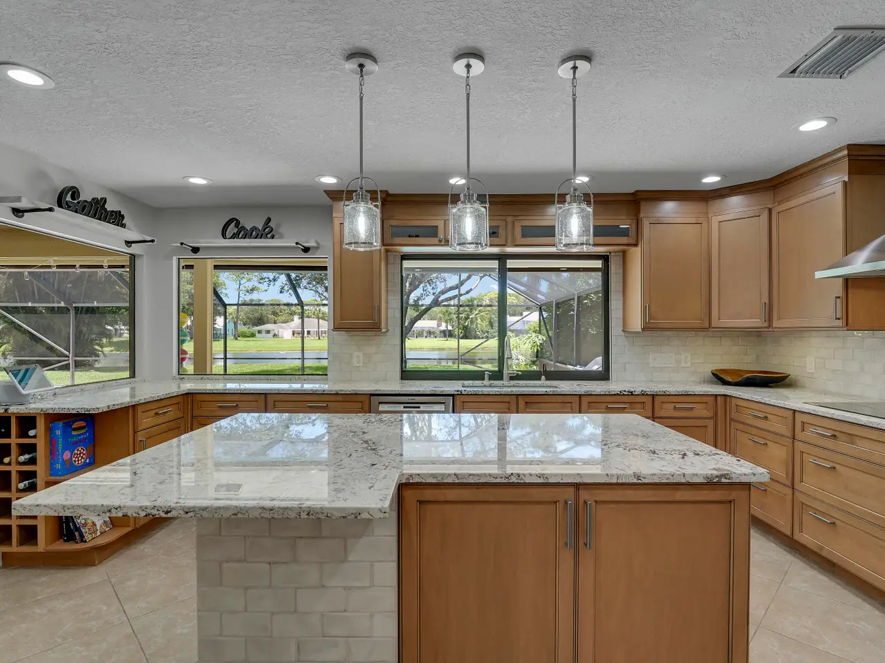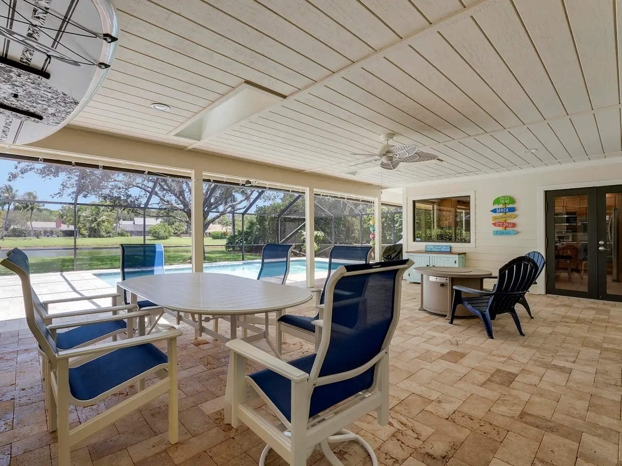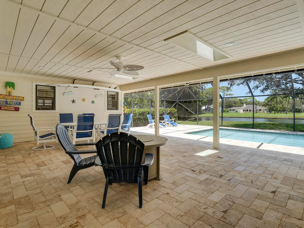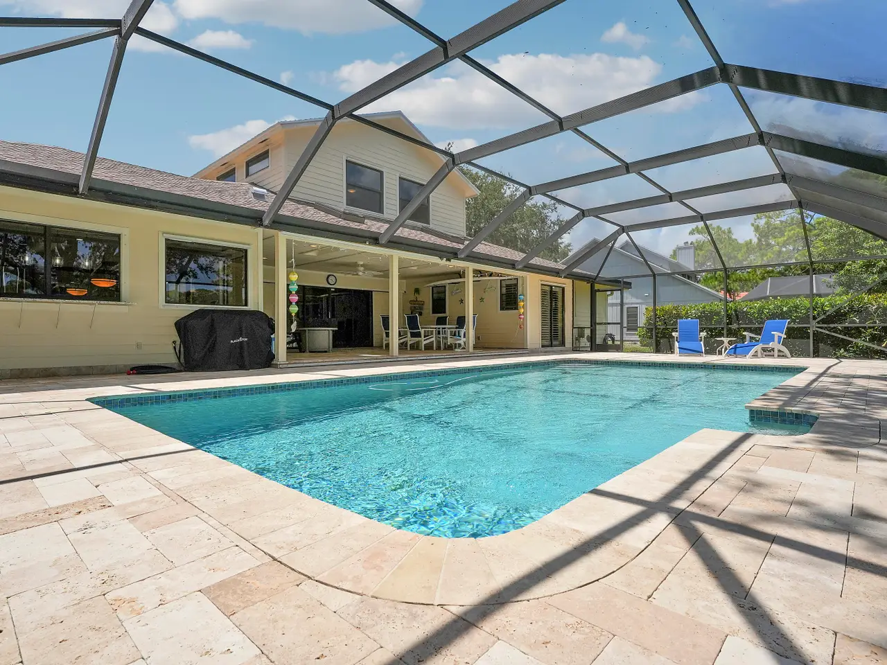 Lakefront Living in the Heart of Jupiter. Welcome to this well appointed 4 bedroom, 2-bath home (4th bedroom is a versatile loft), offering nearly 2,500 square feet of open-concept living on a half-acre lakefront lot. Soaring ceilings and abundant natural light create an airy, inviting atmosphere throughout. The spacious kitchen is a chef's dream, featuring a large island with granite countertops, newer stainless-steel appliances including a double wall oven -- perfect for entertaining. The split-bedroom floor plan ensures privacy, with generously sized rooms and thoughtful design. Step outside to your private oasis: a screened-in pool with glass tile accents, a new saltwater system, and light pavers that surrounds the pool and extends into the covered patio with custom wood paneled ceiling