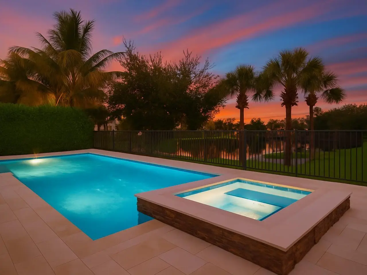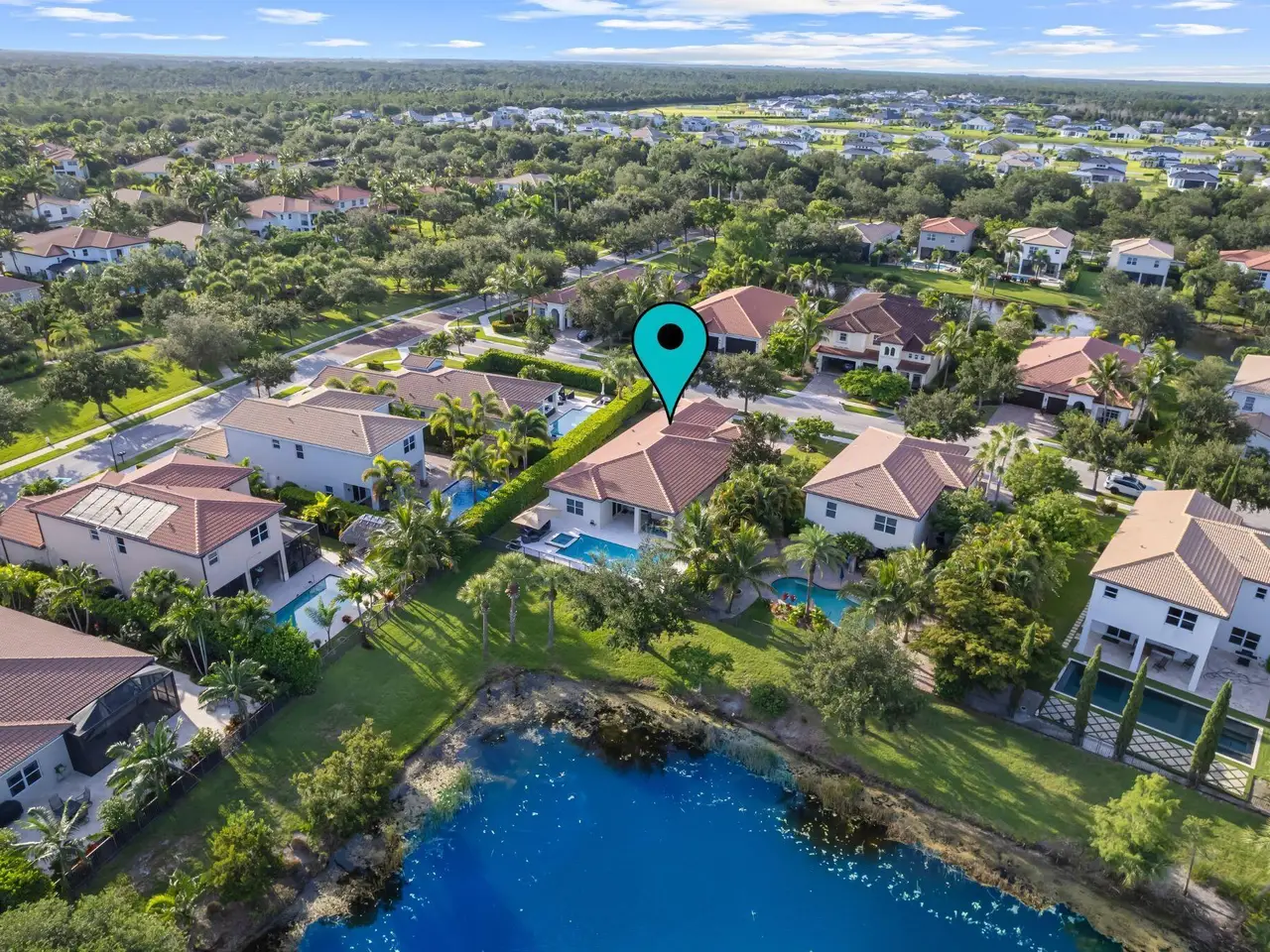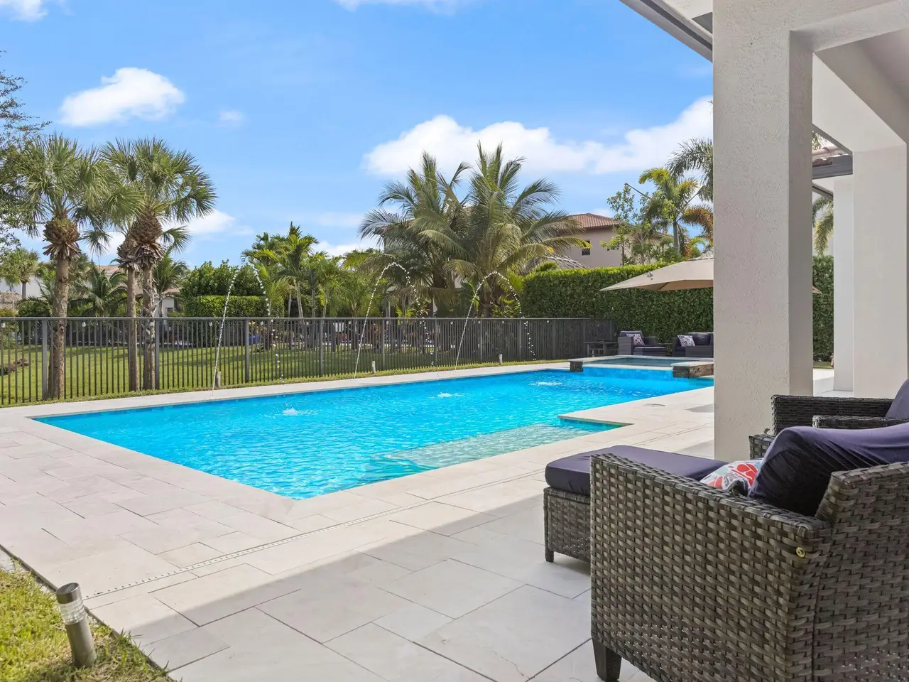 Located in the highly desirable gated community of Rialto, this beautifully upgraded 4 bedroom, 2.5 bath home offers a perfect blend of comfort, style, and functionality - all overlooking a serene water view! The backyard is a true retreat, featuring a 32' x 14' saltwater, heated pool and 7' x 8' spa with waterfall spillover, sun shelf, deck jets, deep-end bench seating, and jets on both top and bottom. Built in 2022 by CSE Paving of Florida, Inc., the pool area is finished with elegant sandblasted marble decking in a French pattern and includes Aqualink smartphone automation.