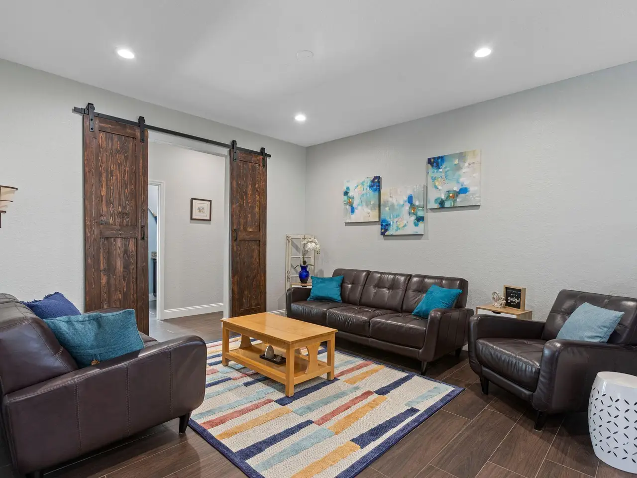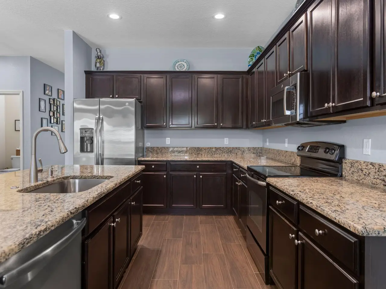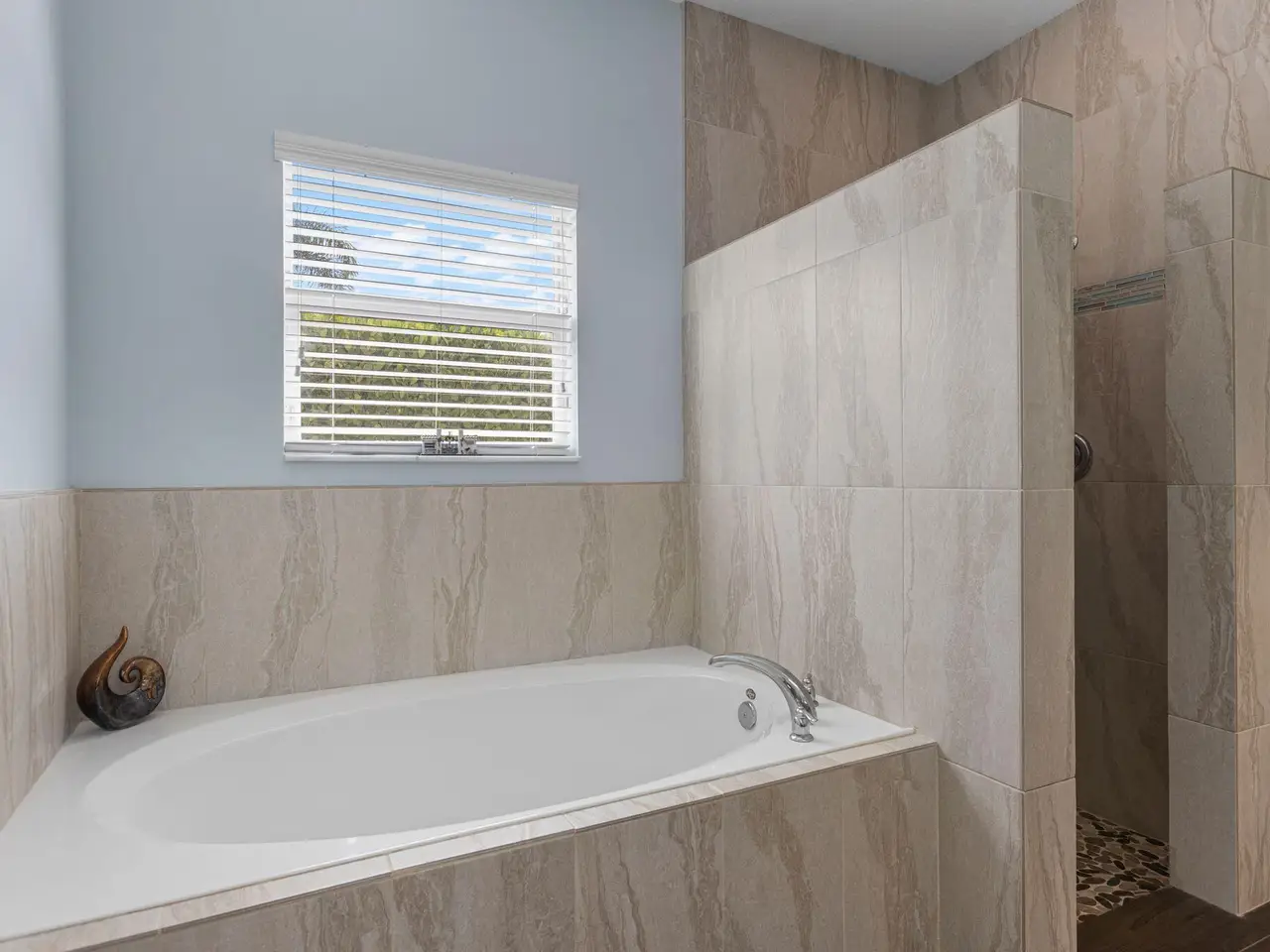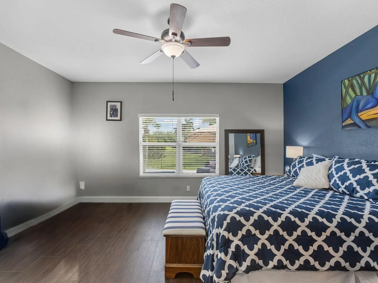 Located in the highly desirable gated community of Rialto, this beautifully upgraded 4 bedroom, 2.5 bath home offers a perfect blend of comfort, style, and functionality - all overlooking a serene water view! The backyard is a true retreat, featuring a 32' x 14' saltwater, heated pool and 7' x 8' spa with waterfall spillover, sun shelf, deck jets, deep-end bench seating, and jets on both top and bottom. Built in 2022 by CSE Paving of Florida, Inc., the pool area is finished with elegant sandblasted marble decking in a French pattern and includes Aqualink smartphone automation.