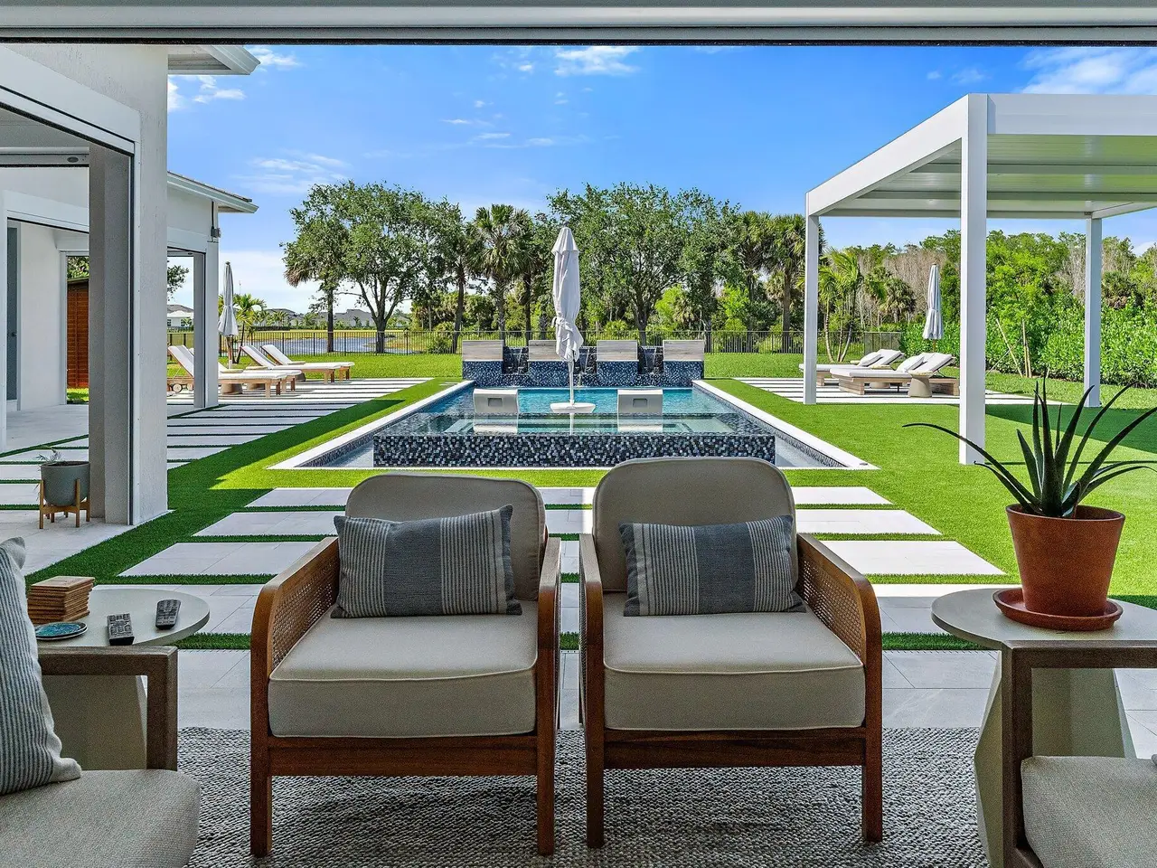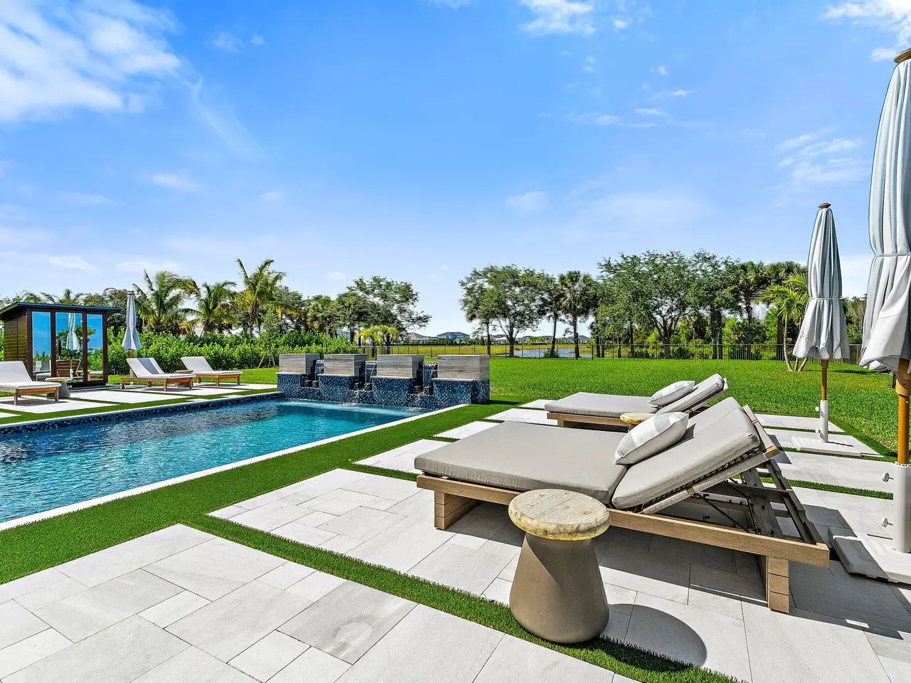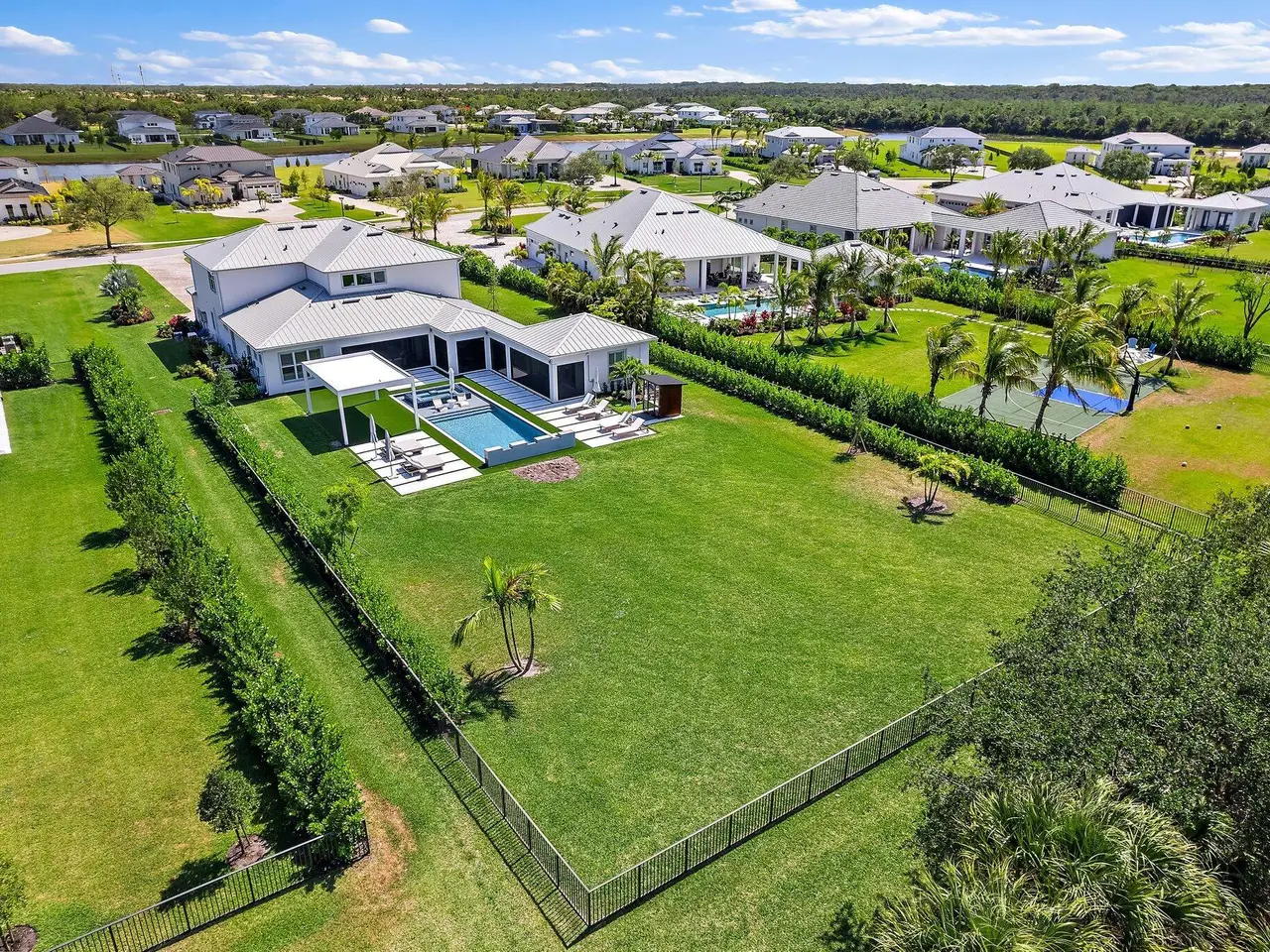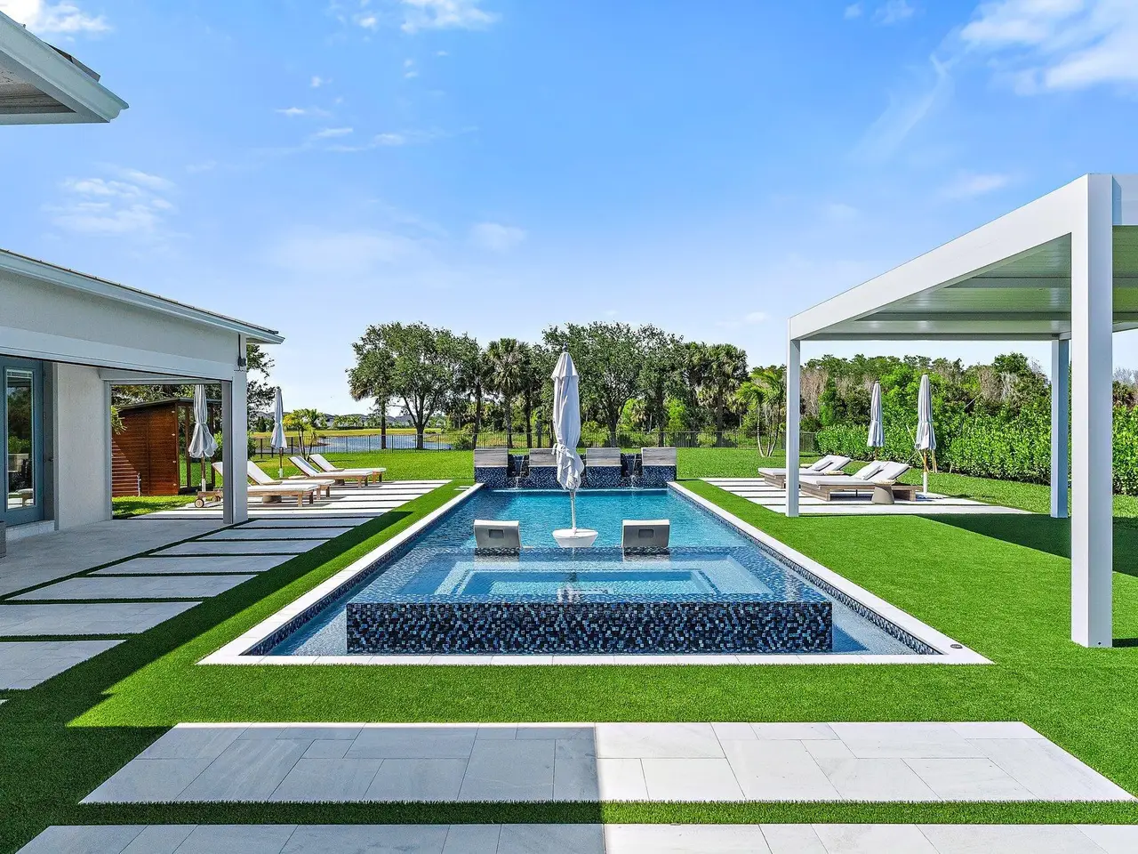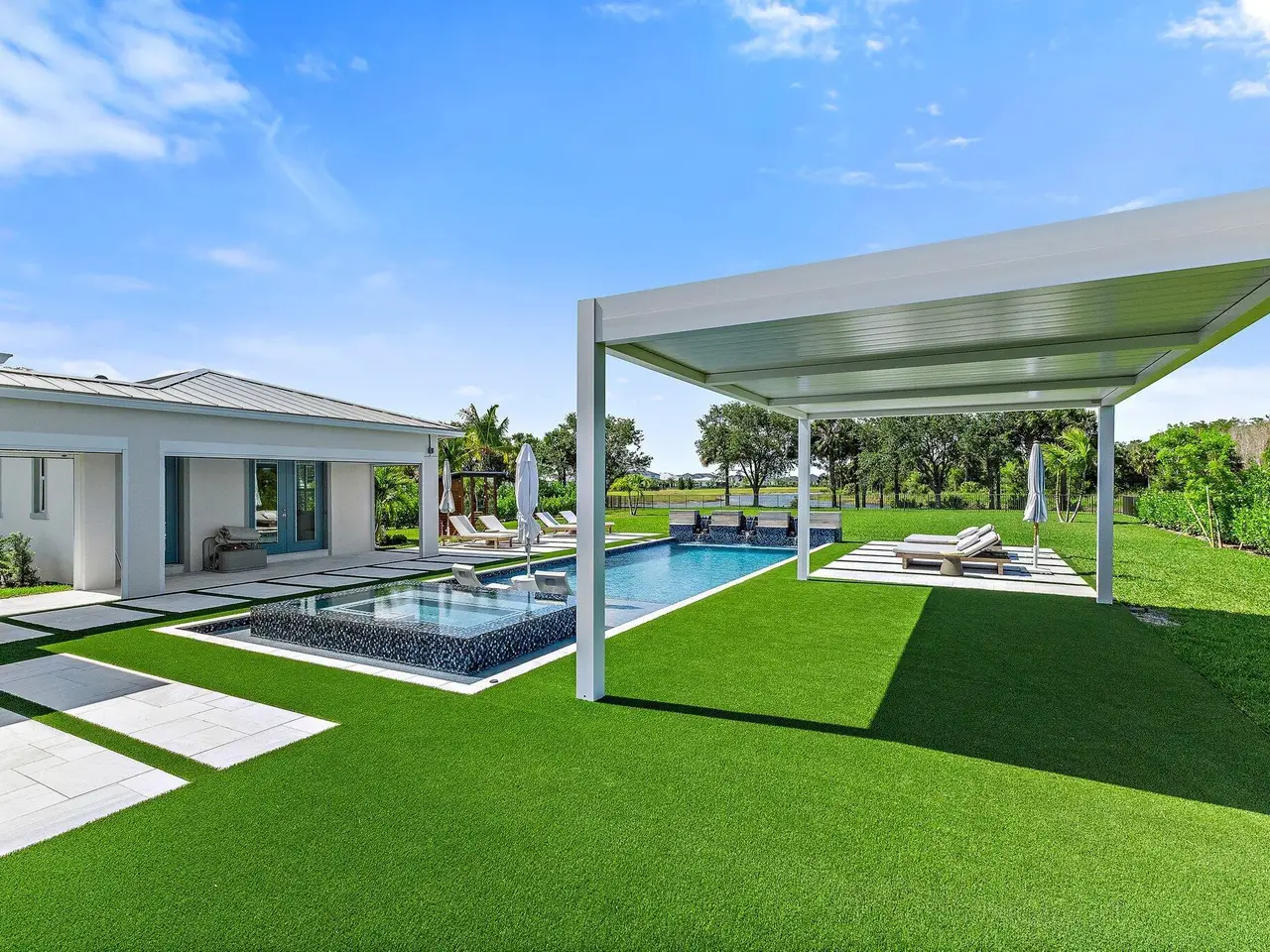 Enjoy the best of Bridgewater in this expanded ''Livingston'' model home with long water views. This seven bedroom home, the largest model offered in Bridgewater, with an office and home theater, creates multiple options of useful space with the finest in luxury appointments. The first floor has the primary suite with bath, one guest bedroom with bath, and an office in the main house, powder room, 4 car garage, and a one bedroom Casita with full bath just off the kitchen. The second floor has four additional bedrooms, a loft, media room, and three full baths. The backyard has special features like artificial turf, electric screens, a summer kitchen, pool with spa, sauna, and best of all, a custom pergola with a louvered ceiling that has slats that electronically open and close.