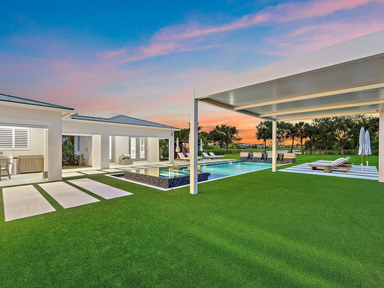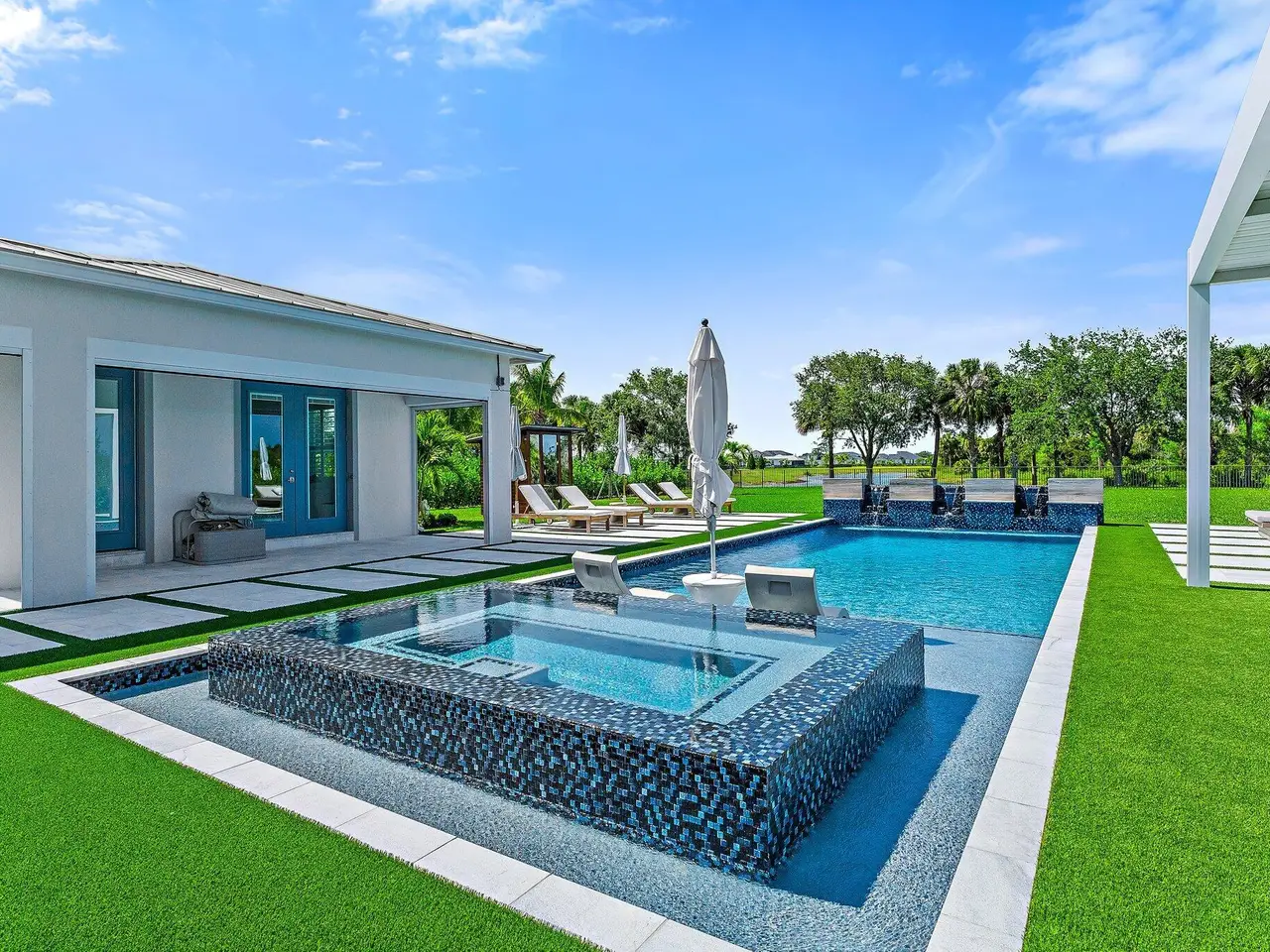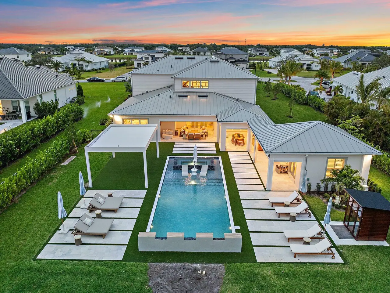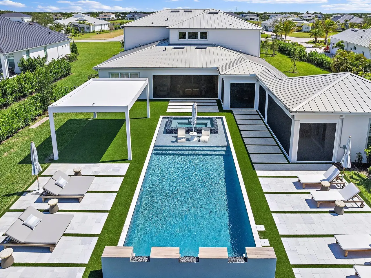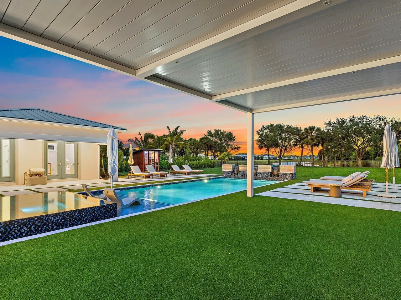 Enjoy the best of Bridgewater in this expanded ''Livingston'' model home with long water views. This seven bedroom home, the largest model offered in Bridgewater, with an office and home theater, creates multiple options of useful space with the finest in luxury appointments. The first floor has the primary suite with bath, one guest bedroom with bath, and an office in the main house, powder room, 4 car garage, and a one bedroom Casita with full bath just off the kitchen. The second floor has four additional bedrooms, a loft, media room, and three full baths. The backyard has special features like artificial turf, electric screens, a summer kitchen, pool with spa, sauna, and best of all, a custom pergola with a louvered ceiling that has slats that electronically open and close.