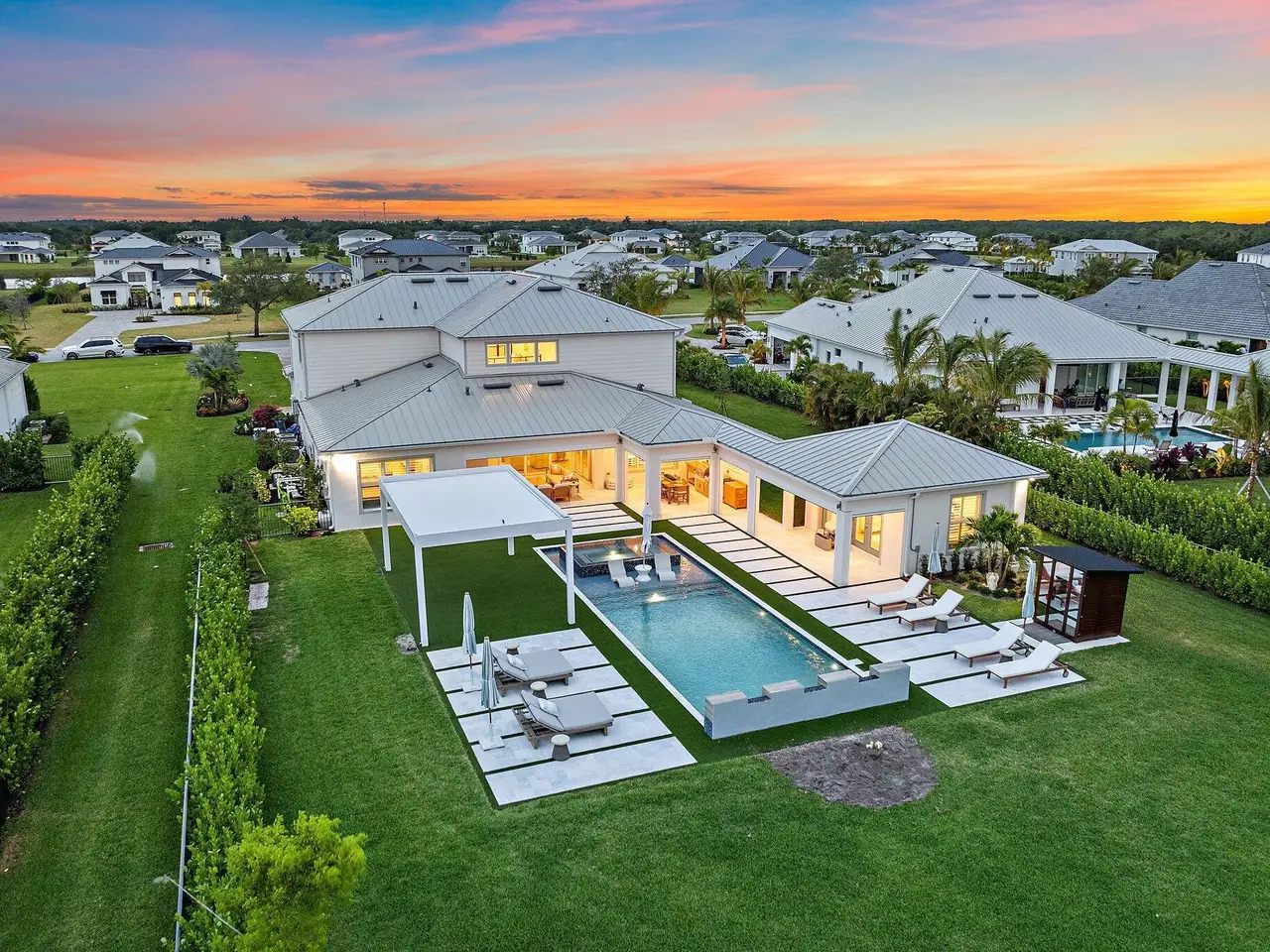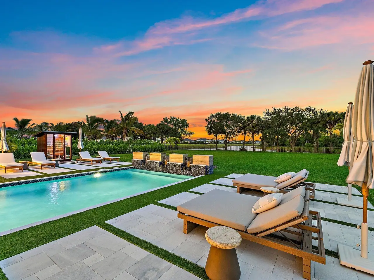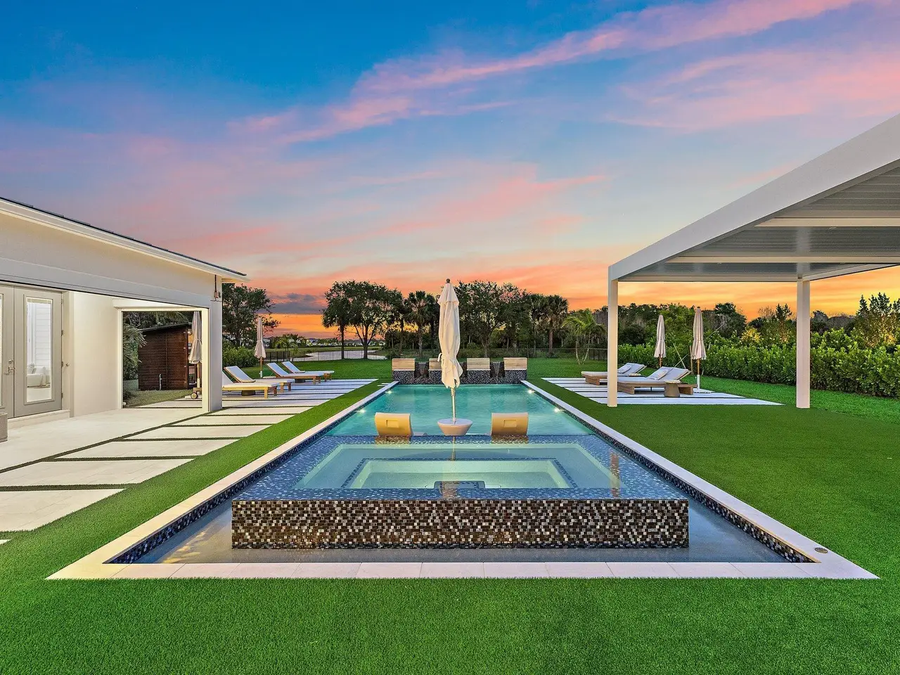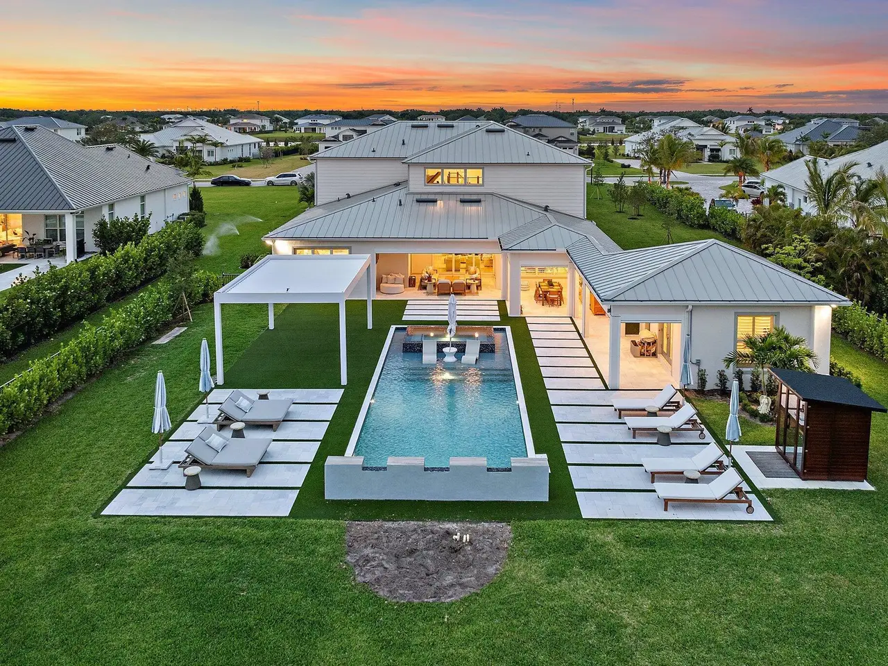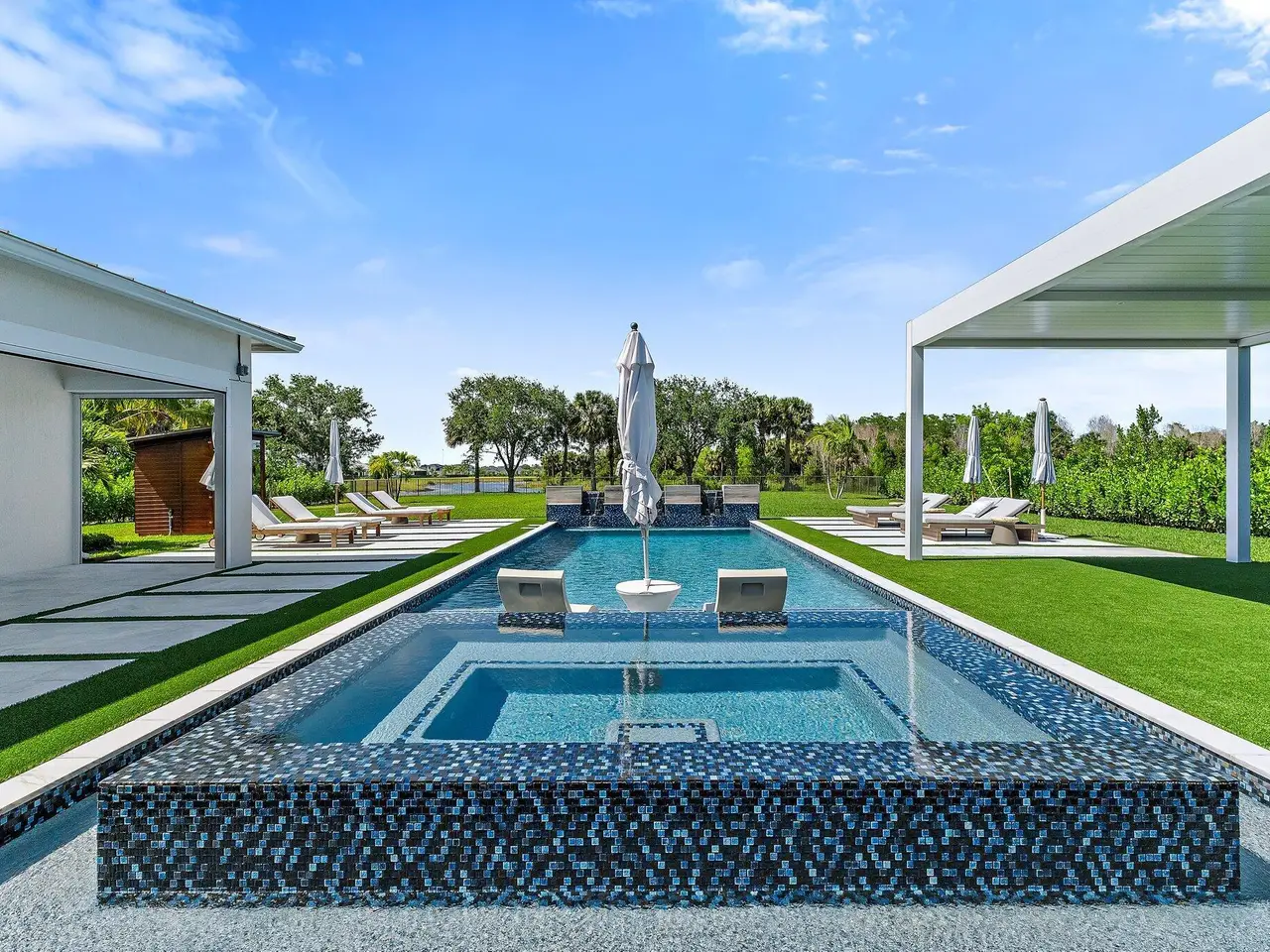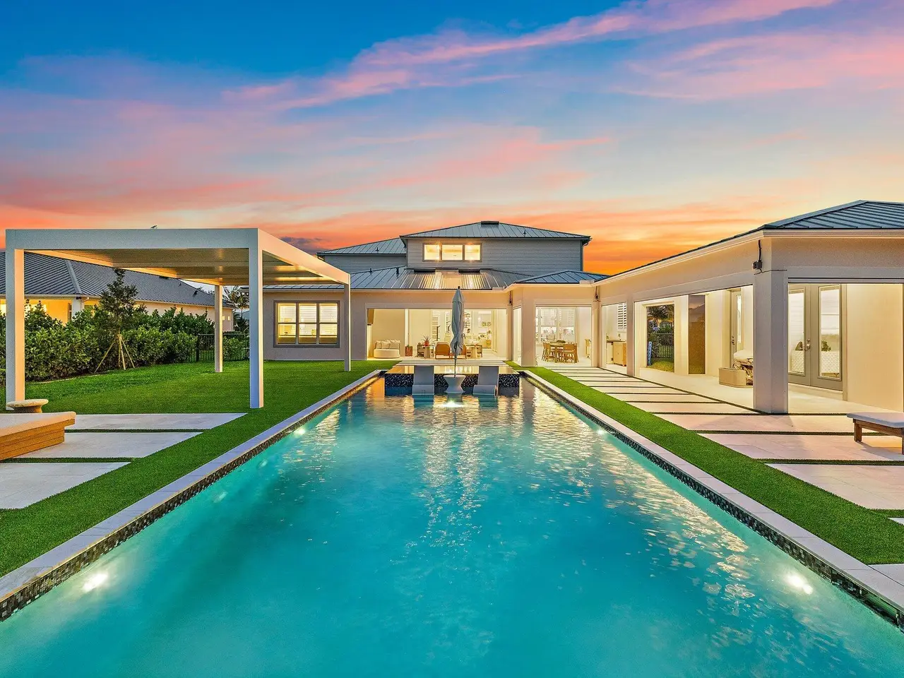 Enjoy the best of Bridgewater in this expanded ''Livingston'' model home with long water views. This seven bedroom home, the largest model offered in Bridgewater, with an office and home theater, creates multiple options of useful space with the finest in luxury appointments. The first floor has the primary suite with bath, one guest bedroom with bath, and an office in the main house, powder room, 4 car garage, and a one bedroom Casita with full bath just off the kitchen. The second floor has four additional bedrooms, a loft, media room, and three full baths. The backyard has special features like artificial turf, electric screens, a summer kitchen, pool with spa, sauna, and best of all, a custom pergola with a louvered ceiling that has slats that electronically open and close.