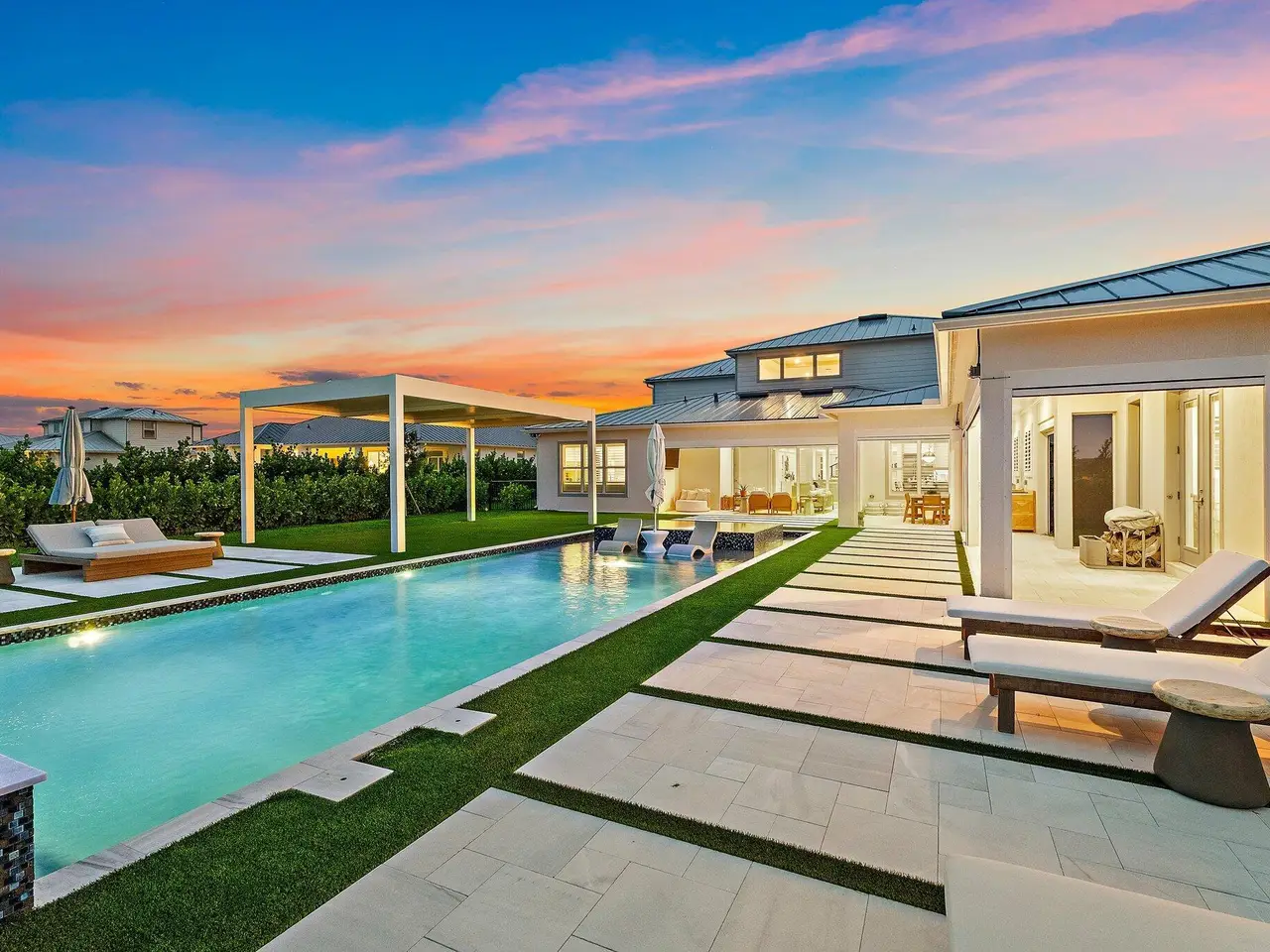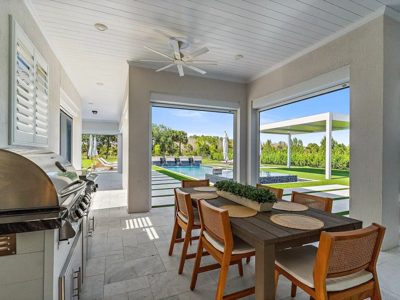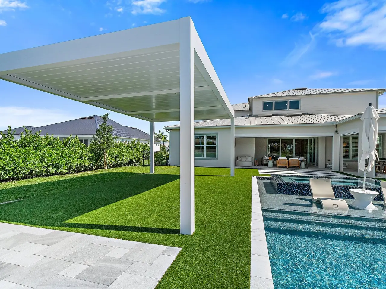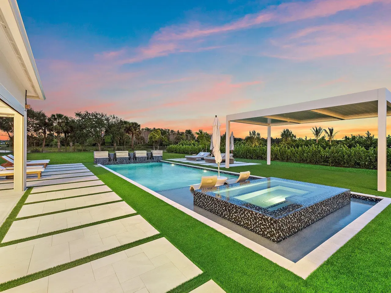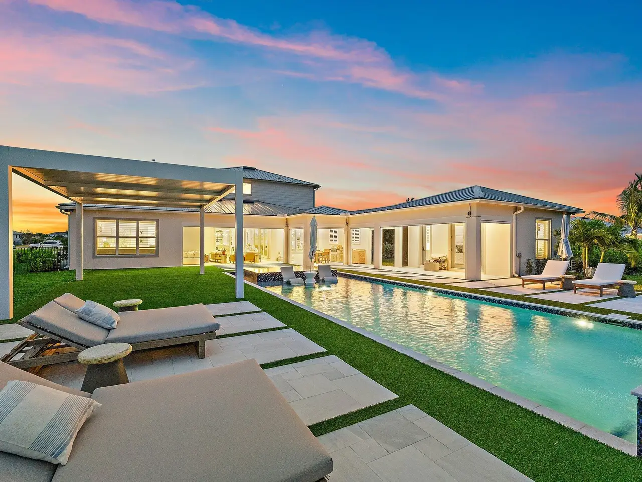 Enjoy the best of Bridgewater in this expanded ''Livingston'' model home with long water views. This seven bedroom home, the largest model offered in Bridgewater, with an office and home theater, creates multiple options of useful space with the finest in luxury appointments. The first floor has the primary suite with bath, one guest bedroom with bath, and an office in the main house, powder room, 4 car garage, and a one bedroom Casita with full bath just off the kitchen. The second floor has four additional bedrooms, a loft, media room, and three full baths. The backyard has special features like artificial turf, electric screens, a summer kitchen, pool with spa, sauna, and best of all, a custom pergola with a louvered ceiling that has slats that electronically open and close.