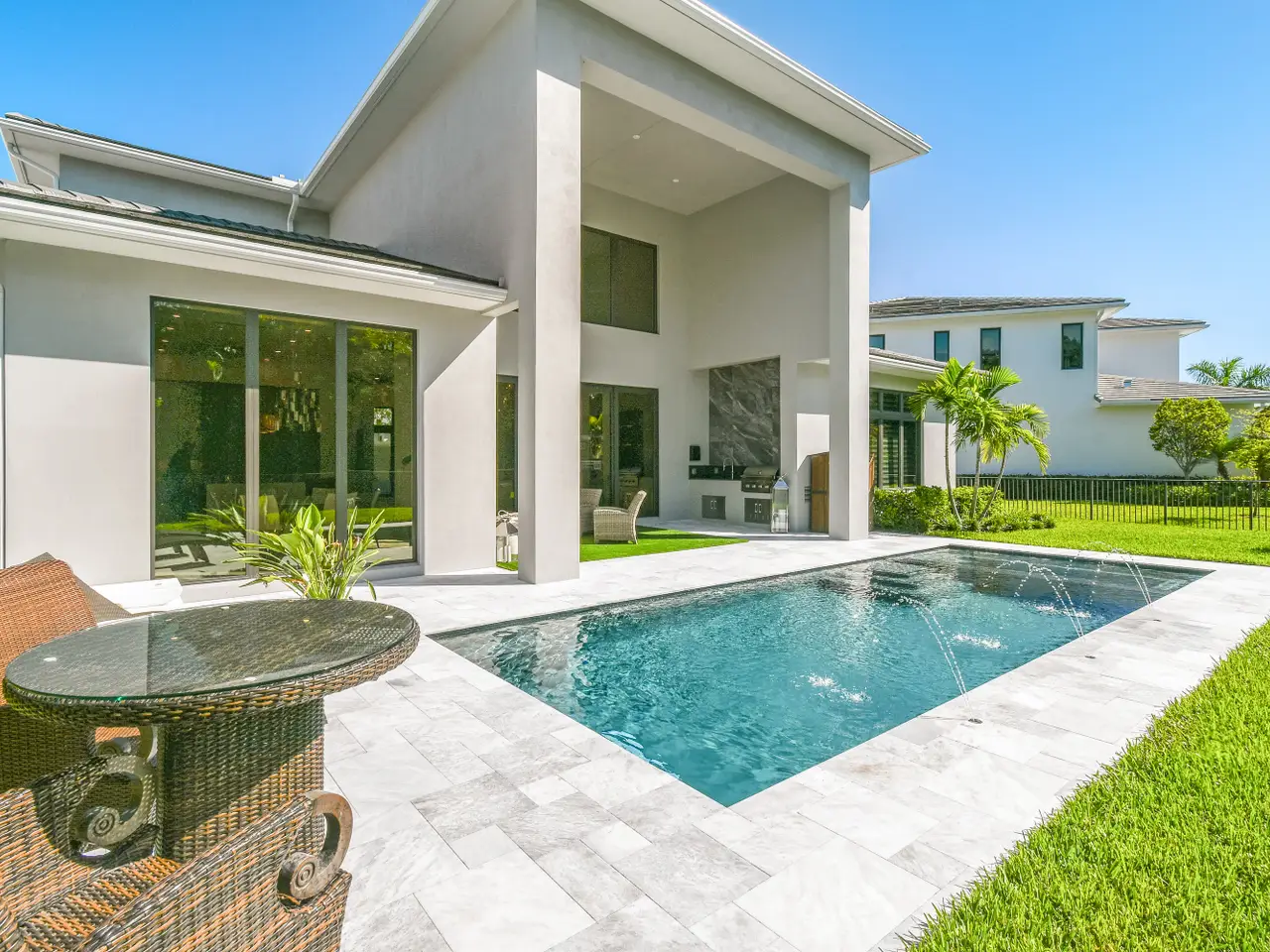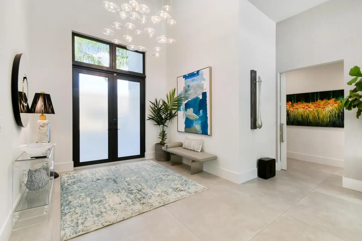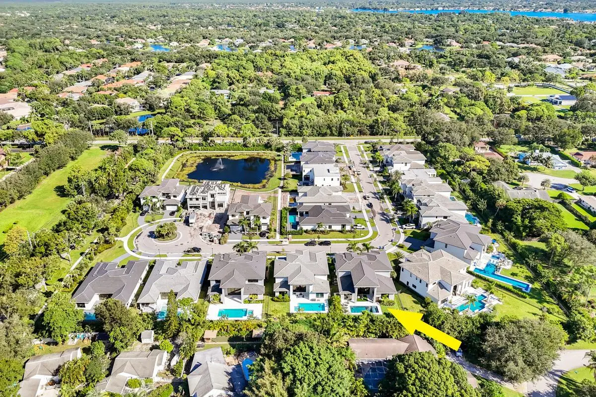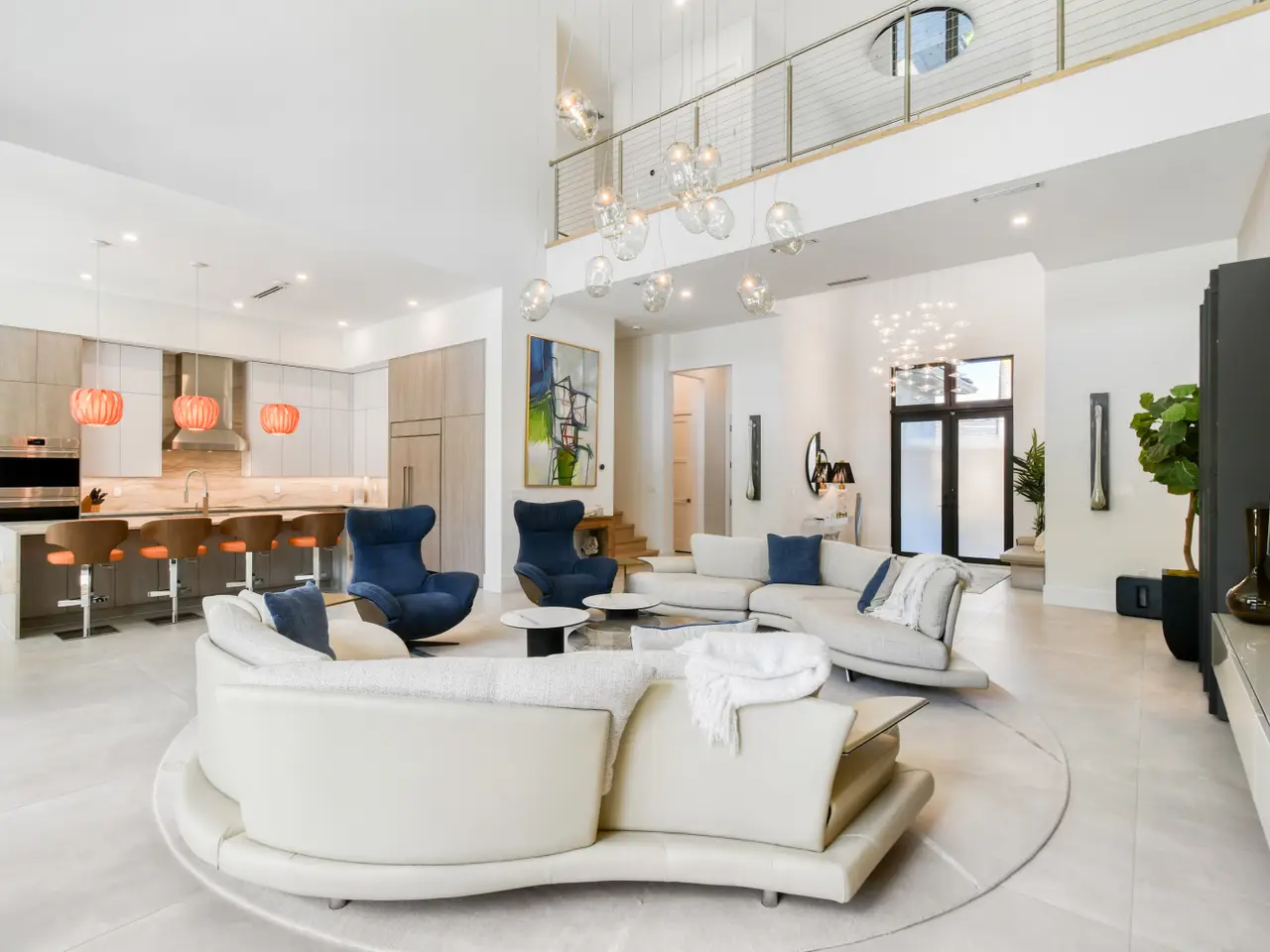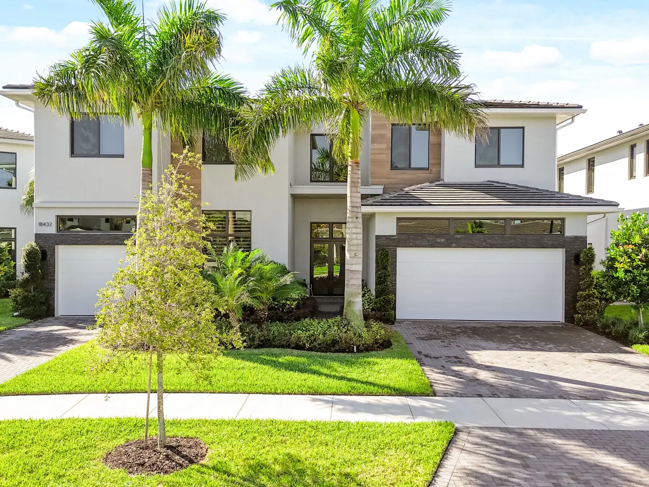 Step into elegance the moment you arrive at 18432 Symphony Court, where luxury and design meet in perfect harmony. This stunning Jupiter estate is the epitome of refined living, meticulously crafted with upscale finishes and timeless sophistication.From the grand entryway, you're greeted by imported designer chandeliers from Italy, suspended gracefully from soaring 25-foot ceilings. These radiant centerpieces illuminate a custom, backlit Italian wall unit with floating shelves, set against a stunning silk wallpaper backdrop, offering a dramatic yet elegant welcome.The open-concept layout is anchored by ravishing 48'' x 48'' porcelain tile flooring that flows throughout the main level.