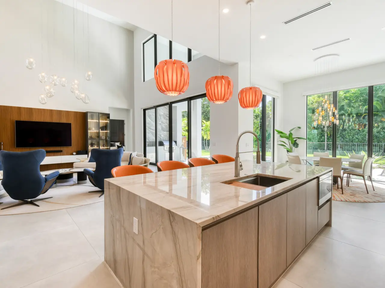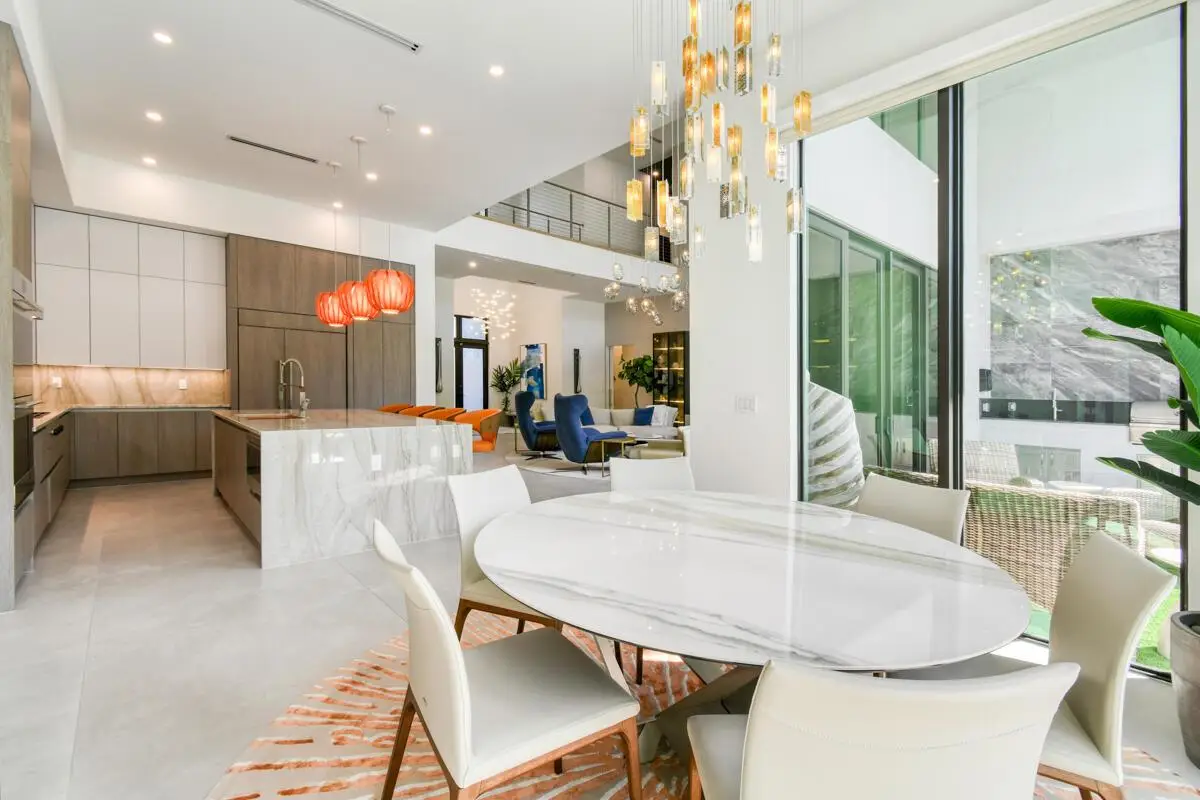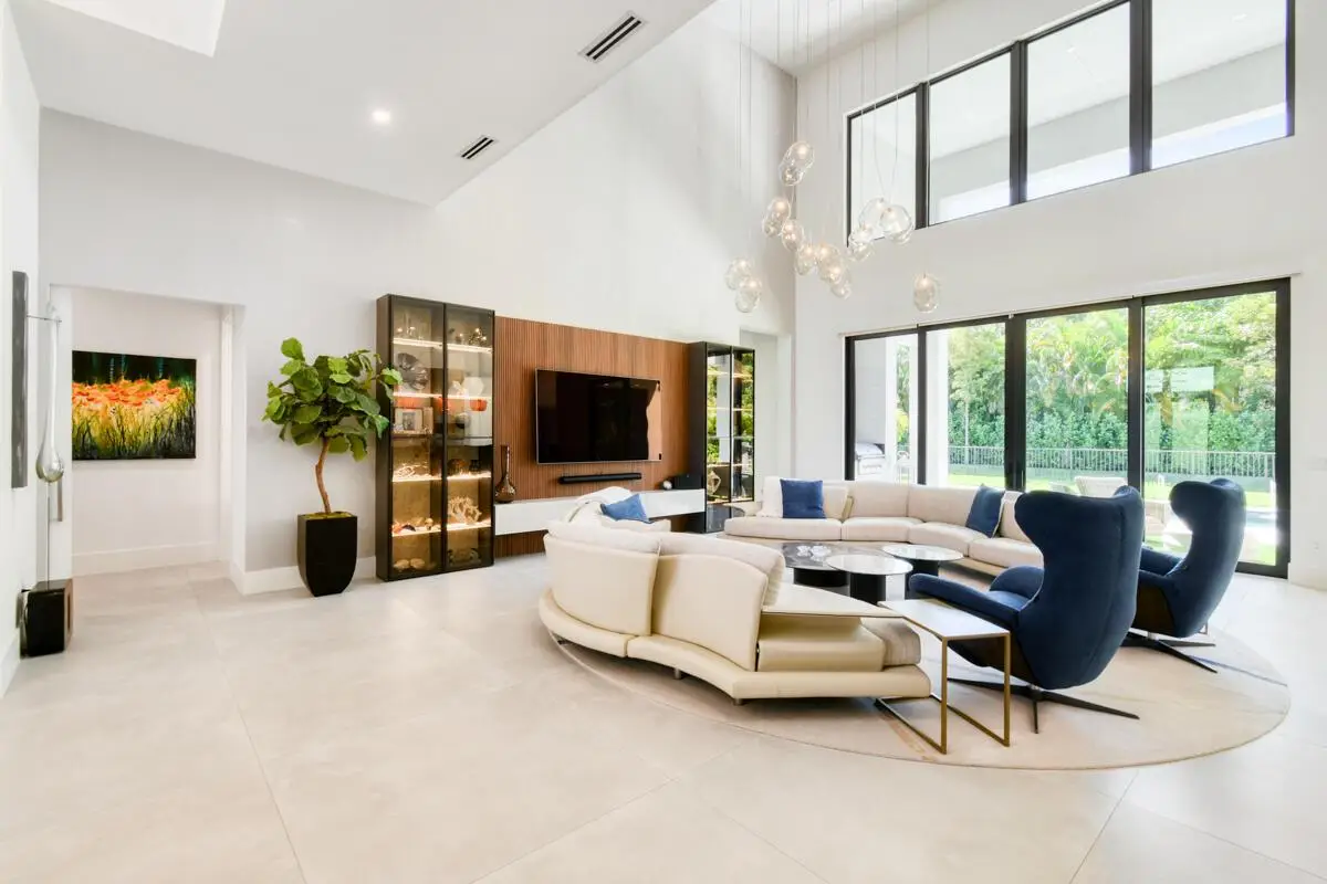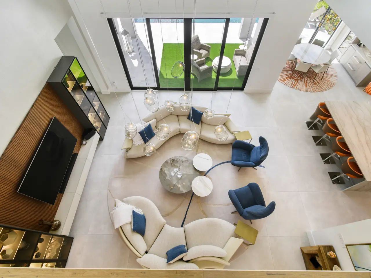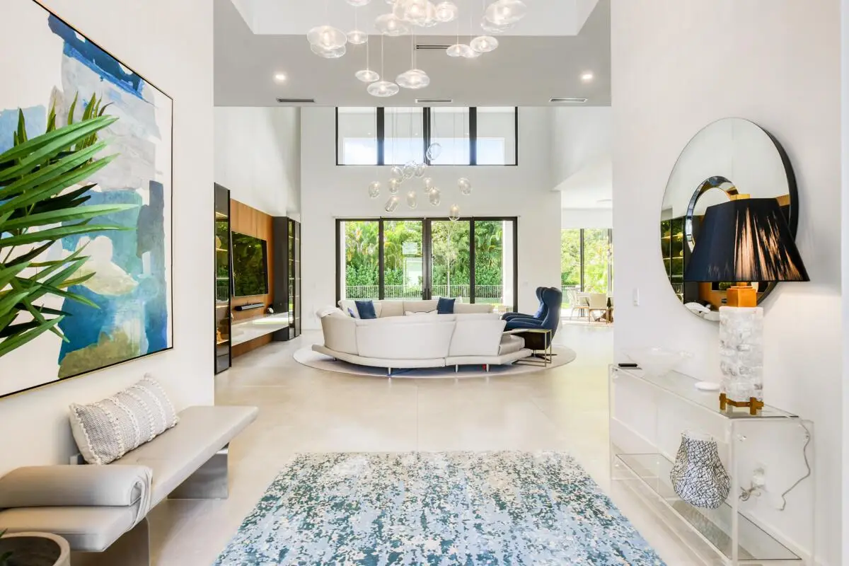 Step into elegance the moment you arrive at 18432 Symphony Court, where luxury and design meet in perfect harmony. This stunning Jupiter estate is the epitome of refined living, meticulously crafted with upscale finishes and timeless sophistication.From the grand entryway, you're greeted by imported designer chandeliers from Italy, suspended gracefully from soaring 25-foot ceilings. These radiant centerpieces illuminate a custom, backlit Italian wall unit with floating shelves, set against a stunning silk wallpaper backdrop, offering a dramatic yet elegant welcome.The open-concept layout is anchored by ravishing 48'' x 48'' porcelain tile flooring that flows throughout the main level.