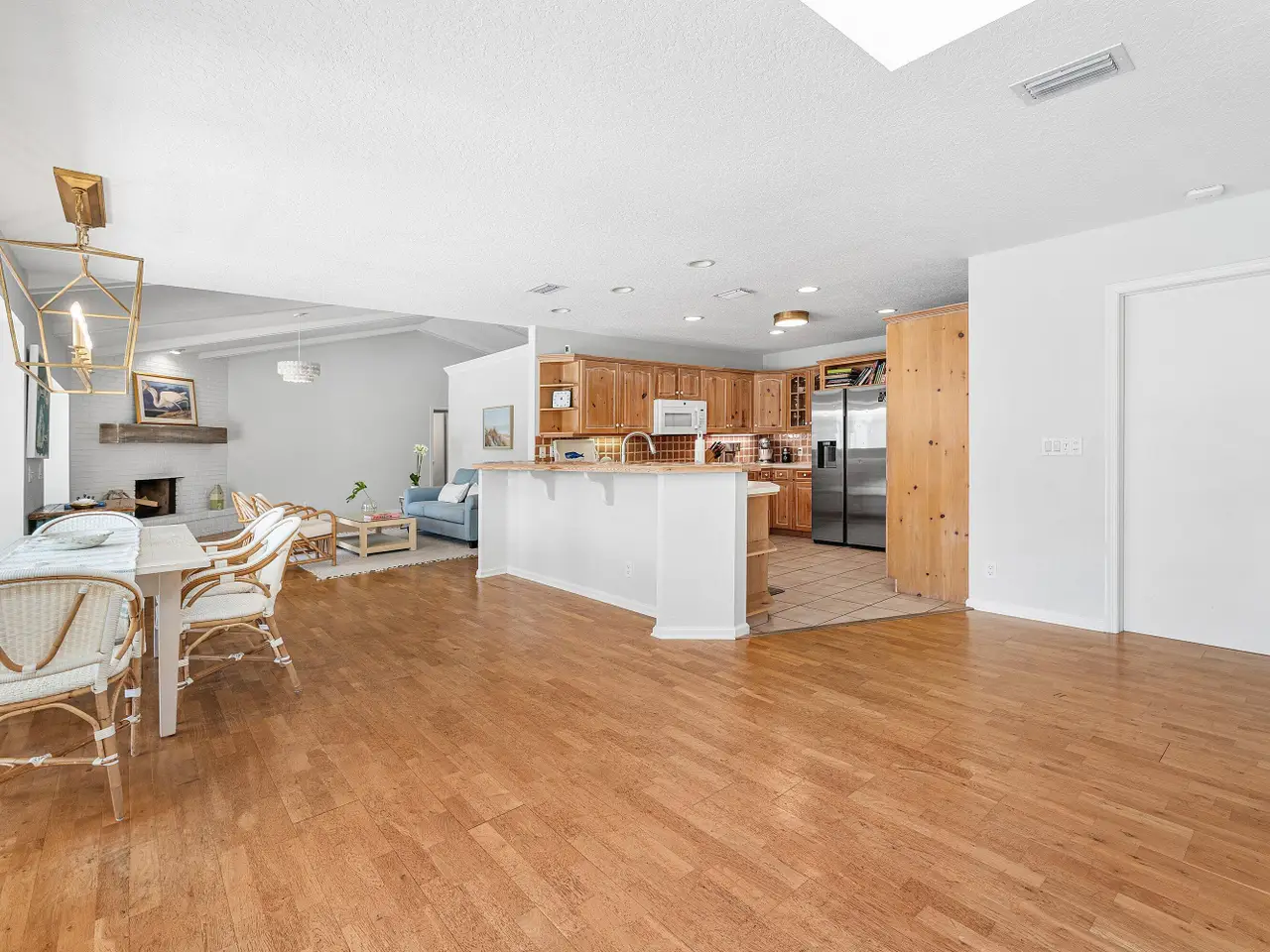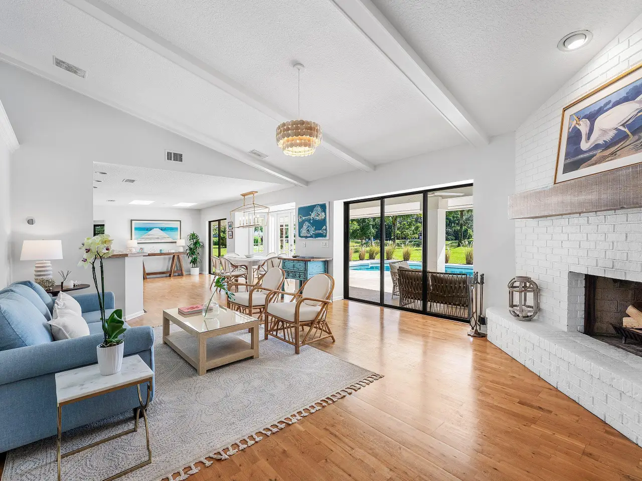 Charming 3-bedroom, 2-bathroom CBS home set on a sprawling half-acre lot with tranquil lake views and southern exposure! This home is surrounded by mature trees that have stood for decades, features an inviting pool, a two-car garage, an open floor plan, and a Springwell water softener and filtration system for pure, clean water throughout. Nestled in the picturesque Whispering Trails community, enveloped by vibrant landscaping. Highlights include an extended driveway, a spacious primary suite, soaring vaulted ceilings with exposed beams, a central vacuum system, dual water heaters, and expansive living and family rooms anchored by a cozy fireplace. The large covered patio overlooks a beautiful inviting pool and serene lake, creating an ideal setting for entertaining. Low HOA fees