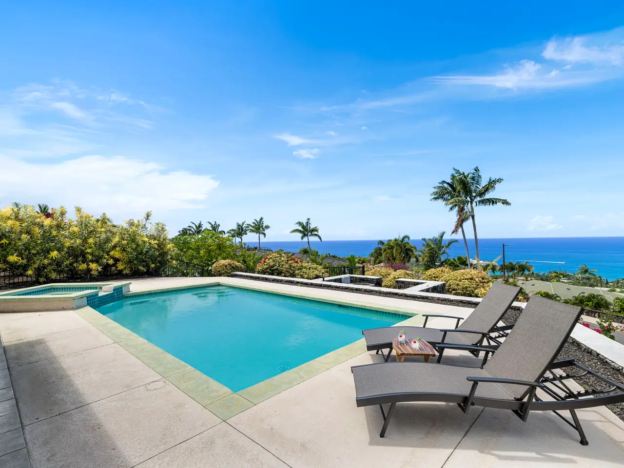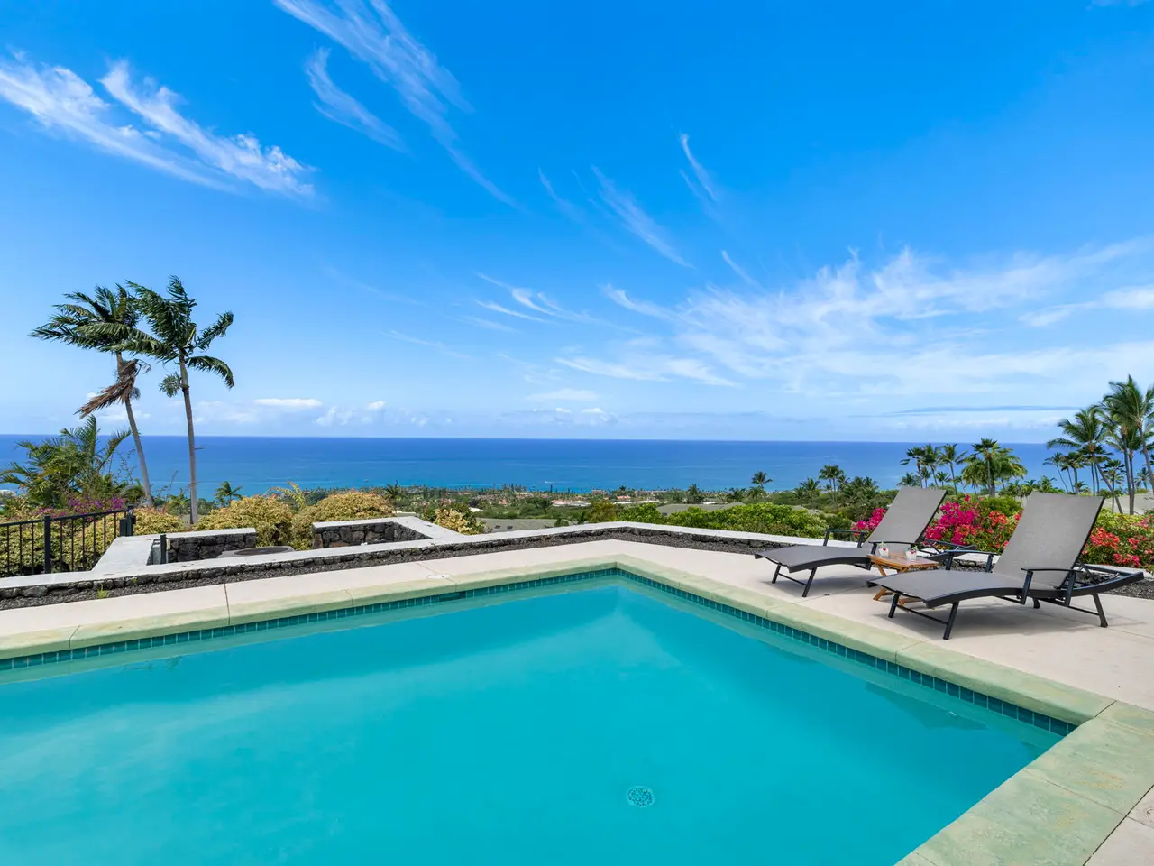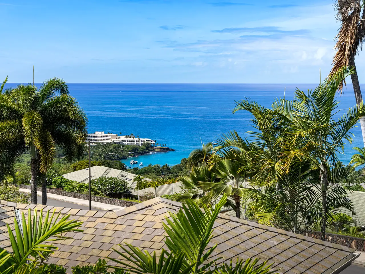 Elegant single-level luxury home in the prestigious Bayview Estates! This luxury home greets you with sweeping ocean, coastline, and Keauhou Bay views. The living room, kitchen, and the primary bedroom open into the huge coved lanai, perfect for watching Kona's gorgeous sunsets and seasonal whale watching. Notable features of this beautiful home include: Hardwood floors in the living room and hallway. Travertine tiles in bedrooms and baths. Central Air Conditioning. Granite countertops. Valted high ceiling in the living room. Pool/spa overlooking ocean views. Open floor plan. Fully furnished and turnkey. Beautifully landscaped. Fully owned Photovaltec. Located in a quiet cul-de-sac. Bayview Estates is a gated community close to shopping, golf, ocean activities and much more! The video of this property: https://hawaiian-virtual-tours.aryeo.com/videos/019965f0-8a38-73bd-81bd-5d8cbb120413