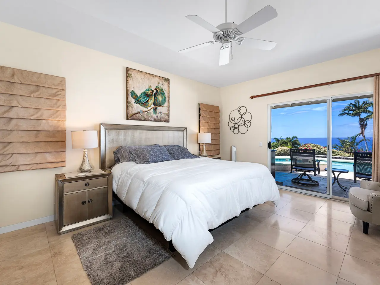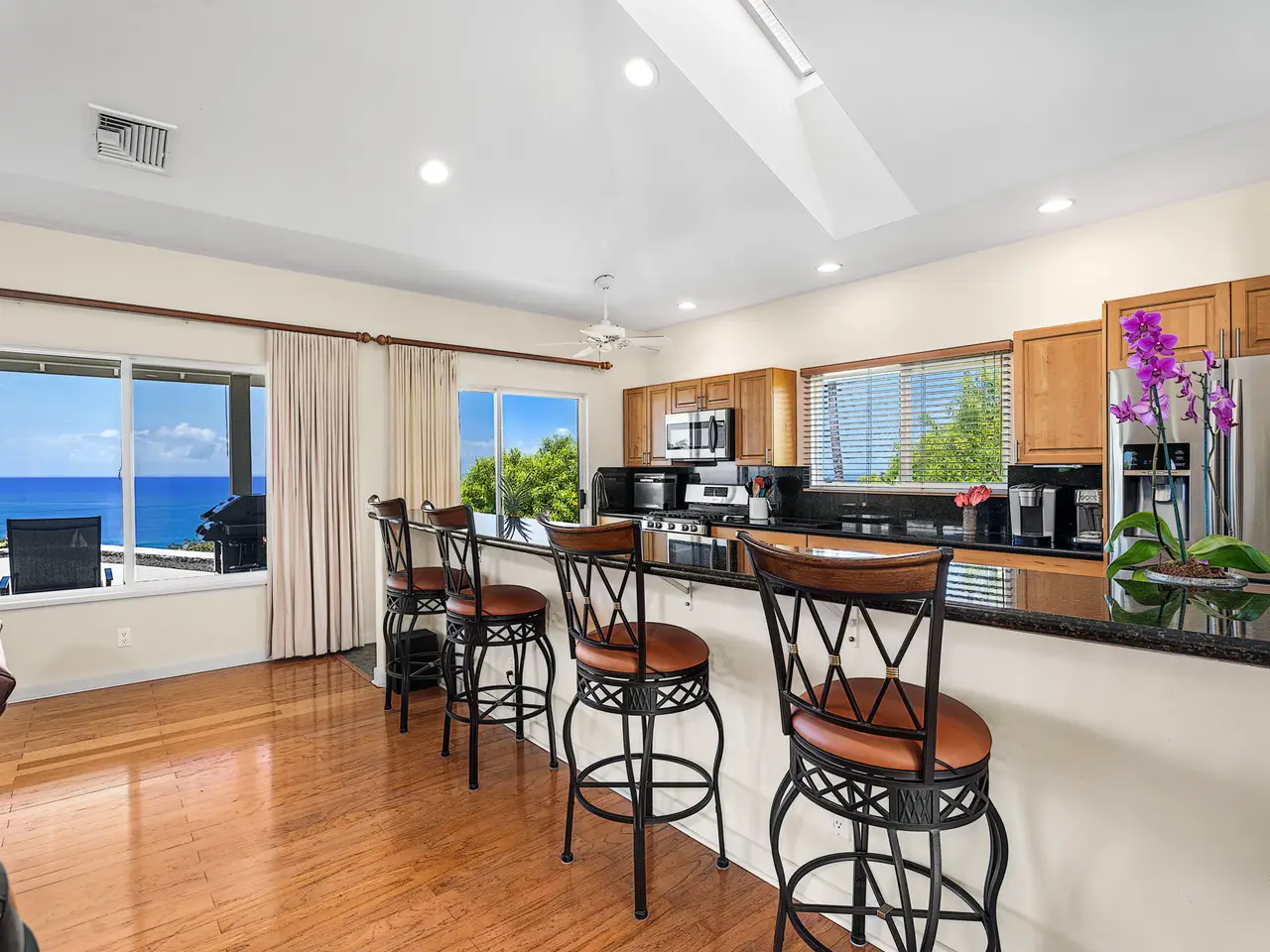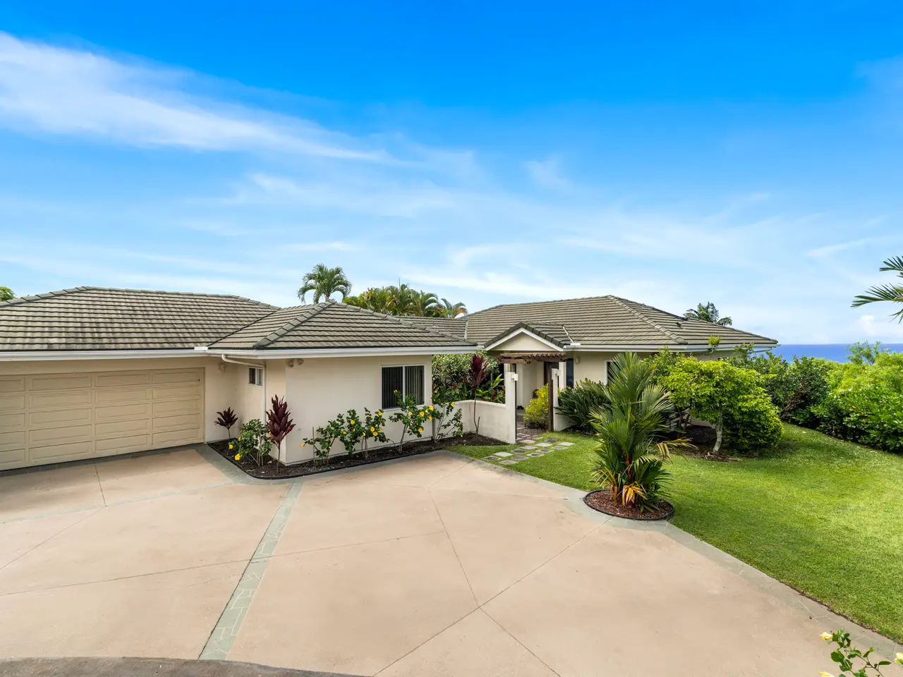 Elegant single-level luxury home in the prestigious Bayview Estates! This luxury home greets you with sweeping ocean, coastline, and Keauhou Bay views. The living room, kitchen, and the primary bedroom open into the huge coved lanai, perfect for watching Kona's gorgeous sunsets and seasonal whale watching. Notable features of this beautiful home include: Hardwood floors in the living room and hallway. Travertine tiles in bedrooms and baths. Central Air Conditioning. Granite countertops. Valted high ceiling in the living room. Pool/spa overlooking ocean views. Open floor plan. Fully furnished and turnkey. Beautifully landscaped. Fully owned Photovaltec. Located in a quiet cul-de-sac. Bayview Estates is a gated community close to shopping, golf, ocean activities and much more! The video of this property: https://hawaiian-virtual-tours.aryeo.com/videos/019965f0-8a38-73bd-81bd-5d8cbb120413