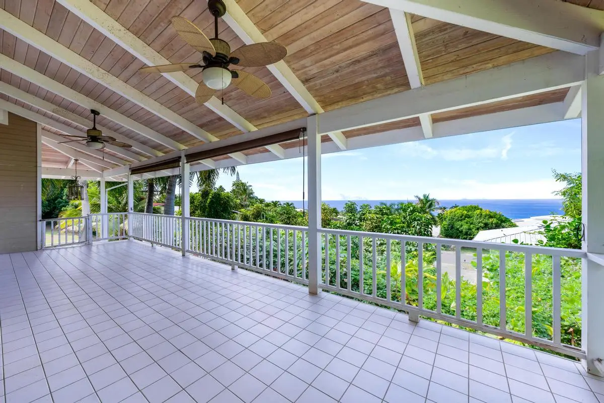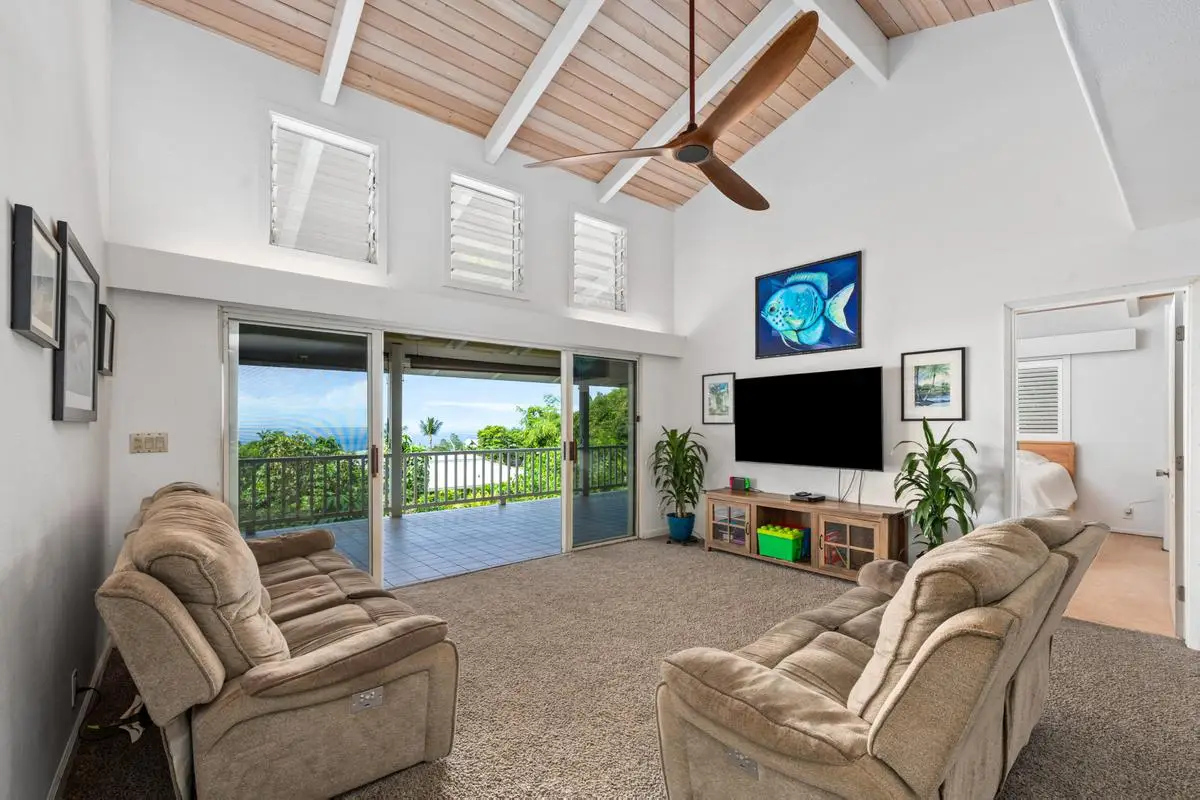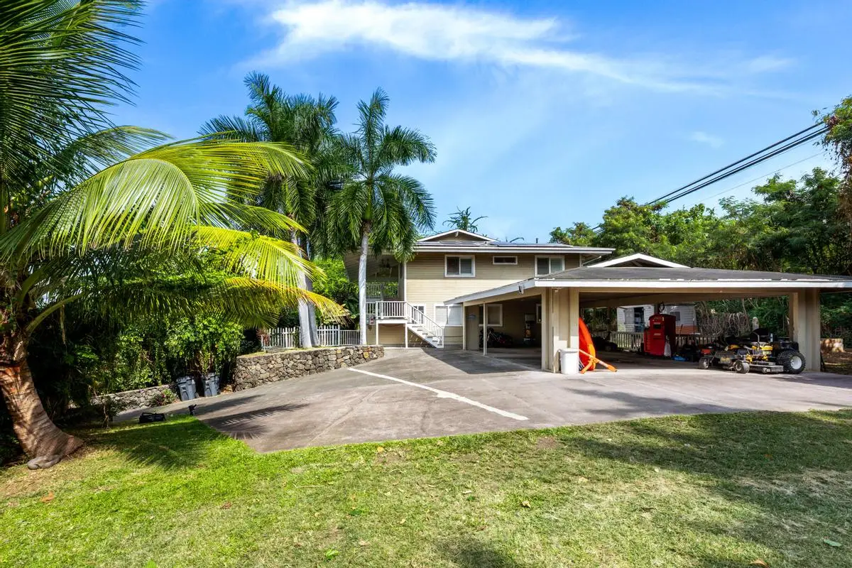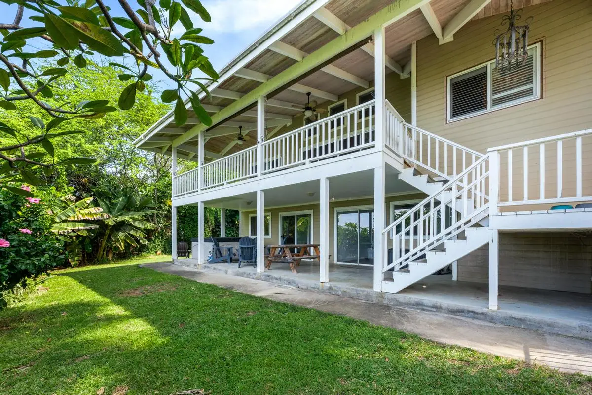 Spacious almost 2,300sf home on a private approximately half-acre flag lot with mature trees and a nice grassy fenced yard. Features two separate living areas with ocean views from both levels. Upstairs (3 bed/2 bath): Main home, Open-concept living with vaulted wood open-beam ceilings, granite kitchen counters, split floor plan with primary and guest rooms separated by living space and large lanai perfect for watching year round sunsets. Downstairs (2 bed/1 bath): Separate entrance, full kitchen (stove not included), washer/dryer, and lanai with hot tub and ocean views. Outdoor Features: Two expansive lanais, Fruiting Mangos, apple bananas, Lime, Samoan coconut… grassy yard, raised garden bed, fenced in back yard area and ample parking with an 864 sq ft carport and cement driveway. Energy Efficient with Owned, grid-tied solar system for very low electric bills. Perfect for multi-generational living or rental potential! Great location and Very low HOA fees in Komohana kai II of only $75/year. There is a Separate Tiny house on property and it is not included in the price but can be purchased separately.