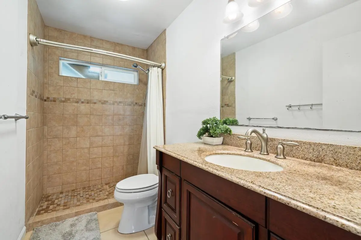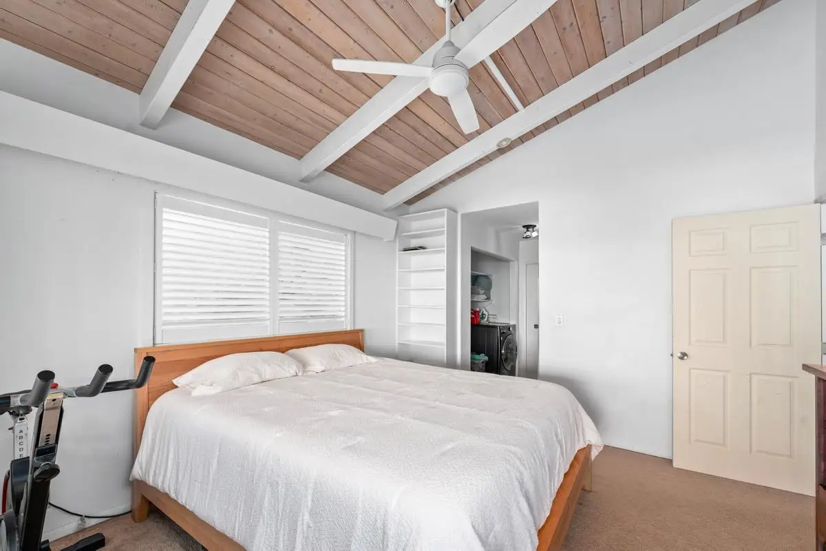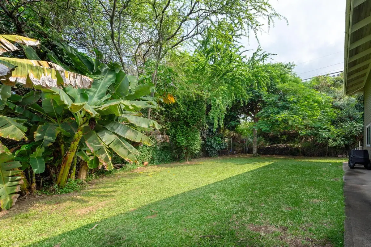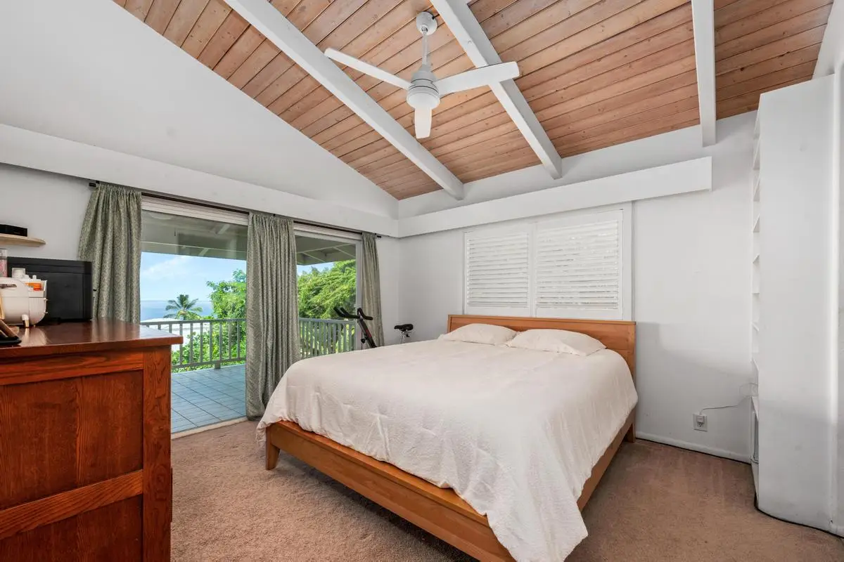 Spacious almost 2,300sf home on a private approximately half-acre flag lot with mature trees and a nice grassy fenced yard. Features two separate living areas with ocean views from both levels. Upstairs (3 bed/2 bath): Main home, Open-concept living with vaulted wood open-beam ceilings, granite kitchen counters, split floor plan with primary and guest rooms separated by living space and large lanai perfect for watching year round sunsets. Downstairs (2 bed/1 bath): Separate entrance, full kitchen (stove not included), washer/dryer, and lanai with hot tub and ocean views. Outdoor Features: Two expansive lanais, Fruiting Mangos, apple bananas, Lime, Samoan coconut… grassy yard, raised garden bed, fenced in back yard area and ample parking with an 864 sq ft carport and cement driveway. Energy Efficient with Owned, grid-tied solar system for very low electric bills. Perfect for multi-generational living or rental potential! Great location and Very low HOA fees in Komohana kai II of only $75/year. There is a Separate Tiny house on property and it is not included in the price but can be purchased separately.