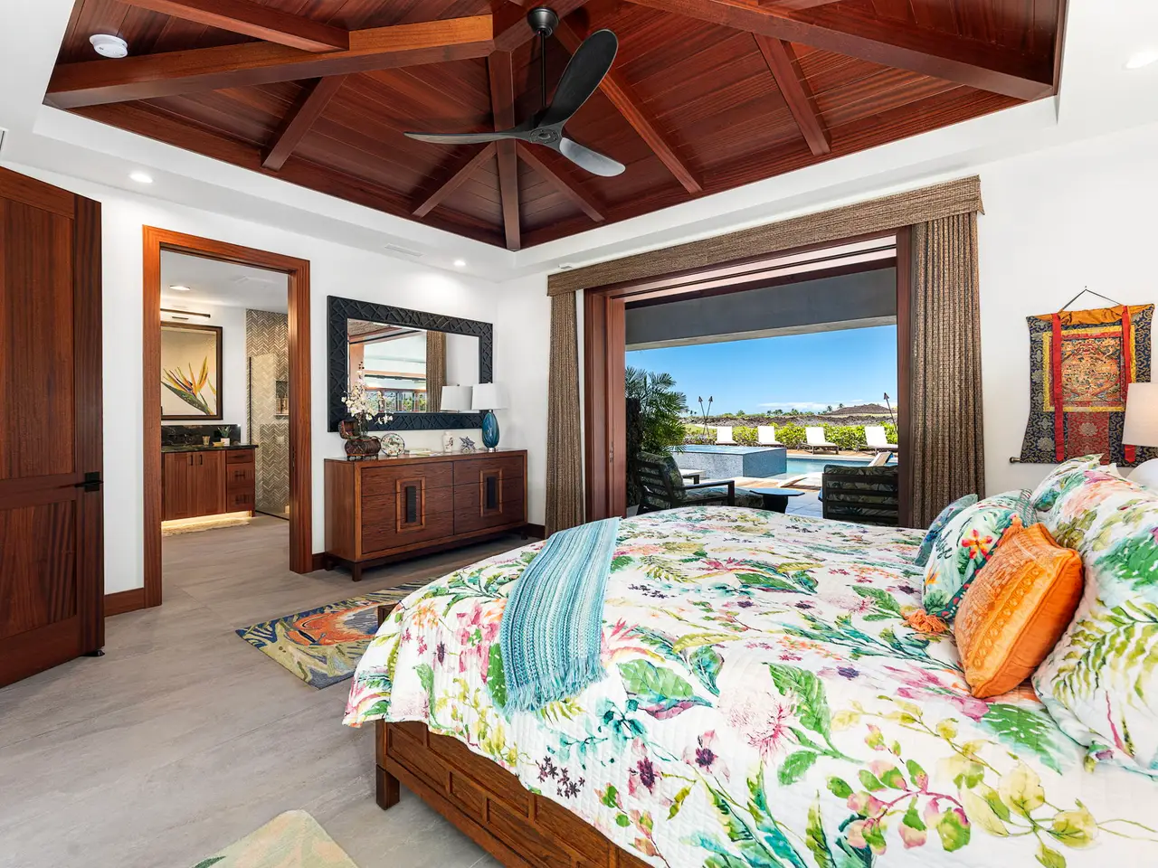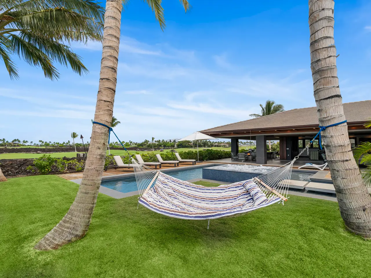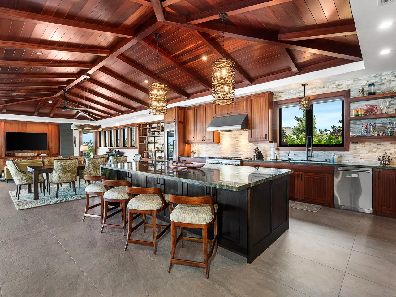 Nestled on the southern end of the legendary Mauna Lani Resort, One Ocean is a small private, gated community quite like no other. Imagine waking up to the breathtaking sight of Hawaiian lava landscapes, the lush “south” course, and the mesmerizing island waters. This is your chance to find your own private paradise on the Kohala Coast of the Big Island. One Ocean 19 is a dream come true, with everything you could ever want and more. From the moment you step inside, you’ll feel like you’ve found your paradise. Nothing was left to chance when this home was built. The pool, waterfalls, courtyard ponds, fire pits, and outdoor kitchen are all top-notch. The interior and exterior are covered in beautiful sapele wood ceilings, and the bathrooms and pool have custom mosaic tile. The stainless steel appliances are from the Thermador Professional Collection, and they all have home connect wifi. There are also built-in electric blinds in the living room and Emtek electronic wifi door mechanisms. Two separate solar water heating systems and four top-of-the-line Carrier A/C systems with six zones all use Carrier wifi are also included. If you’re looking for a home that truly wow’s you, you’ve found it. Located on the 4th hole of the famous Mauna Lani South course, the sunsets here are simply breathtaking. The pool and spa are amazing, and the outdoor kitchen has a Lynx grill and pizza oven. Don’t miss the hammock on the south side for a relaxing afternoon book or glass of wine. Entertaining here is a breeze. This home is a true gem with a 35-panel solar system that generates 14.35 kilowatts of power, powered by a 6-Enphase battery system. It also has one level two Enphase EV charging stations in the garage, LP gas tiki torches, a fire table, and fire pits. Plus, there’s a custom-designed electronic Ring-controlled driveway gate. Don’t miss out on this incredible chance to make this dream home yours at One Ocean.