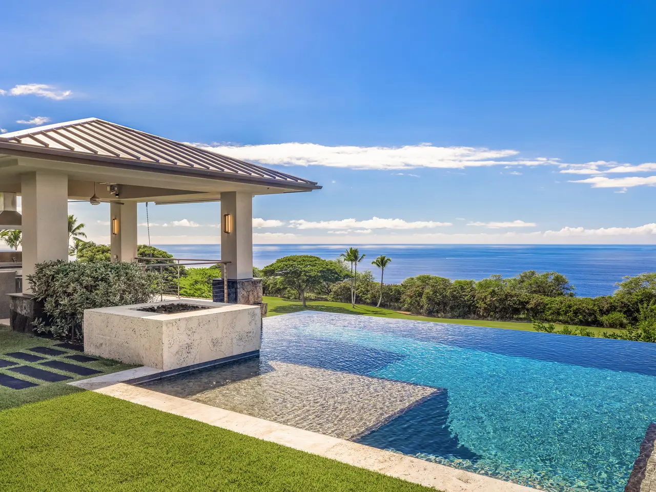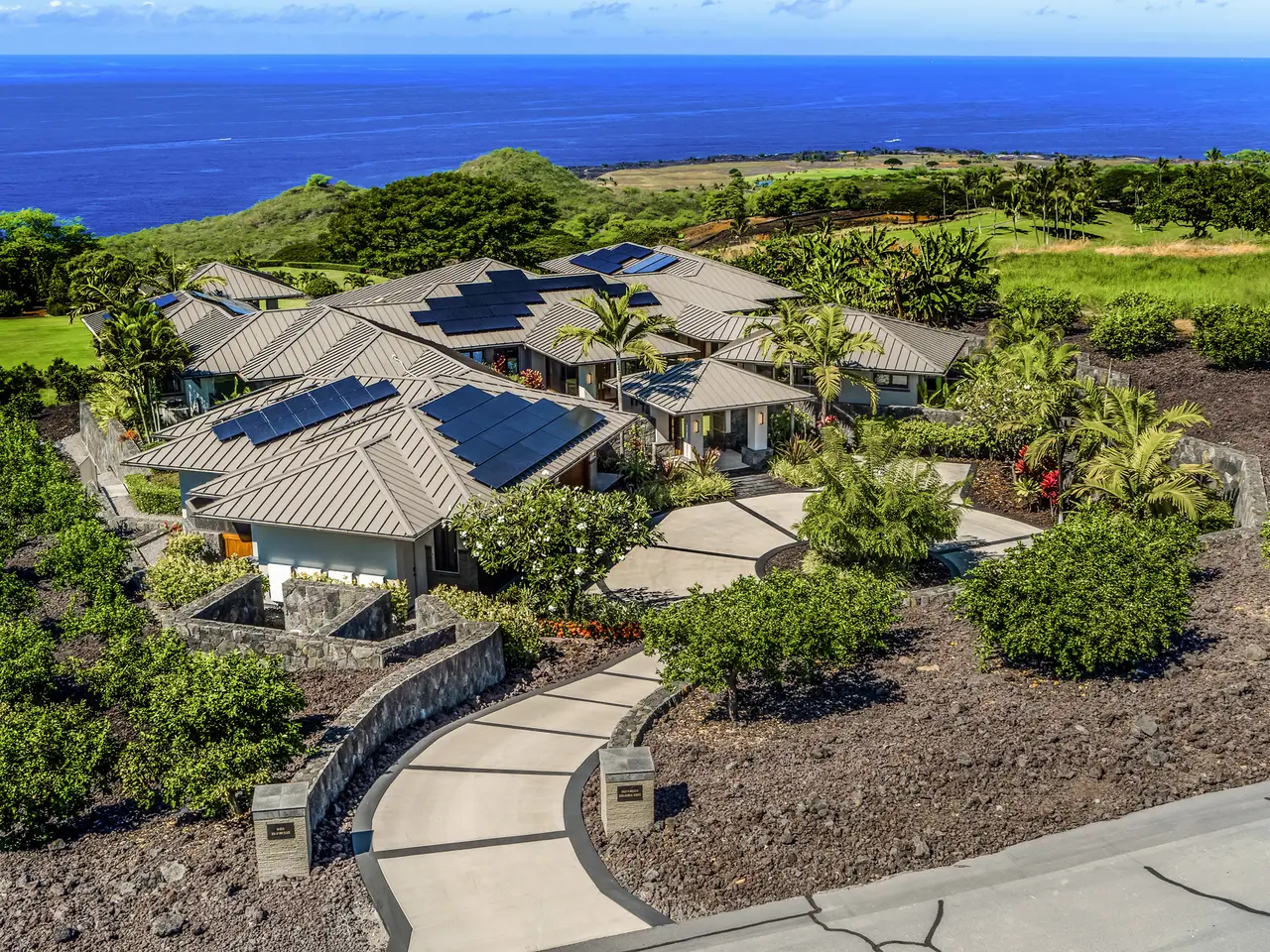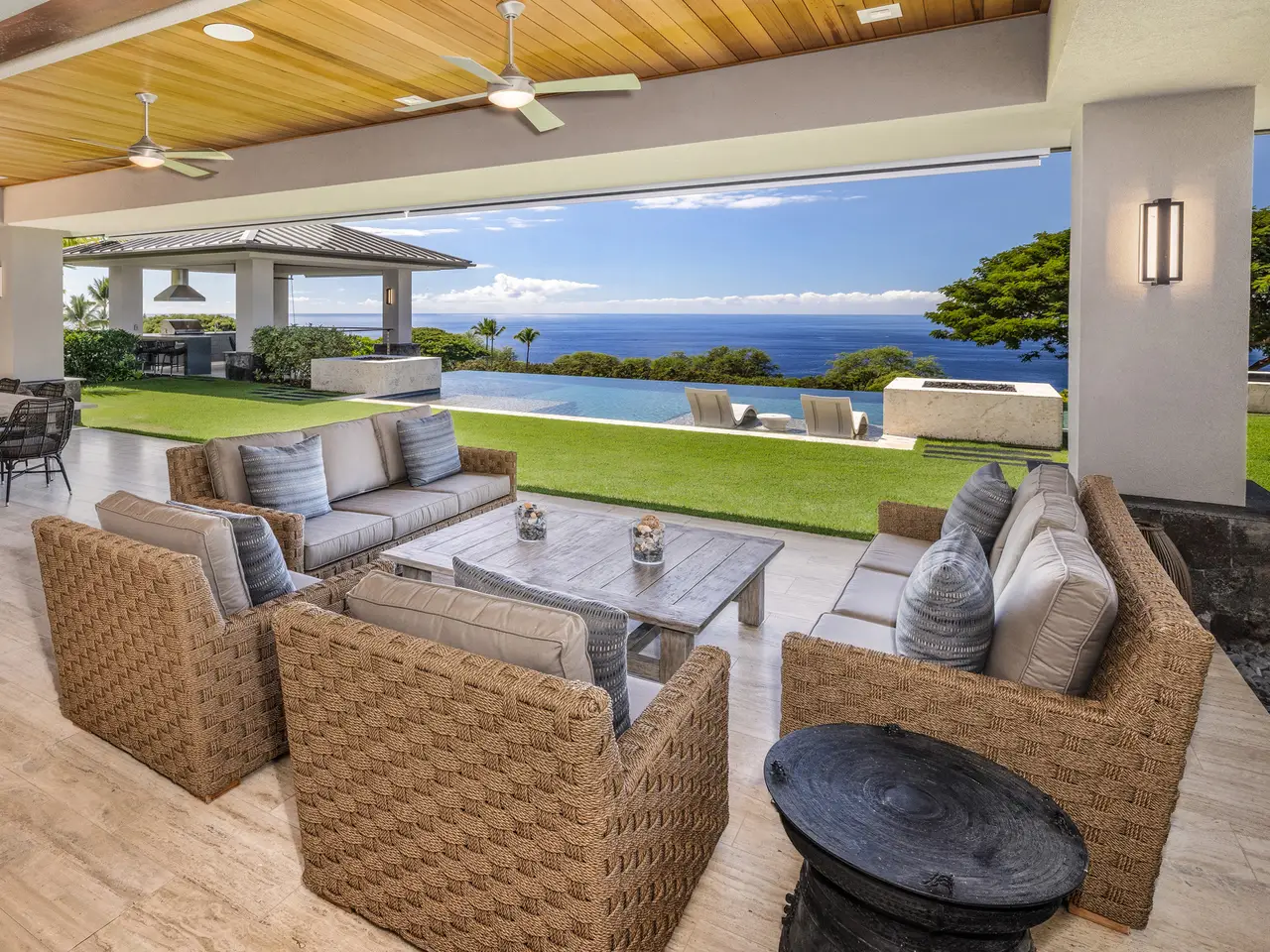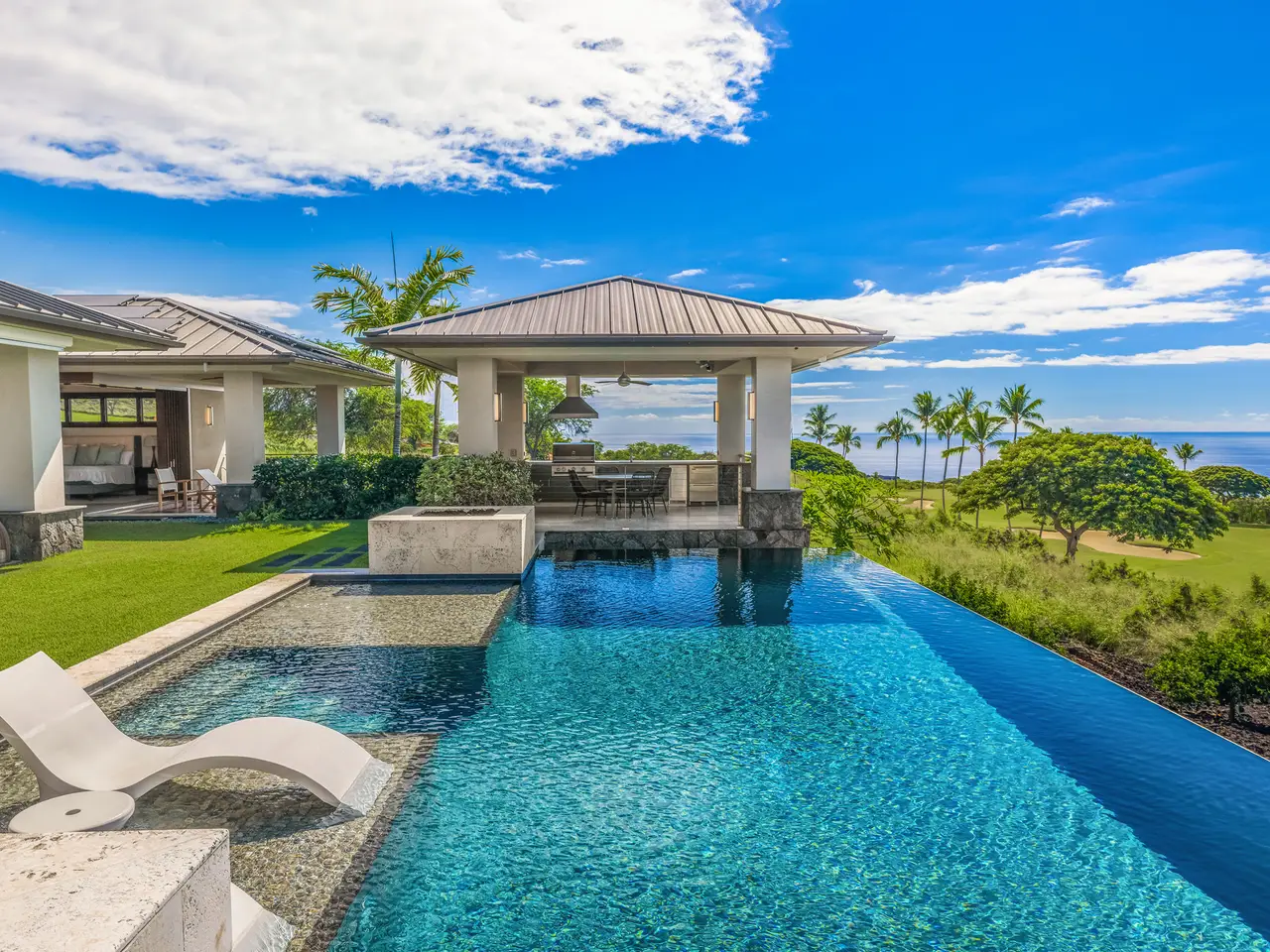 Hokuli‘a 116 stands as a truly remarkable residence along the golf course fairway within the exclusive community of Hokuli‘a. This property spans 1.15 acres and offers breathtaking views of the ocean and coastline. Designed to celebrate the natural beauty of Hawai‘i, this home combines refined architecture with an enviable location, providing the ideal setting for enjoying a peaceful and elegant island lifestyle. Refined Craftsmanship & Unique Indoor-Outdoor Living is reflected in every room and connects to lush landscaping, enhancing the indoor-outdoor flow and taking advantage of its natural environment. Pocket sliding doors open the interiors to an expansive covered lanai with stunning views. The home’s pod-style design features separate structures, or “pods,” for different functions such as bedrooms, living spaces, and the kitchen, all connected by breezeways and outdoor paths. Upon arrival, you are greeted by a roundabout that leads to a serene private courtyard, seamlessly blends into expansive social spaces that showcase stunning views. High ceilings with rich wood paneling create a warm and inviting atmosphere, while award winning built-in cabinet screens add both artistry and functionality. Fully furnished with luxurious finishes, this residence embraces open-air living, blending traditional tropical materials with modern aesthetics to create an elevated island-inspired experience, enhanced by gentle breezes and awe inspiring views from every corner. With more than 7,000 square feet under roof, the property includes a dedicated office, a spacious great room, 4 bedrooms, and 4.5 bathrooms. The private pool and spa tub provide a tranquil retreat, where you can start your mornings with a swim or end your evenings soaking in the vibrant hues of the Hawaiian sunset. A Hokulia Membership is included in the purchase price.