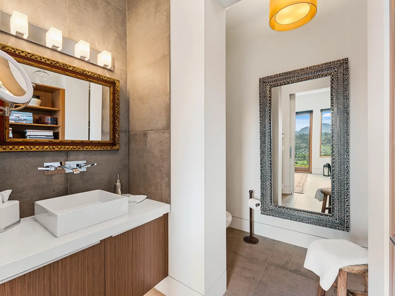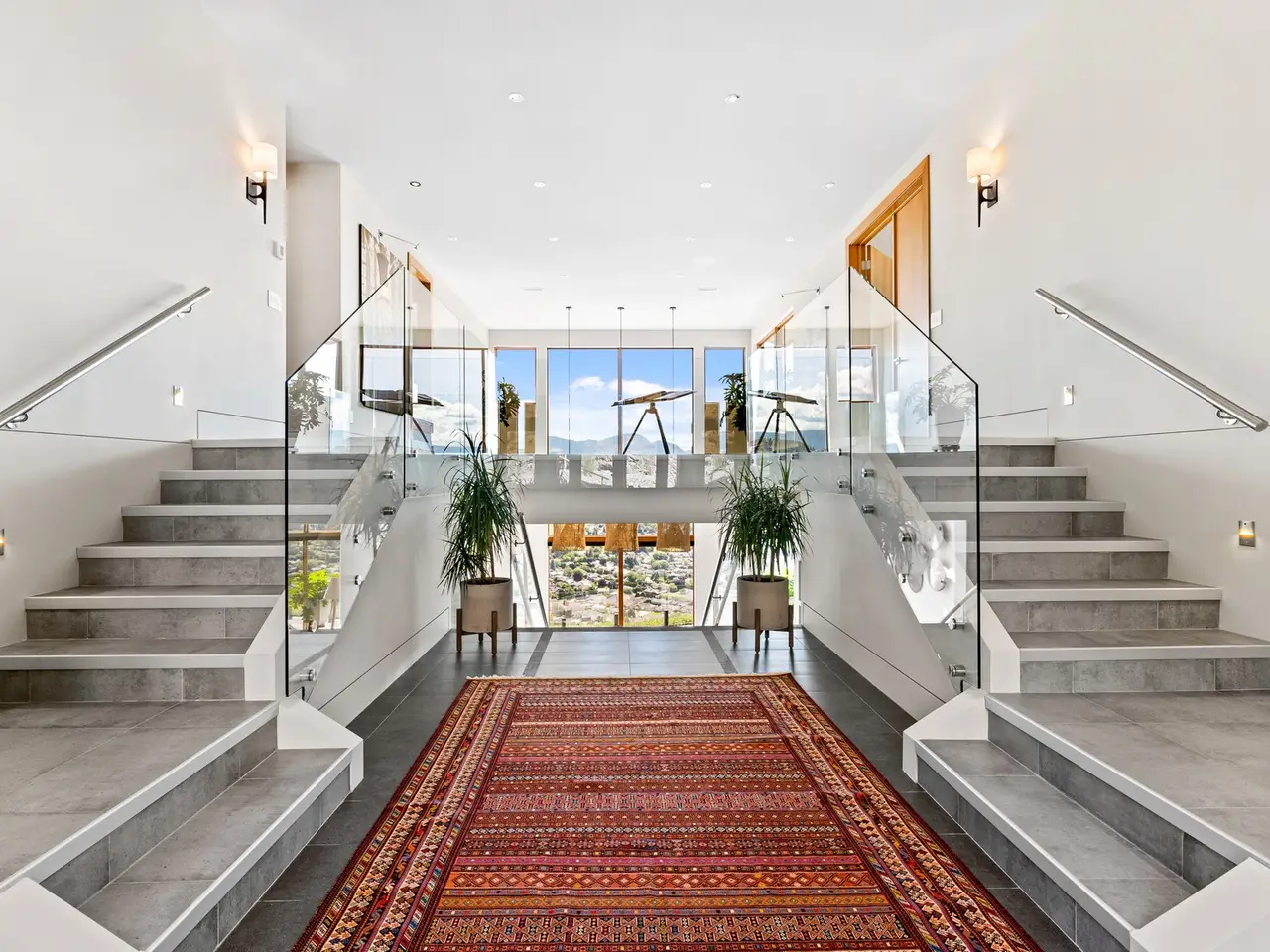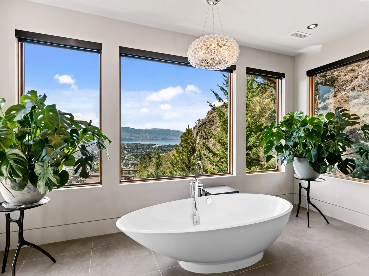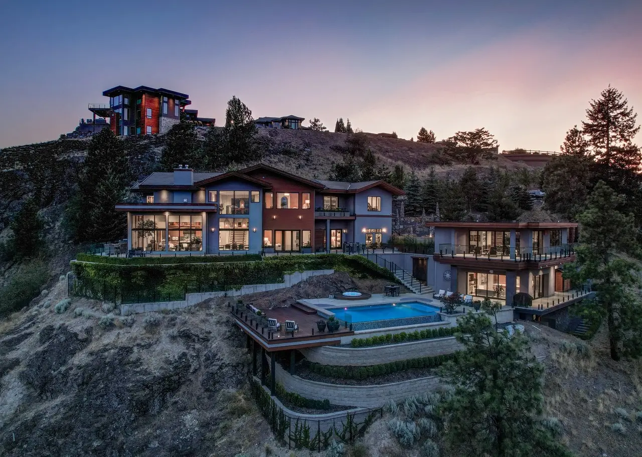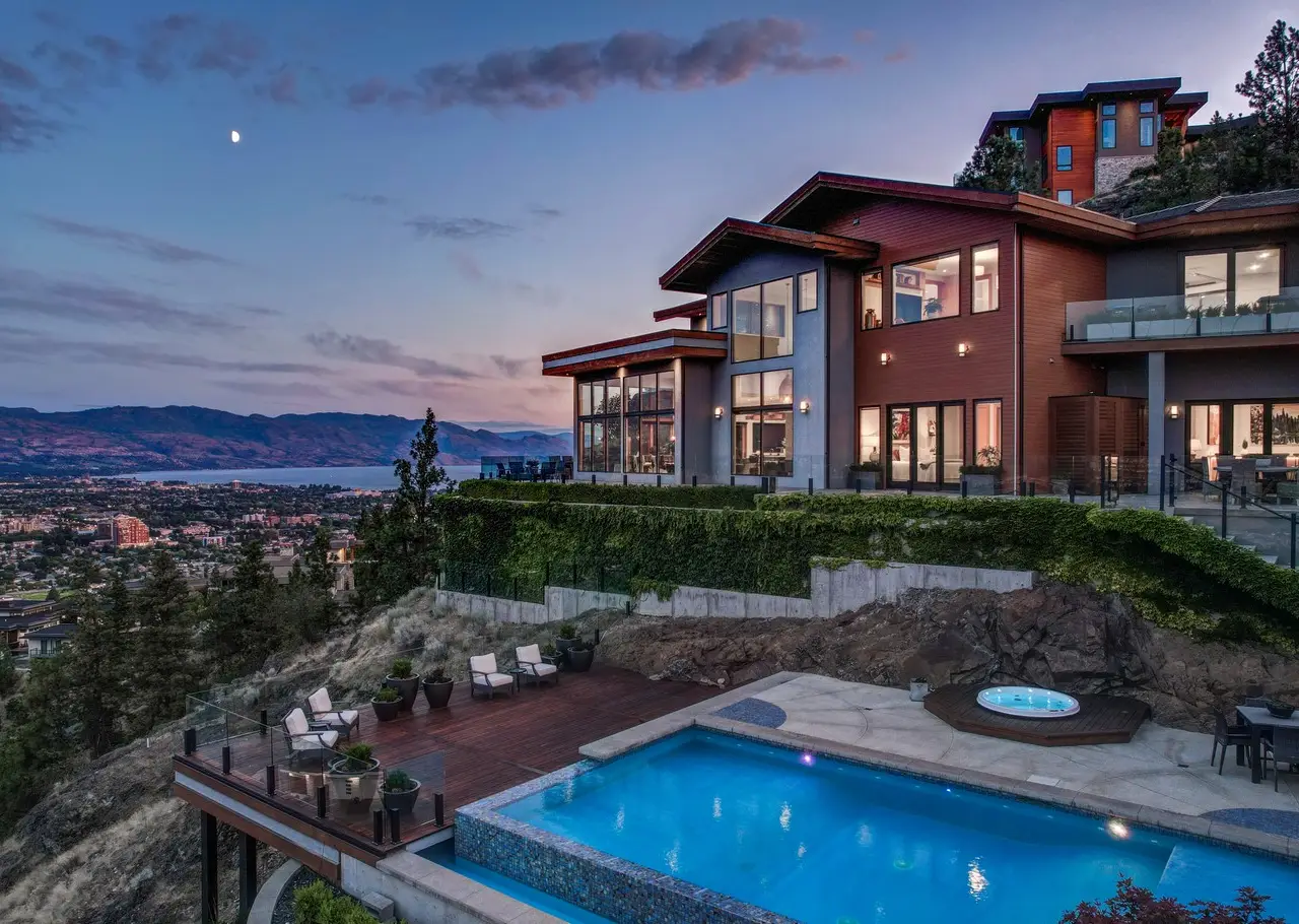 Listed by Unison Jane Hoffman Realty | Private lavish compound, located in the exclusive and desirable gated community of Highpointe, features an approx. 5700 sq. ft. main house and a detached luxury guest house, gym with infrared sauna, and office space. This architectural “landmark” has been recently re-modelled by Team Construction and current owners who had a vision to create warm and inviting spaces. Tasteful interiors were re-designed with $1.7 M spent in high-quality renovations; no expense has been spared from the mechanical to SMART Home technology. Open concept living areas with high ceilings and expansive windows capture panoramic views. The stunning kitchen and butler’s pantry makes a statement with granite countertops, professional appliances, custom wood cabinetry and a cedar beam feature above the island. On the upper level, indulge in luxury from the primary retreat with its own private lake view balcony, a custom walk-in closet and a spa-inspired ensuite. Opportunity to host “legendary” parties poolside with the wall of doors opening to the poolside kitchen accommodations. Ease of access to all levels with the recent addition of an elevator. Expanded triple garage plus extra parking. Amazing trail system and park just a quick walk from the front door. Rare private 2.6 acre setting to enjoy the captivating views of the valley, and the backdrop of the bluffs from the golf course to the lake and twinkling city lights.