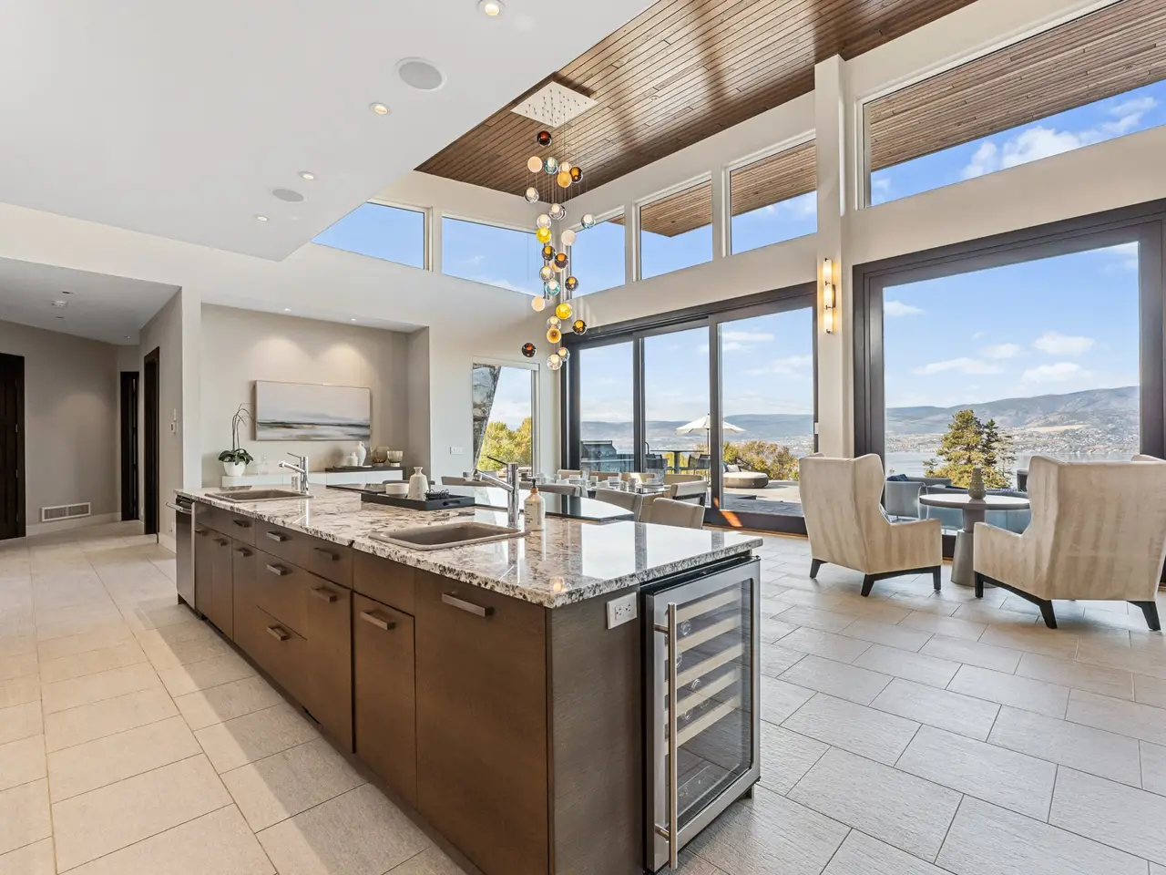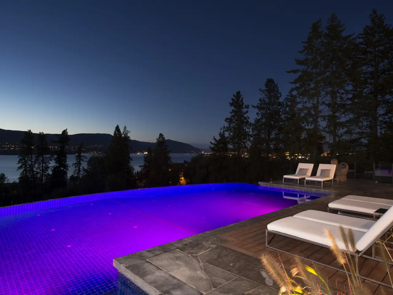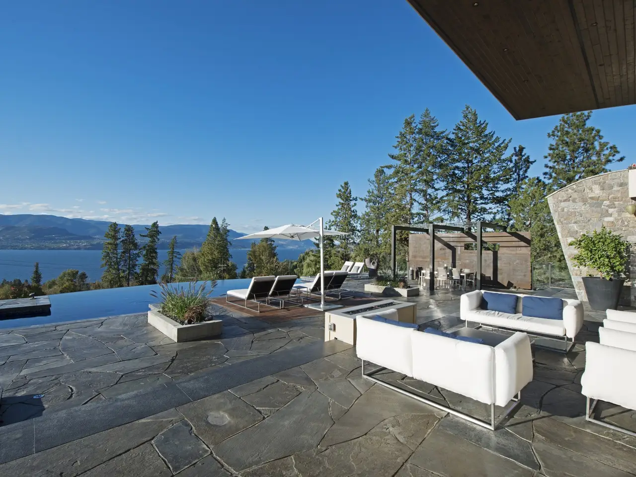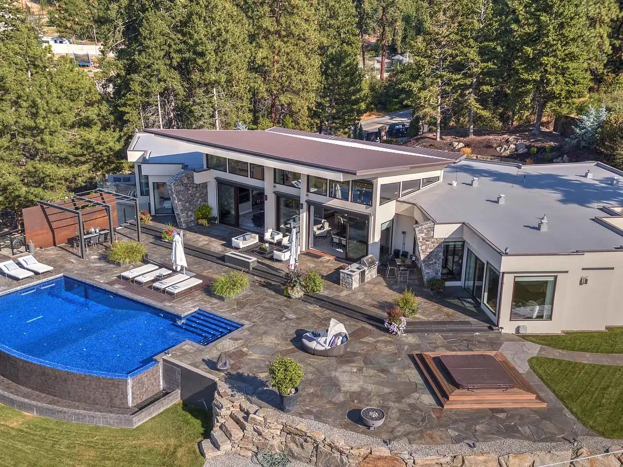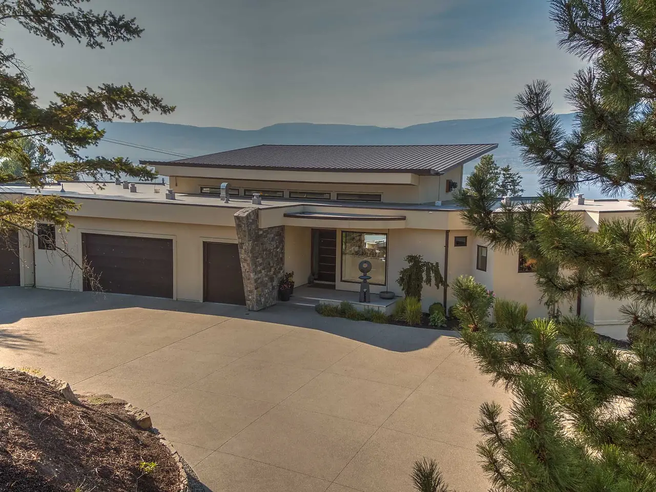Listed by Unison Jane Hoffman Realty | Private estate home set on 2.05 acres and perfectly positioned to capture the stunning lake, city and vineyard views. Enjoy an expansive flagstone patio with a spectacular negative edge saltwater infinity pool that creates a resort-like setting with room to lounge, entertain and take in the breathtaking views. Gated entry leads to heated triple garage & single garage plus RV garage. Upon entering the home you’ll notice walls of glass that showcase the views of the pool, lake and beyond. Soaring ceiling height with floor to ceiling windows & sliding wall system create a seamless extension to the outdoors with the open concept great room, dining & kitchen. Kitchen features oversized granite island, professional appliances, custom fixtures & cabinetry. Generous sized lake view primary bedroom framed in windows with linear gas fireplace & full ensuite with frameless glass shower, his/her sinks and soaker tub. Contemporary style home is over 5600 square feet with 4 bedrooms & 6 baths. Lower level boasts wine room, media room and games room. New pool, patio, pergola & outdoor living space completed in the summer 2015. The home blends exterior with interior living superbly. Located a short stroll to adjacent Summerhill Winery and minutes to the lake, hiking, dining, boutiques and schools.