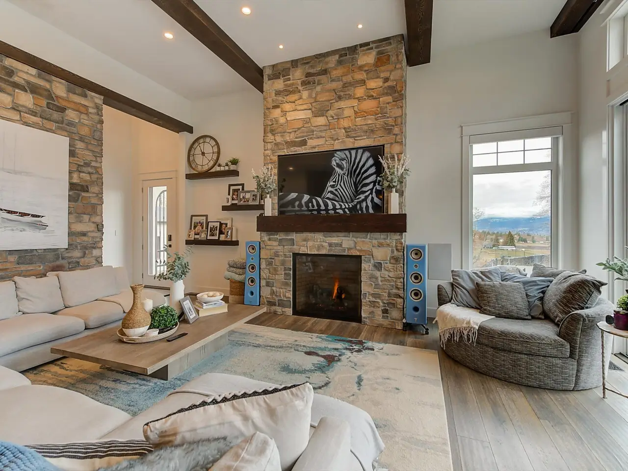 Listed by Unison Jane Hoffman Realty | Picturesque estate in Southeast Kelowna resting on approximately 7+ pristine acres, with a Tuscan-inspired residence offering over 9000 sq. ft. of luxury living with 6 beds and 7 baths. This home has been uniquely divided into 2 separate living spaces, making it ideal for multi-generational living. Designed to be a private oasis for entertainment and tranquility, the property features a high-end concrete 20×40 saltwater pool with a Baja shelf, multiple patios for outdoor living with a fireplace & TV, an outdoor kitchen, a detached 25×40 shop, horse barn/paddock, raised garden boxes, and 3 ponds surrounding the yard, creating an exceptional ambiance. The main home has been beautifully designed for a large family; the upper level offers 4 beds, including a “luxury hotel-like” primary retreat with a spa-like ensuite. A custom media/home theatre and games room with deck access offer a high-end experience for the “tech” in the family. The separate accommodation offers quality finishes and a spacious design for the extended family/in-laws. This completely private space features 3 bedrooms, 3 bathrooms, an oversized garage, and a patio to enjoy the tranquility of the surrounding ponds. This is an excellent opportunity to enjoy a rural setting surrounded by vineyards, orchards, only minutes to Myra Canyon recreational park for hiking/biking, trail riding, and the City of Kelowna amenities. 9 vehicle garage parking and 9 outdoor parking spaces.