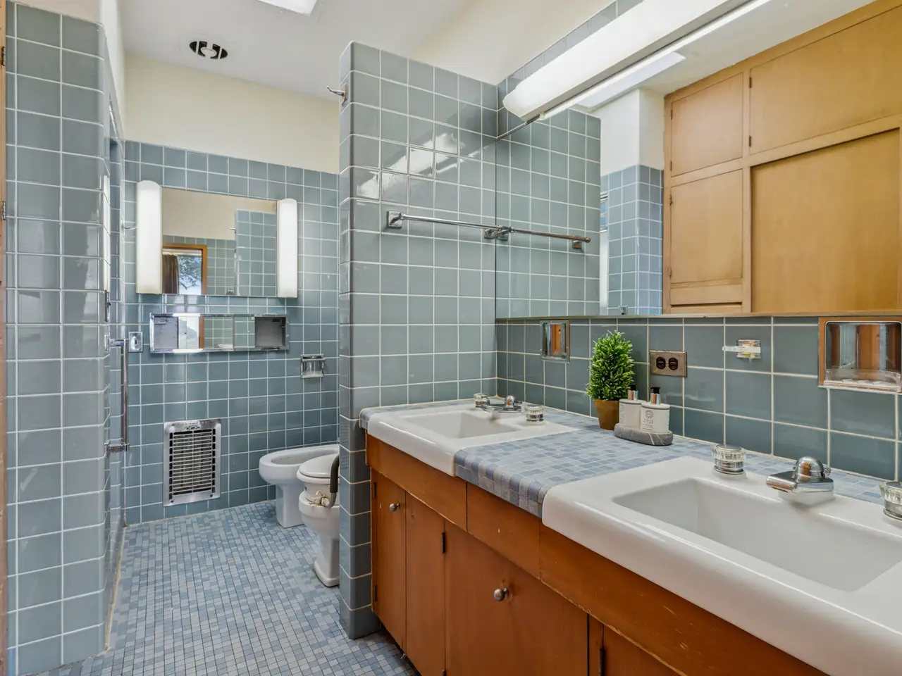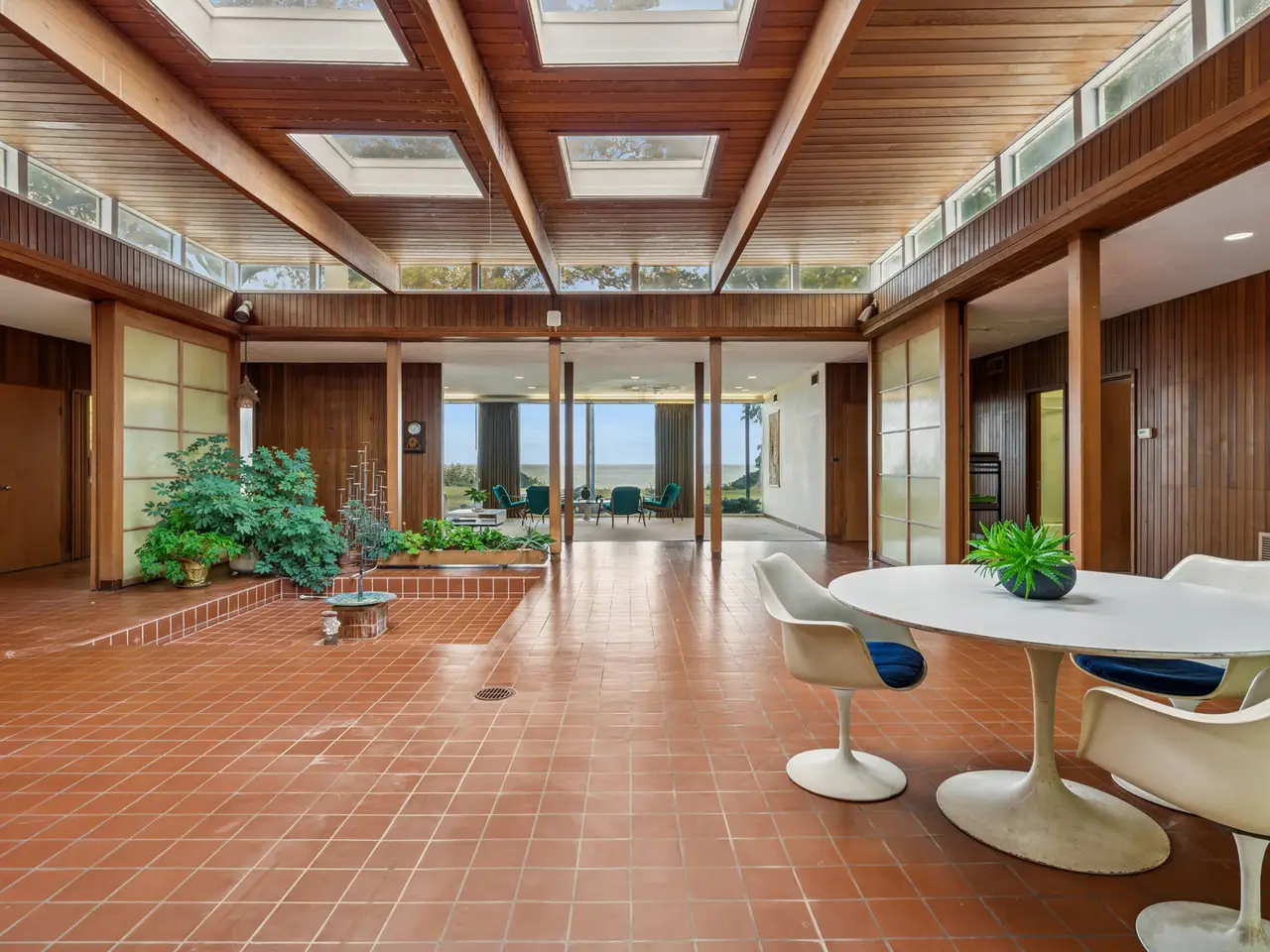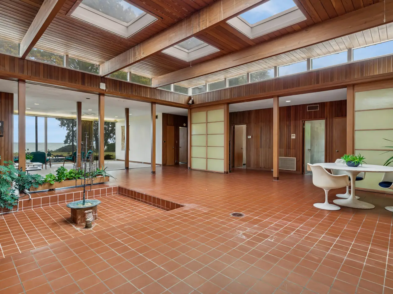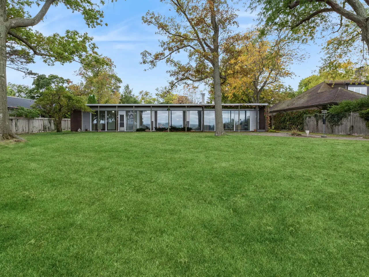 A rare lakefront opportunity in Kenilworth, set on nearly three quarters of an acre, features exceptional table land, a well-preserved bluff with a winding path to the lake, and a private lakefront! Designed by Keck and Keck in 1957, this one-level midcentury modern home showcases clean lines, expansive glass, and radiant heated floors throughout. At its center, a skylit atrium and clerestory windows create an ever-changing play of light. Shoji screens allow the space to shift from open gathering areas to a quiet retreat separated from the bedroom wing. The primary suite faces the lake, while three additional bedrooms line the peaceful south side. The main living areas open to panoramic lake views. A substantial seawall installed with adjoining neighbors protects a shoreline that naturally ebbs and flows. Walk to schools from kindergarten through high school and enjoy nearby Plaza del Lago with its high-end shops and restaurants.