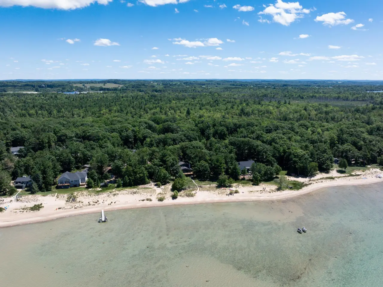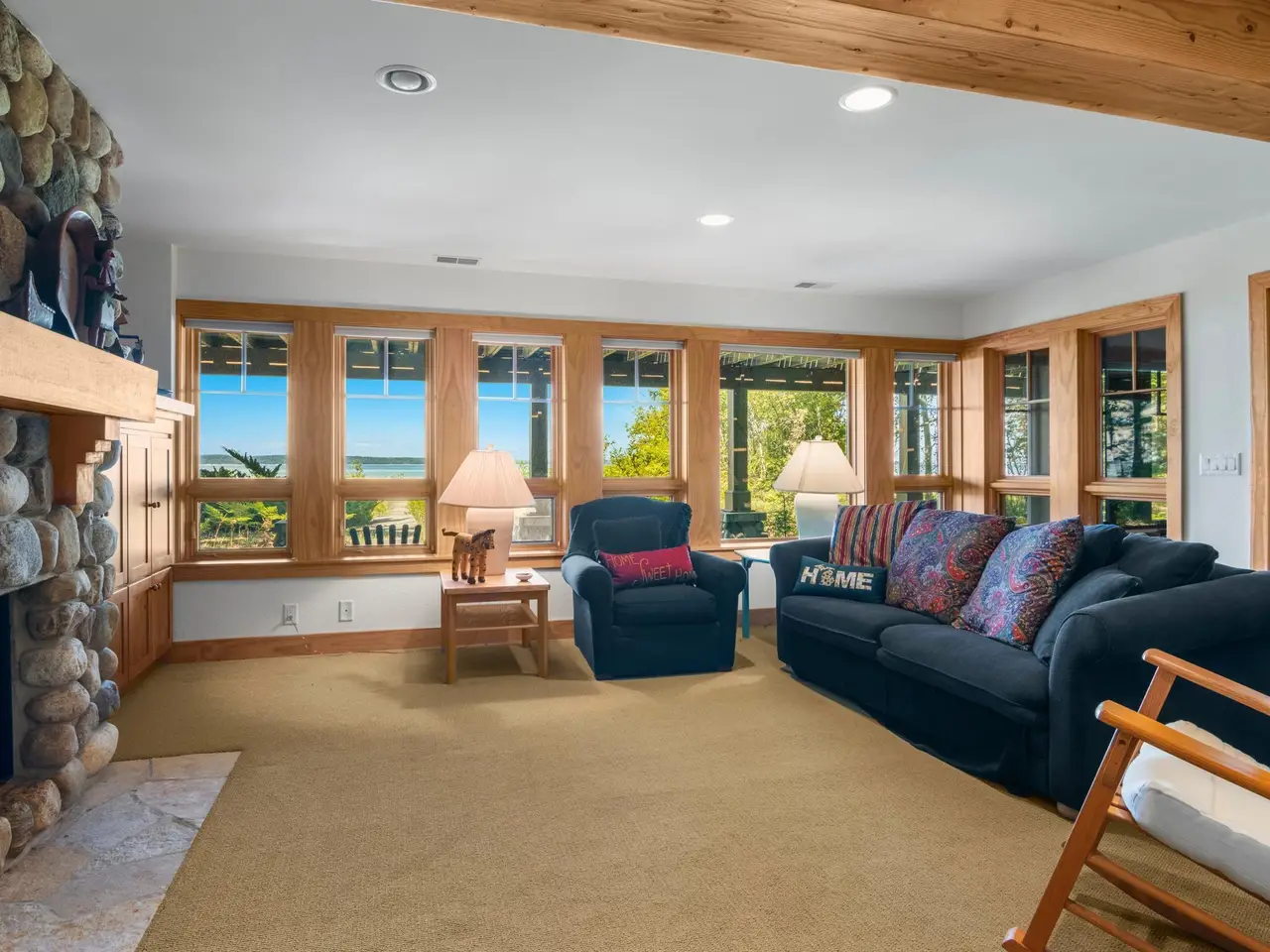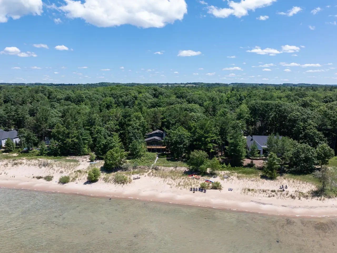 Grand Traverse Bay at its Finest! Welcome to your private retreat on the shores of Grand Traverse Bay-featuring 100 feet of pristine, crystal-clear waterfront, a sugar- sand beach, and breathtaking panoramic sunset views. Nestled on a large, wooded lot along a quiet, private road just 3.5 miles north of Elk Rapids. With 5-bedrooms and 3.5 baths, this beautifully crafted craftsman-style home (designer and builder Paul Maurer) features meticulous attention to detail and premium finishes throughout, perfect for year-round living or summer escapes. The open concept main floor includes a well-appointed island kitchen with wood floors, main floor laundry, a spacious sunroom overlooking the water, and a main floor primary suite with en suite bath, stone gas fireplace and built-in bookcases. Upstairs, two bedrooms share a jack and Jill full bath while the walk out lower level includes 2, additional bedrooms a family room, stone gas fireplace and screened in covered porch ideal for guests or multi-generational living. Covered large back porch and beautiful sun filled deck to gaze out on the lake front. Two -car detached garage, beautifully maintained home, and move-in ready. This property blends natural beauty with everyday comfort.
