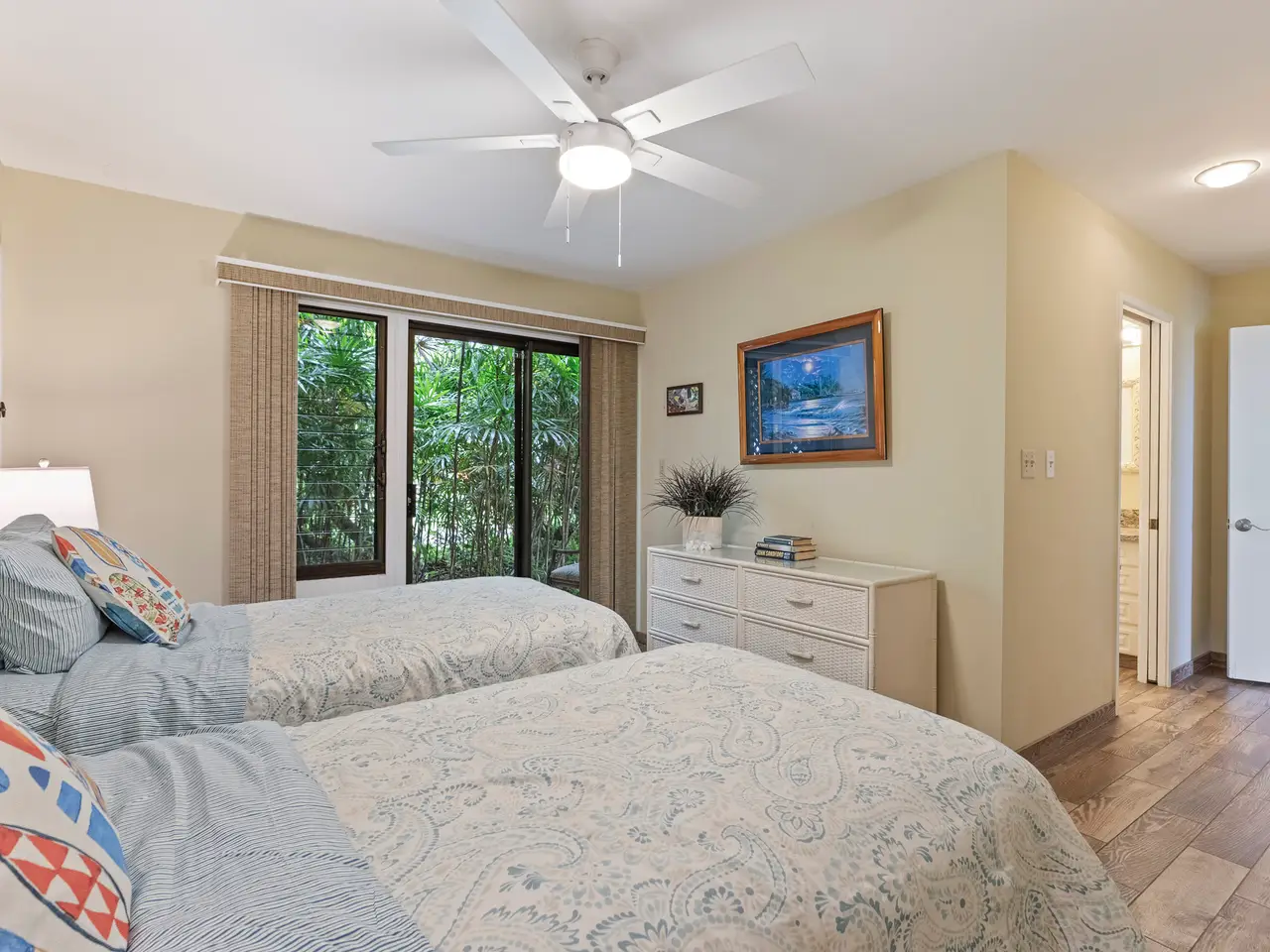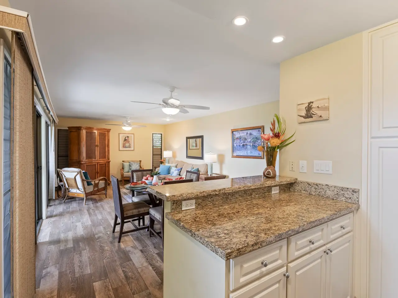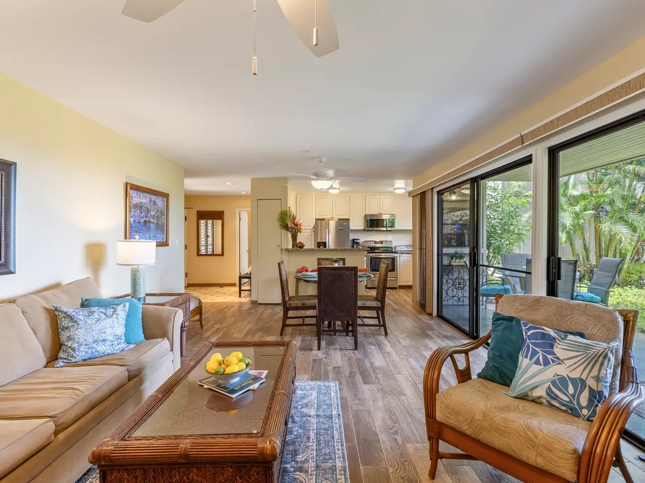 Wailea Ekolu 201 is a ground-floor vacation condominium located in the highly sought-after Wailea community. Featuring a spacious open-concept floor plan and a clean, modern interior, this residence offers a comfortable and refined retreat in one of South Maui’s premier destinations. Enjoy panoramic ocean views from the living room and kitchen—ideal for watching sunsets or spotting whales in season. Surrounded by lush tropical landscaping, the unit offers a quiet, private setting within the well-maintained Wailea Ekolu complex. Situated along the Wailea Blue Golf Course, the community offers scenic surroundings and beautifully landscaped grounds. Residents and guests enjoy access to multiple swimming pools, BBQ areas, and a network of lush walking paths throughout the property. Just a short walk to The Shops at Wailea + Wailea Village Shops, fine dining, and only minutes from world-class beaches, Wailea Ekolu 201 combines convenience, natural beauty, and an exceptional South Maui location. Whether used as a vacation rental or personal getaway, this unit is a smart investment in the Wailea lifestyle.