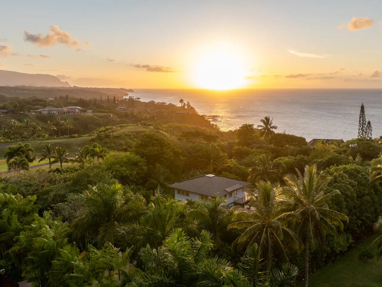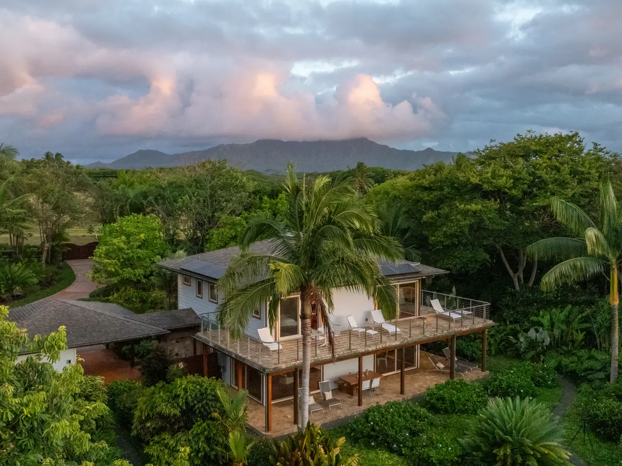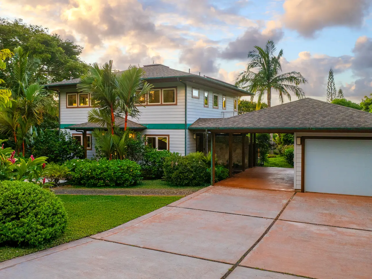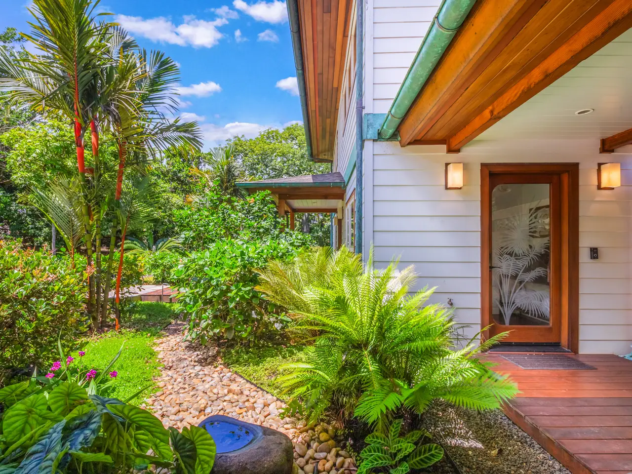 Set above one of Kauai’s most iconic stretches of coastline, this 1.3-acre property offers private, deeded access to coveted Secret Beach via a scenic footpath. Built just 10 years ago and meticulously maintained by its original owner, the 2,000 sqft residence is tucked into a lush botanical landscape with ocean views and a focus on indoor/outdoor living. Sapele wood flooring runs throughout, with tile and stone finishes in the bathrooms. A sculptural Sapele wood and glass floating staircase anchors the two-story layout. Upstairs, the main living space opens to an expansive lanai with sweeping ocean and sunset views. Multiple sliding doors and well-placed windows bring in natural light and steady trade winds, blending the interior spaces with the surrounding gardens. The home is fully air-conditioned and equipped with a whole-house water purification system, electric tankless water heater, and a 14-panel owned photovoltaic system. Additional highlights include a dedicated dance or exercise room, a tropical outdoor shower off the half bath, and copper gutters and trim. Infrastructure is in place to support future additions, including underground electrical for a potential pool. An attached garage and carport offer ample storage for all the gear needed to enjoy Kauai’s outdoor lifestyle. Select custom furnishings are included, and concept plans are available to expand the residence into a 3-bedroom, 3.5-bath estate. A private, well-executed retreat in one of the North Shore’s most sought-after locations—just minutes from Kilauea town, the historic lighthouse, world-class golf in Princeville, and a collection of Kauai’s finest beaches.