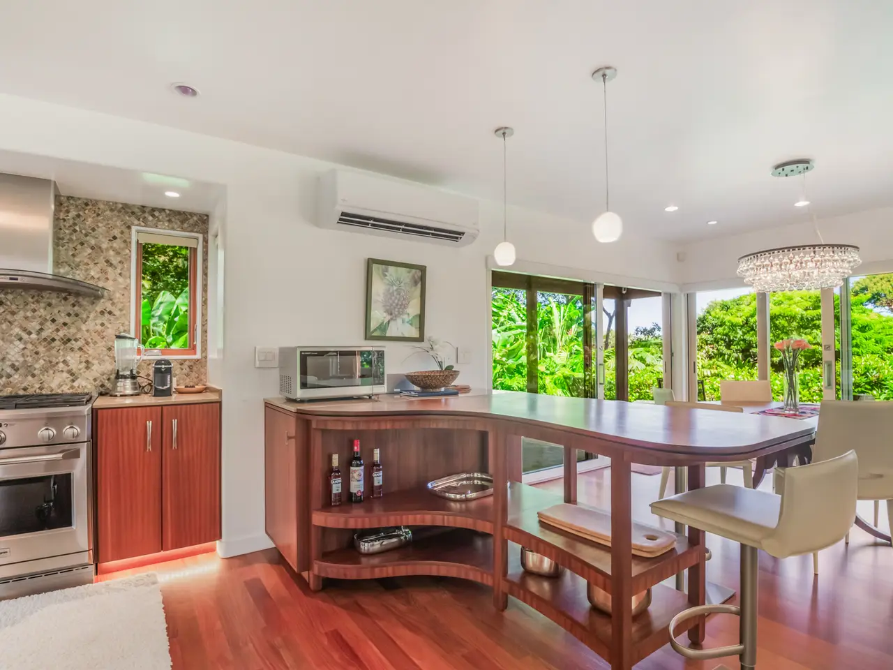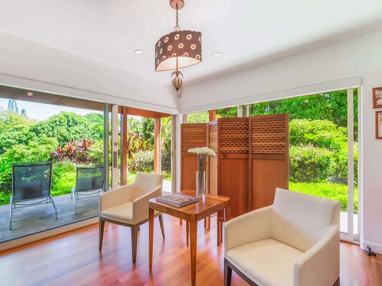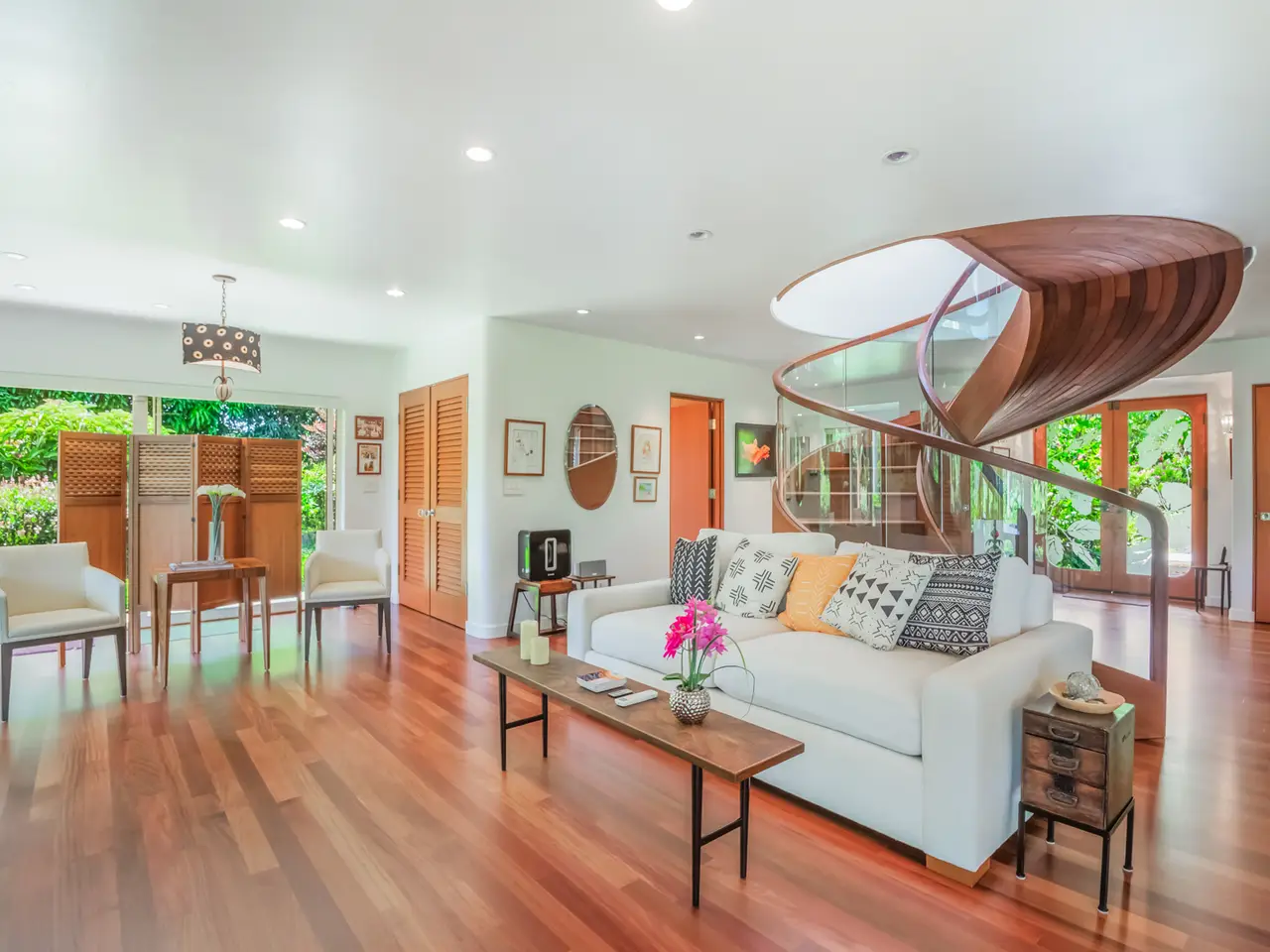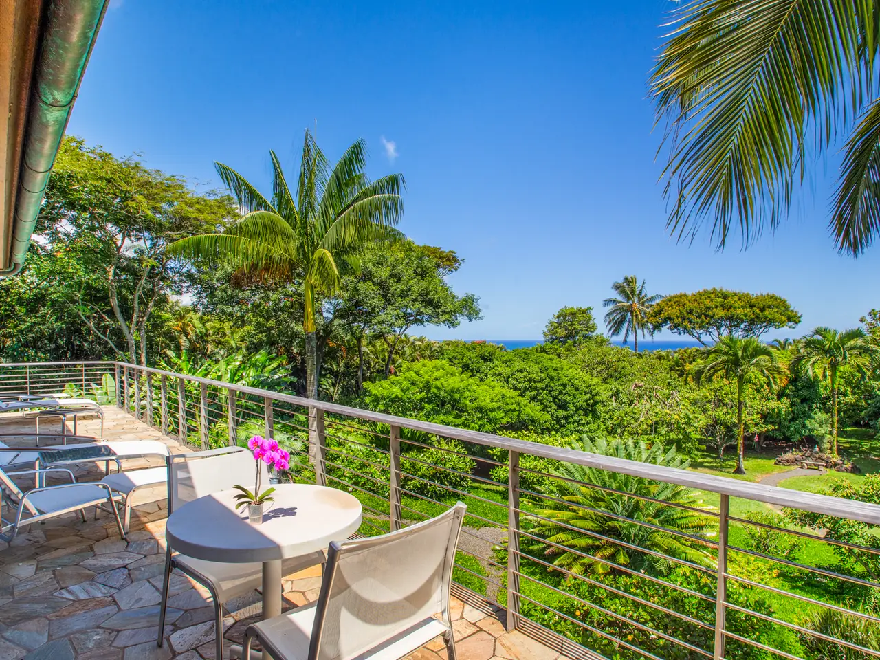 Set above one of Kauai’s most iconic stretches of coastline, this 1.3-acre property offers private, deeded access to coveted Secret Beach via a scenic footpath. Built just 10 years ago and meticulously maintained by its original owner, the 2,000 sqft residence is tucked into a lush botanical landscape with ocean views and a focus on indoor/outdoor living. Sapele wood flooring runs throughout, with tile and stone finishes in the bathrooms. A sculptural Sapele wood and glass floating staircase anchors the two-story layout. Upstairs, the main living space opens to an expansive lanai with sweeping ocean and sunset views. Multiple sliding doors and well-placed windows bring in natural light and steady trade winds, blending the interior spaces with the surrounding gardens. The home is fully air-conditioned and equipped with a whole-house water purification system, electric tankless water heater, and a 14-panel owned photovoltaic system. Additional highlights include a dedicated dance or exercise room, a tropical outdoor shower off the half bath, and copper gutters and trim. Infrastructure is in place to support future additions, including underground electrical for a potential pool. An attached garage and carport offer ample storage for all the gear needed to enjoy Kauai’s outdoor lifestyle. Select custom furnishings are included, and concept plans are available to expand the residence into a 3-bedroom, 3.5-bath estate. A private, well-executed retreat in one of the North Shore’s most sought-after locations—just minutes from Kilauea town, the historic lighthouse, world-class golf in Princeville, and a collection of Kauai’s finest beaches.