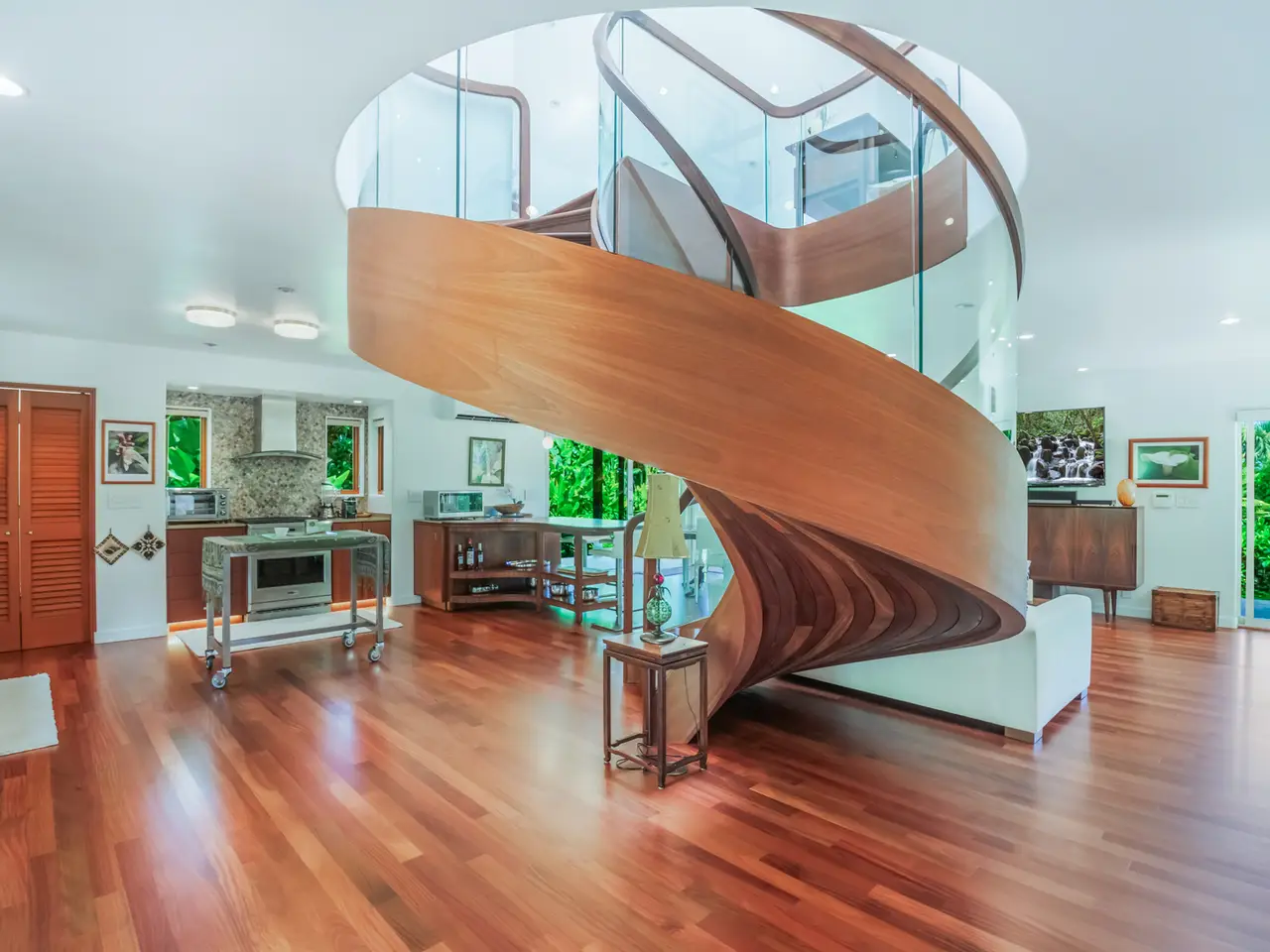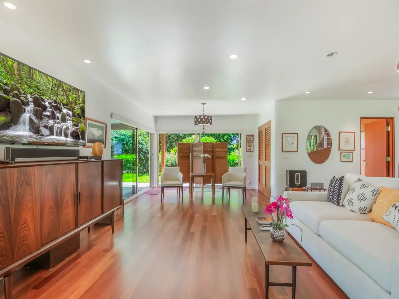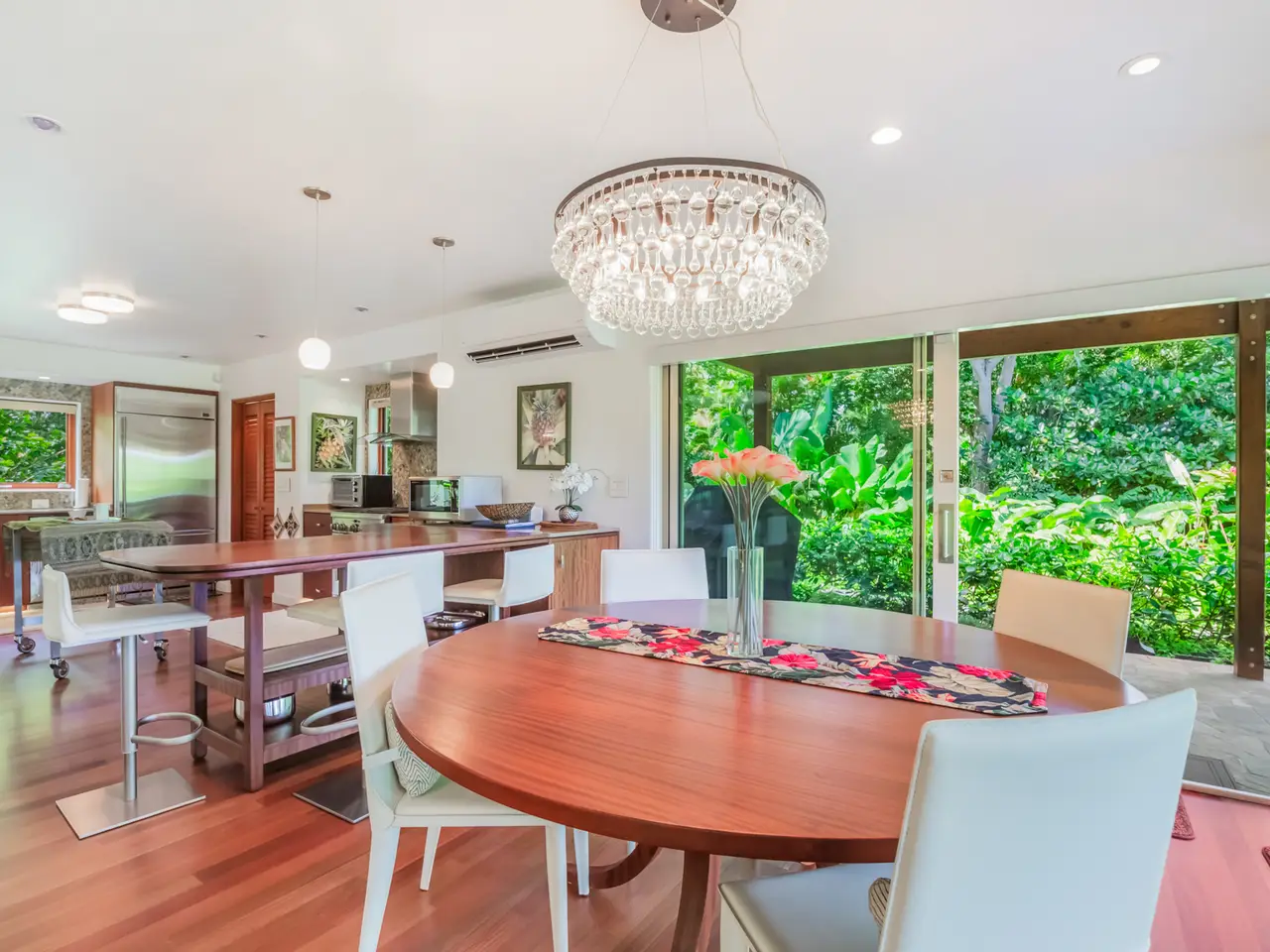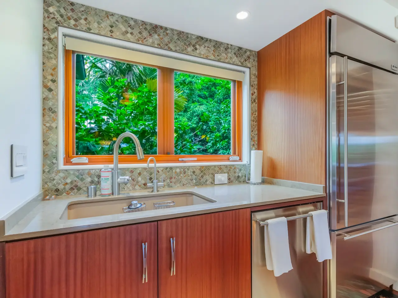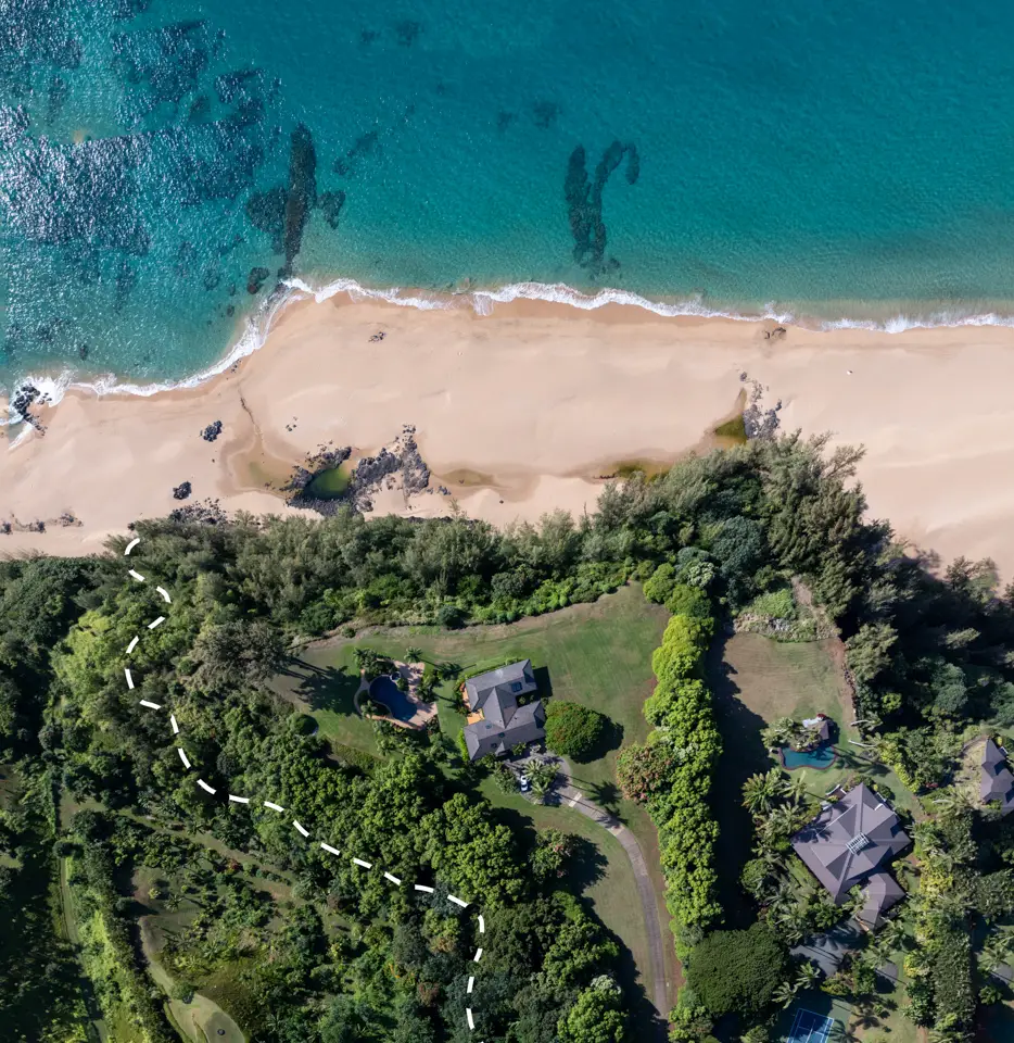Set above one of Kauai’s most iconic stretches of coastline, this 1.3-acre property offers private, deeded access to coveted Secret Beach via a scenic footpath. Built just 10 years ago and meticulously maintained by its original owner, the 2,000 sqft residence is tucked into a lush botanical landscape with ocean views and a focus on indoor/outdoor living. Sapele wood flooring runs throughout, with tile and stone finishes in the bathrooms. A sculptural Sapele wood and glass floating staircase anchors the two-story layout. Upstairs, the main living space opens to an expansive lanai with sweeping ocean and sunset views. Multiple sliding doors and well-placed windows bring in natural light and steady trade winds, blending the interior spaces with the surrounding gardens. The home is fully air-conditioned and equipped with a whole-house water purification system, electric tankless water heater, and a 14-panel owned photovoltaic system. Additional highlights include a dedicated dance or exercise room, a tropical outdoor shower off the half bath, and copper gutters and trim. Infrastructure is in place to support future additions, including underground electrical for a potential pool. An attached garage and carport offer ample storage for all the gear needed to enjoy Kauai’s outdoor lifestyle. Select custom furnishings are included, and concept plans are available to expand the residence into a 3-bedroom, 3.5-bath estate. A private, well-executed retreat in one of the North Shore’s most sought-after locations—just minutes from Kilauea town, the historic lighthouse, world-class golf in Princeville, and a collection of Kauai’s finest beaches.