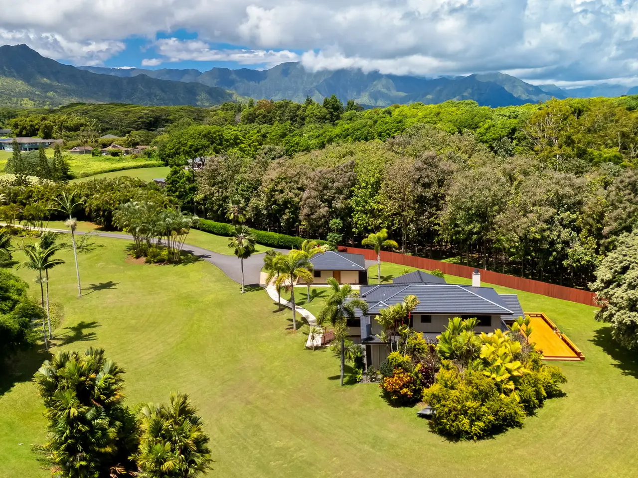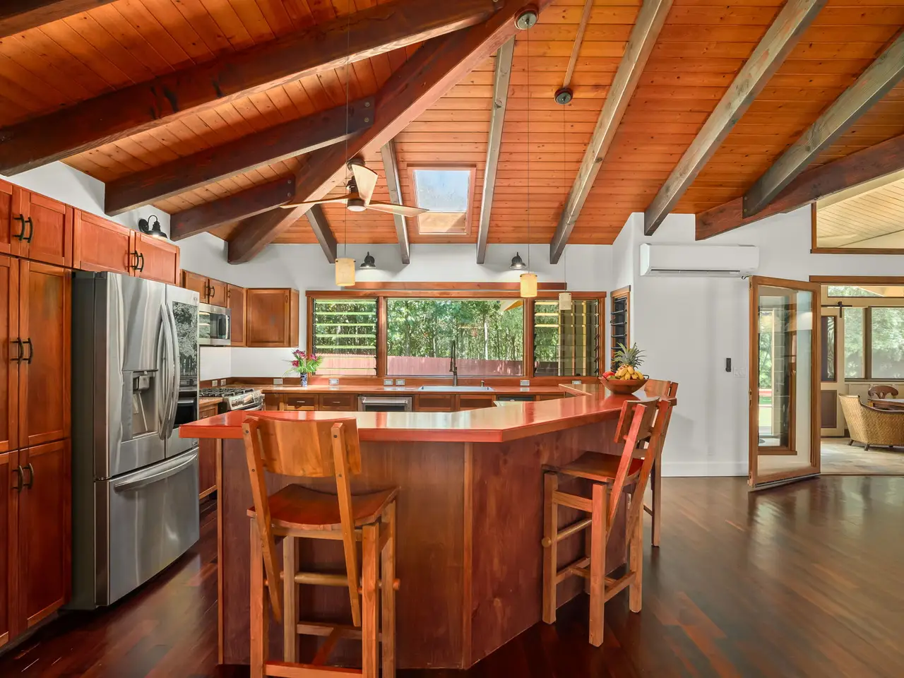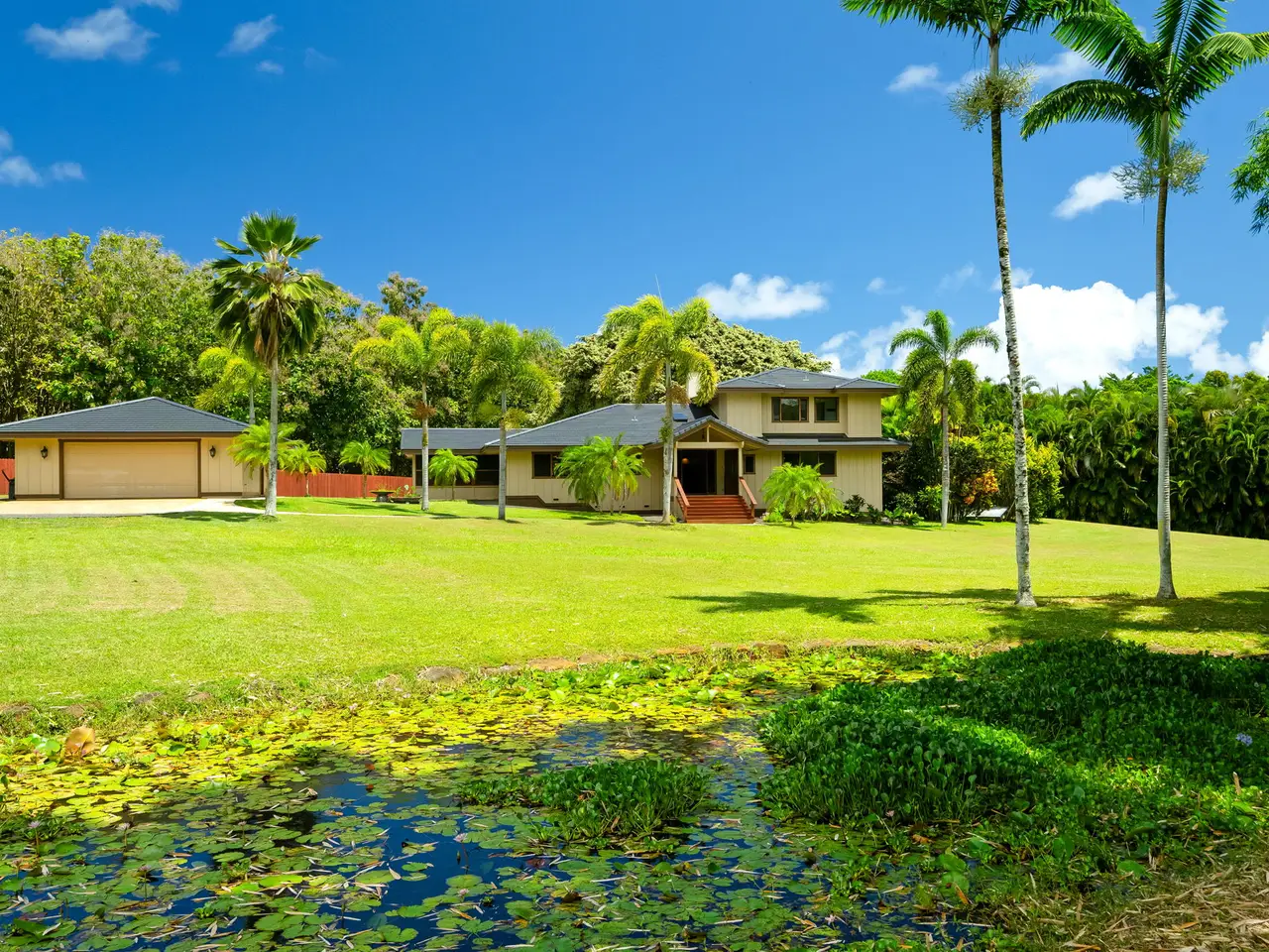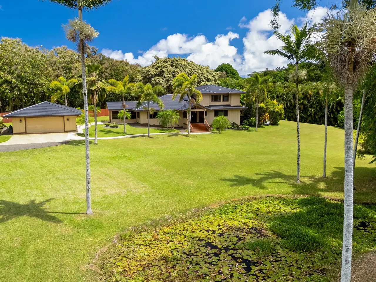 Situated down a gated drive, this estate property offers tranquility, privacy and serene views. The home features 4 bedrooms and 3.5 baths, consisting of 3,354 square feet with an open floor plan. All rooms are large and airy with fresh trade wind breezes throughout. The hardwood floors are imported, as are many of the home’s unique “work of art” features, including hammered copper sinks & bathtub, carved doors and the heavy-beamed 15 foot high ceilings. The cabinets throughout are custom made of teak. The upper level consists of a 910 Sq.Ft. primary suite with a sitting area connected to an adjoining room which can be used as an office, gym or studio. The dressing area and walk-in closet give easy access to the spacious primary bath. Luxuriate in the bath while enjoying the garden views or shower in a unique glass-doored shower and enjoy views of the mountains. The separate 728-square foot, oversized, 2-car garage has a half bath. The estate’s 3+ acres are entirely fenced. The grounds are surrounded on one side by acres of Teak and Mahogany trees and the perimeter is planted with bamboo, mock orange and arecia palms affording total privacy. Views of the mountains, a natural, spring-fed pond and a stream running through the property are just a few of the many amenities that enhance this beautiful setting. Harvest plenty of fresh fruit from the mature, exotic tropical orchard. Other notable features include: • New Split A/C Units • Brand New Tile Roof • Imported Hardwood Flooring • Freshly Painted Interior & Exterior • Screened-in Lanais (x 2) • Large walk-in Closet & Dressing Area • Separate Oversized Garage / Workshop • Gated Entry • Fully Fenced • New Rear Deck for Outdoor Entertaining • Open Floor Plan w/ Extra-Large Rooms • Custom Teak Cabinetry Throughout • Hammered Copper Sinks & Bathtub • Carved Hardwood Doors Come and discover this exceptional North Shore property...
