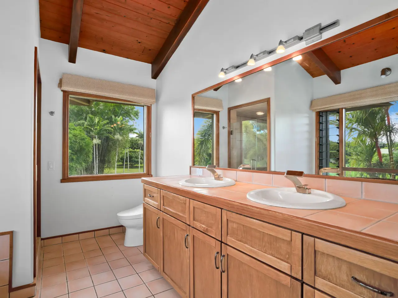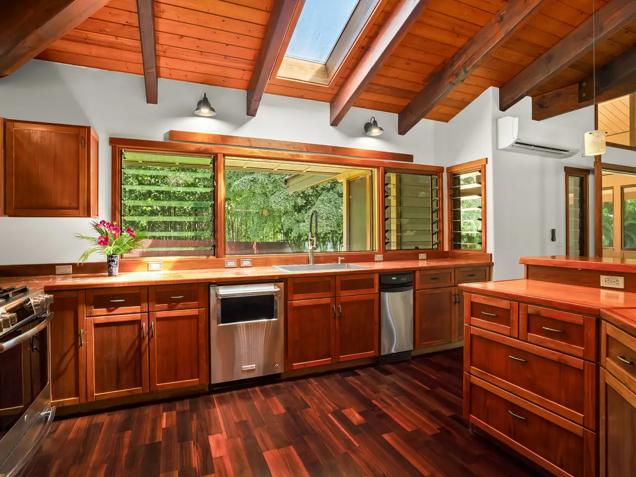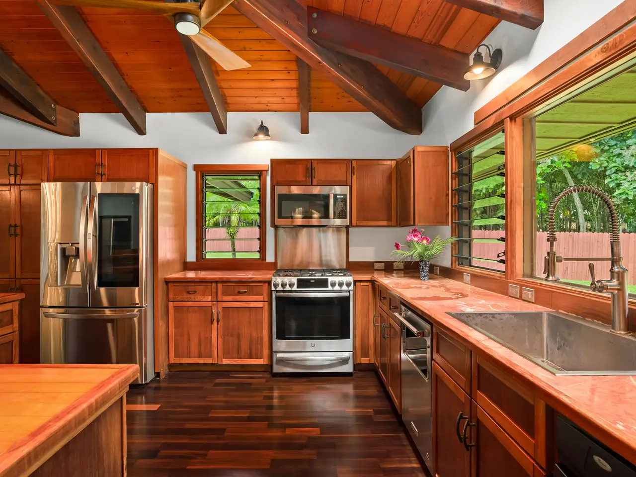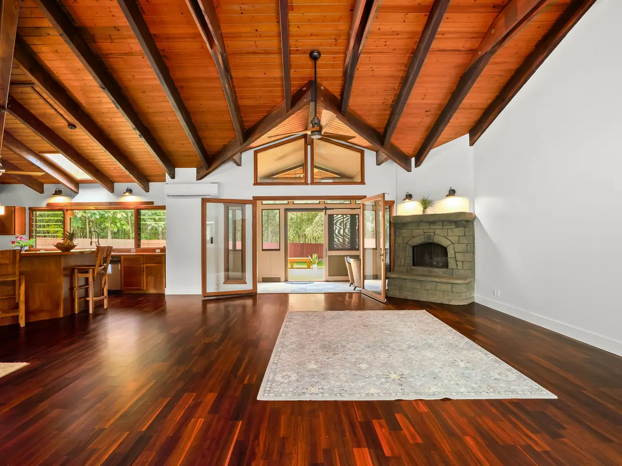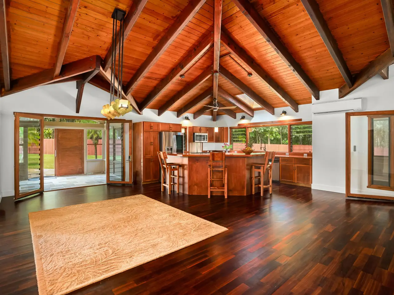 Situated down a gated drive, this estate property offers tranquility, privacy and serene views. The home features 4 bedrooms and 3.5 baths, consisting of 3,354 square feet with an open floor plan. All rooms are large and airy with fresh trade wind breezes throughout. The hardwood floors are imported, as are many of the home’s unique “work of art” features, including hammered copper sinks & bathtub, carved doors and the heavy-beamed 15 foot high ceilings. The cabinets throughout are custom made of teak. The upper level consists of a 910 Sq.Ft. primary suite with a sitting area connected to an adjoining room which can be used as an office, gym or studio. The dressing area and walk-in closet give easy access to the spacious primary bath. Luxuriate in the bath while enjoying the garden views or shower in a unique glass-doored shower and enjoy views of the mountains. The separate 728-square foot, oversized, 2-car garage has a half bath. The estate’s 3+ acres are entirely fenced. The grounds are surrounded on one side by acres of Teak and Mahogany trees and the perimeter is planted with bamboo, mock orange and arecia palms affording total privacy. Views of the mountains, a natural, spring-fed pond and a stream running through the property are just a few of the many amenities that enhance this beautiful setting. Harvest plenty of fresh fruit from the mature, exotic tropical orchard. Other notable features include: • New Split A/C Units • Brand New Tile Roof • Imported Hardwood Flooring • Freshly Painted Interior & Exterior • Screened-in Lanais (x 2) • Large walk-in Closet & Dressing Area • Separate Oversized Garage / Workshop • Gated Entry • Fully Fenced • New Rear Deck for Outdoor Entertaining • Open Floor Plan w/ Extra-Large Rooms • Custom Teak Cabinetry Throughout • Hammered Copper Sinks & Bathtub • Carved Hardwood Doors Come and discover this exceptional North Shore property...