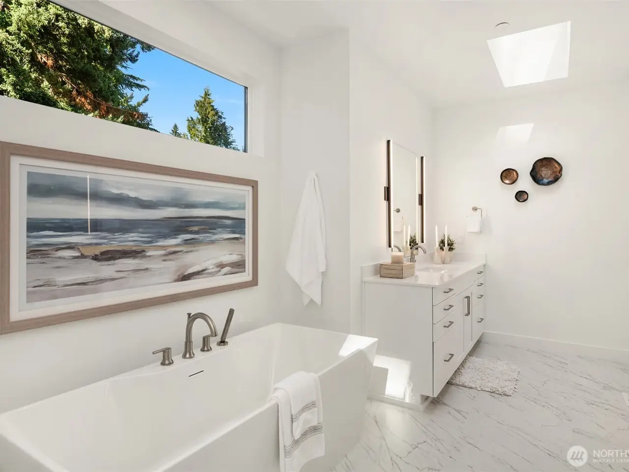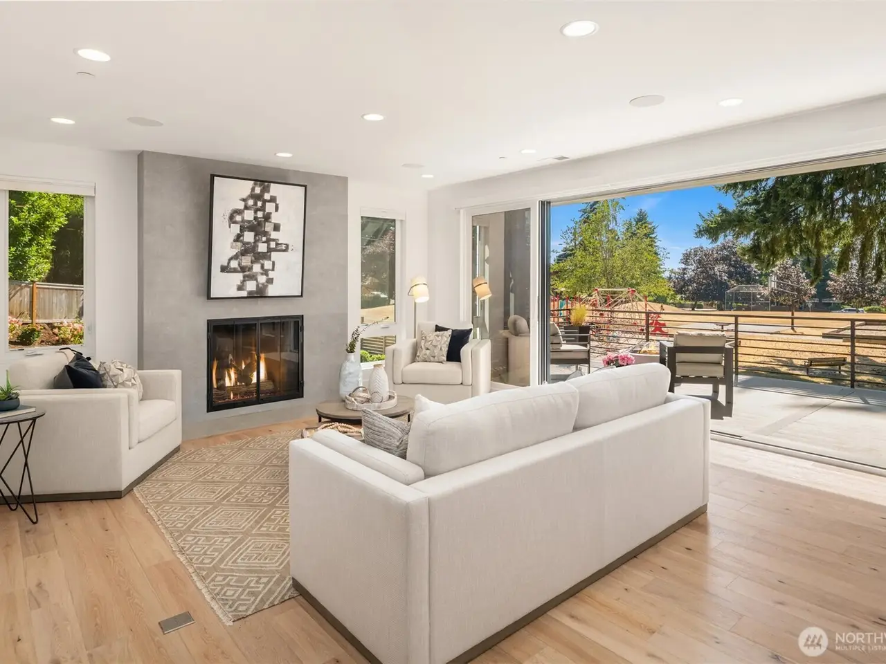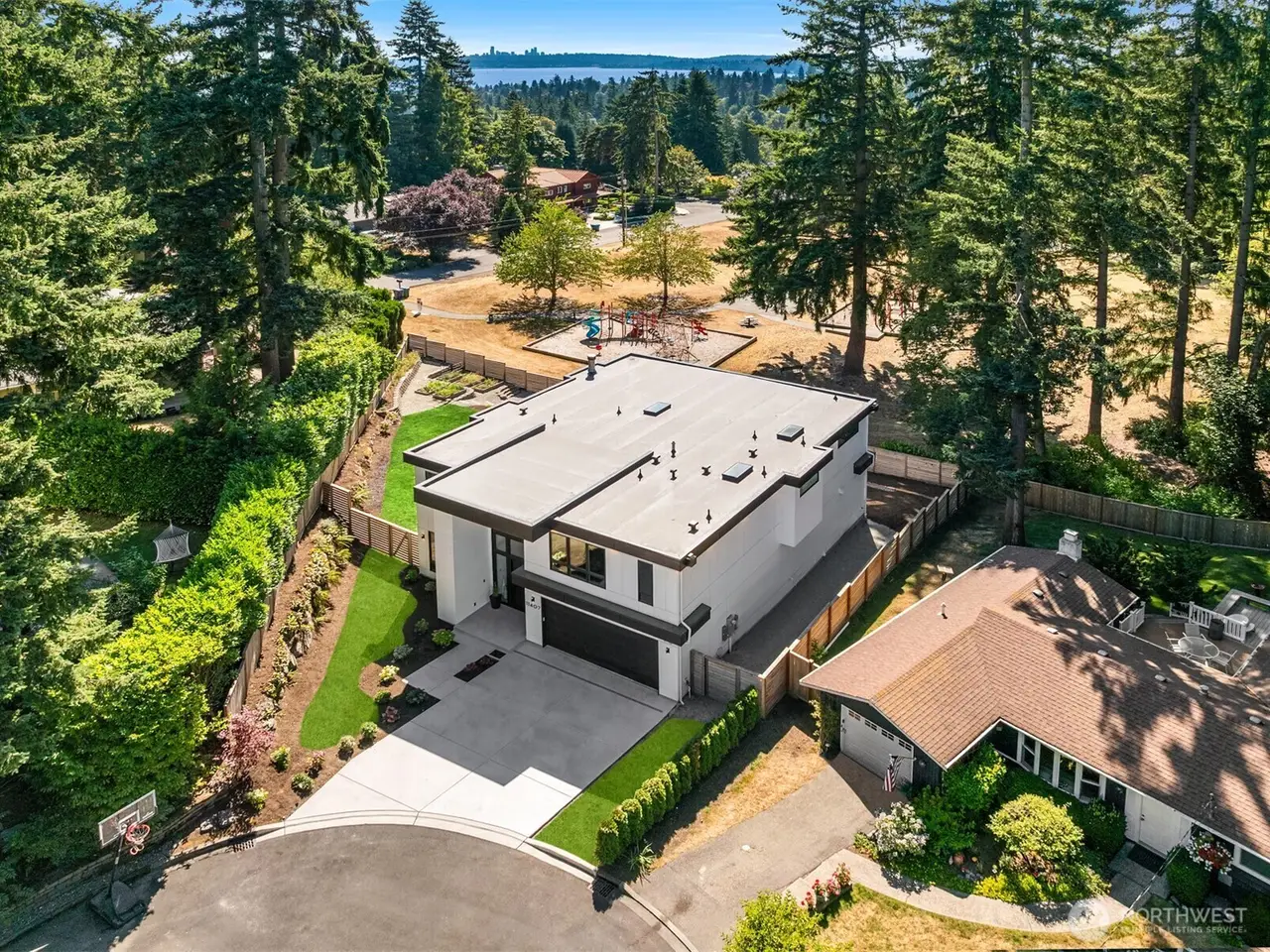 Design-forward like-new construction in desirable Highlands. Ideal cul-de-sac location overlooking expansive neighborhood park. Statement entry accentuated by dramatic two-story windows, showpiece lighting and floating staircase. Chef’s dream kitchen crafted for style and functionality with two dishwashers, premium appliances, pantry, appliance garage and built-in buffet. Great room w/sliding glass wall opens to covered deck and park views. Luxurious primary suite and spa-inspired bath with balcony, modern soaking tub, shower for two and custom closet. Spacious bonus room with deck and adjacent wet bar. Many app-controlled features from lighting to blinds, sound system and more. Enjoy serene sunsets, Kirkland’s best schools. Close to waterfront, dining, boutiques and more!