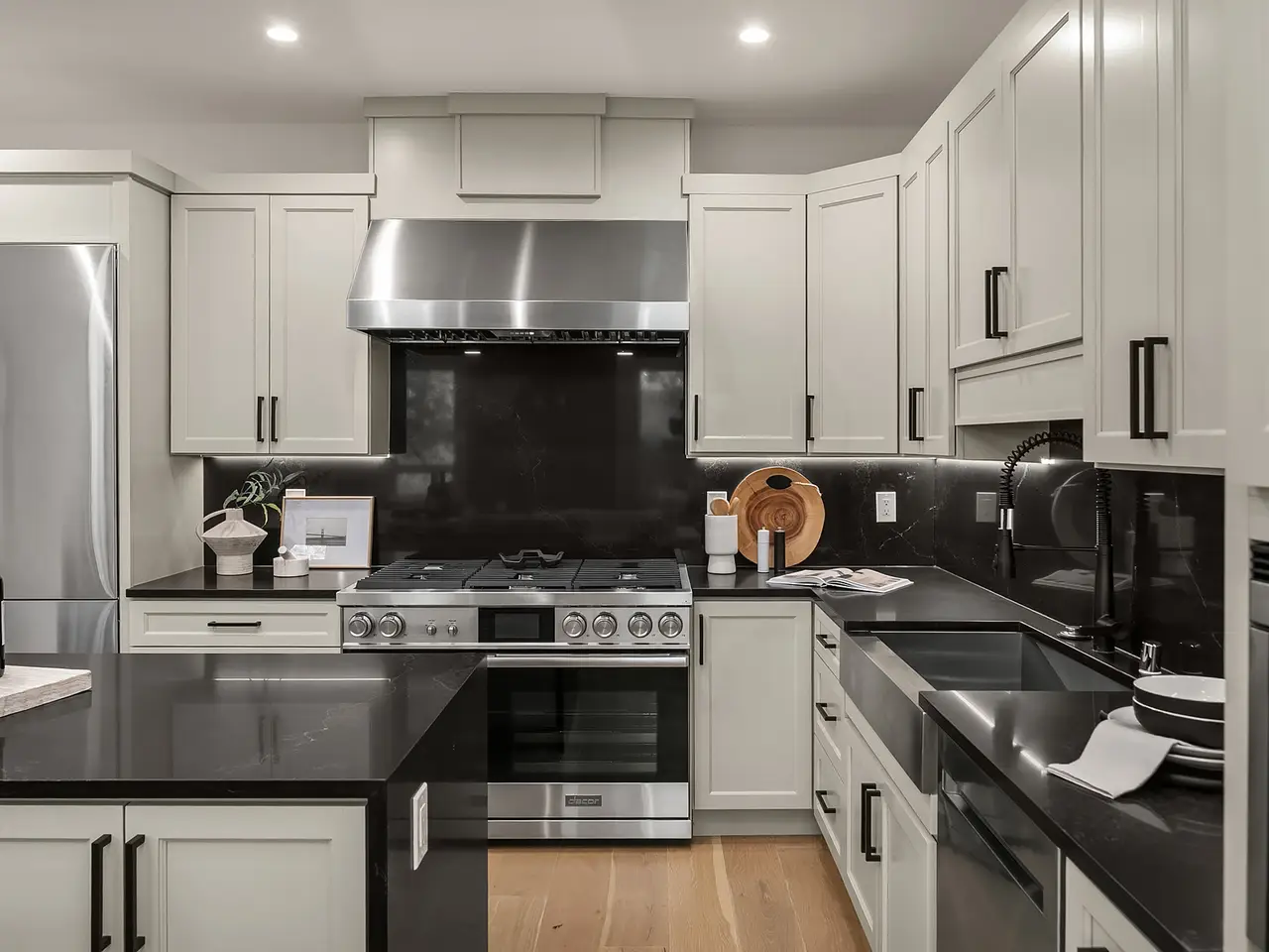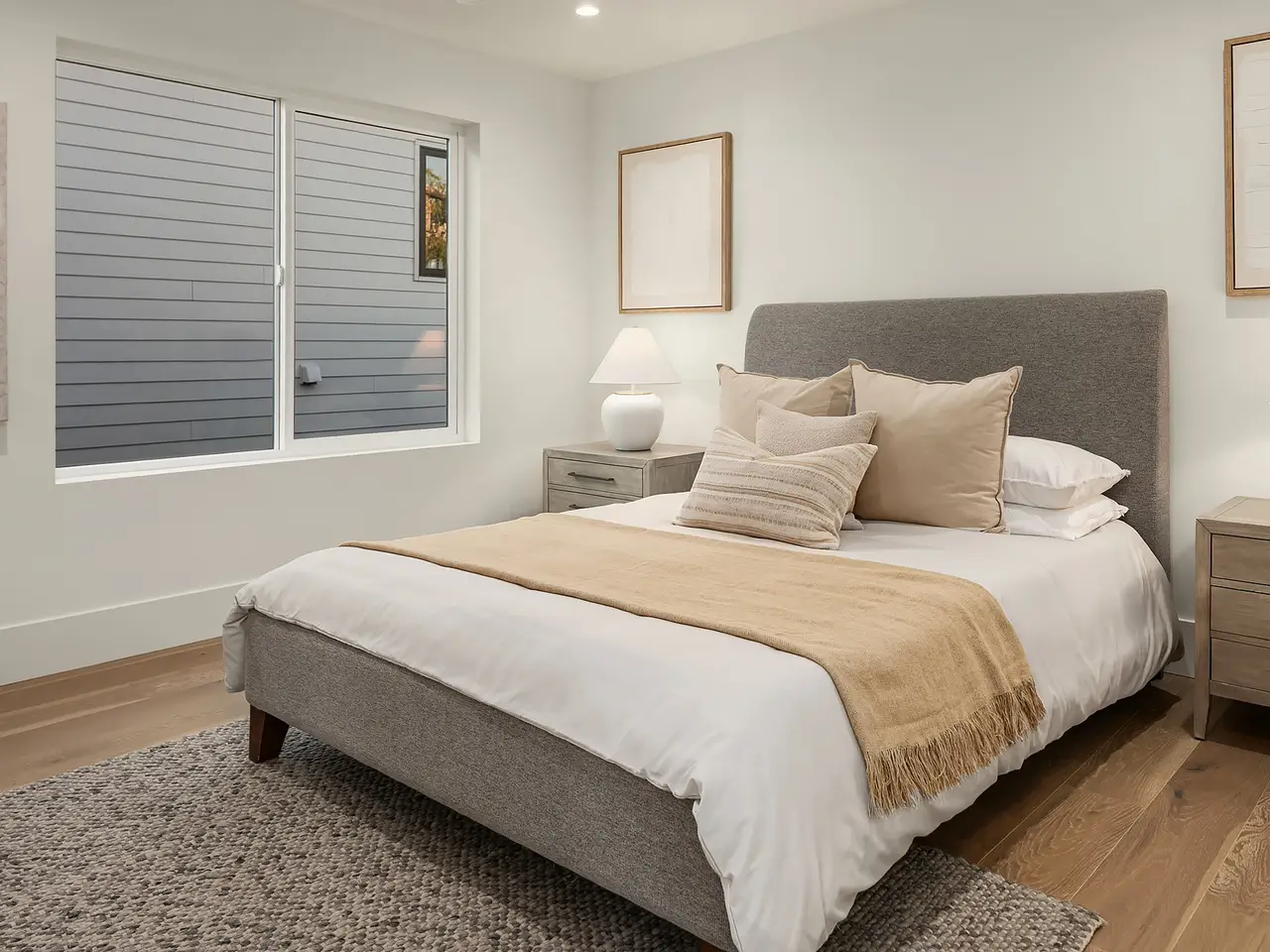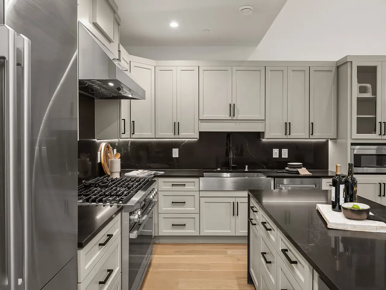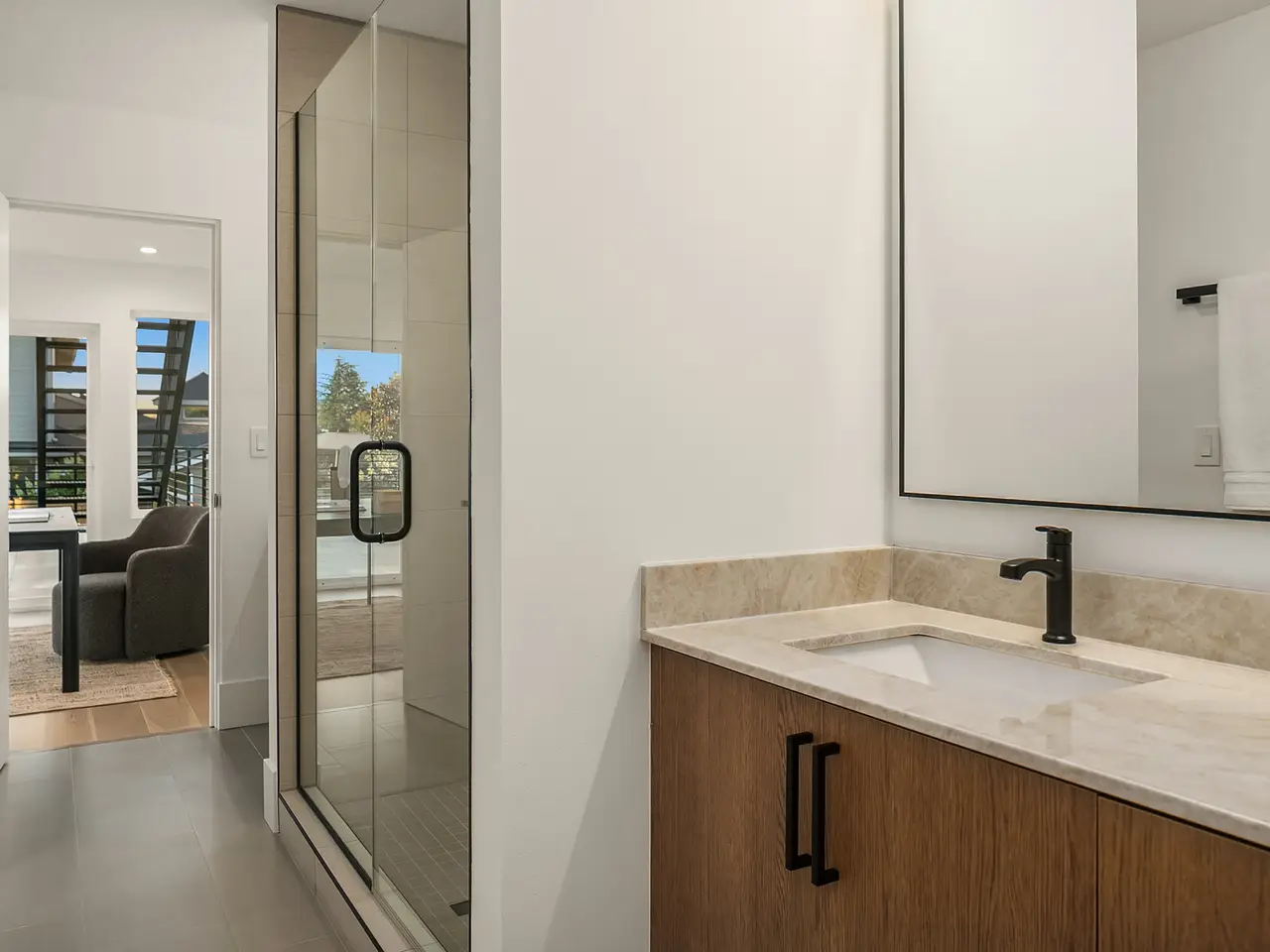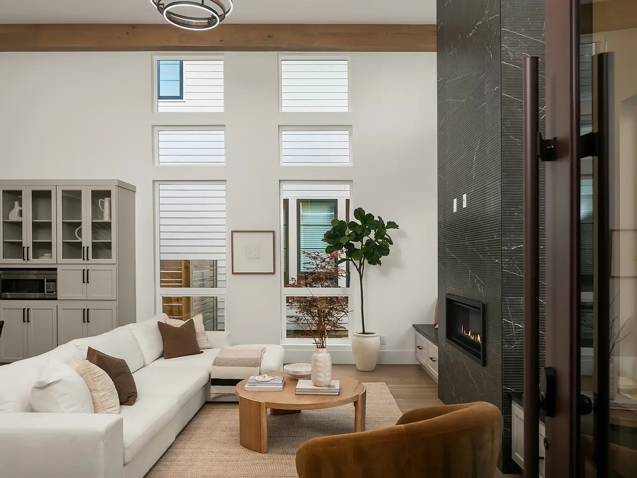Located in coveted West of Market, this newly completed home blends luxury and comfort just steps to downtown, parks, and the waterfront. Upon entering, you are greeted by a stunning great room with 16-ft vaulted ceilings and a floor-to-ceiling fireplace. The spacious kitchen features a double waterfall quartz island, full slab backsplash, Dacor professional-grade appliances, and walk-in pantry. Main floor primary suite with lavish 5-piece spa bath featuring quartzite countertops, heated floors, and large soaking tub. Upper level features 2 additional bedrooms, and access to 600sf of entertainment deck including a 400sf rooftop with panoramic views of lake and mountains. No shared walls, fully fenced yard, A/C, 2-car garage w EV charger.
