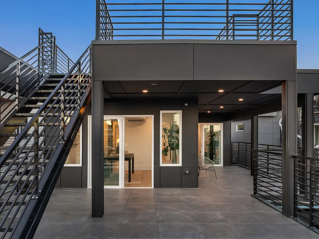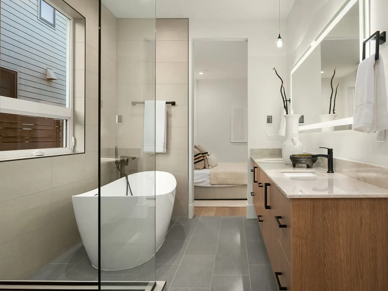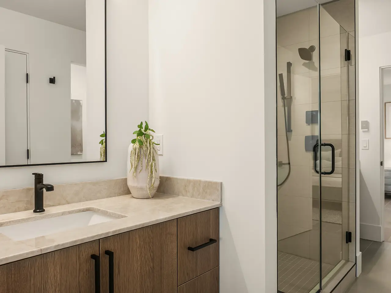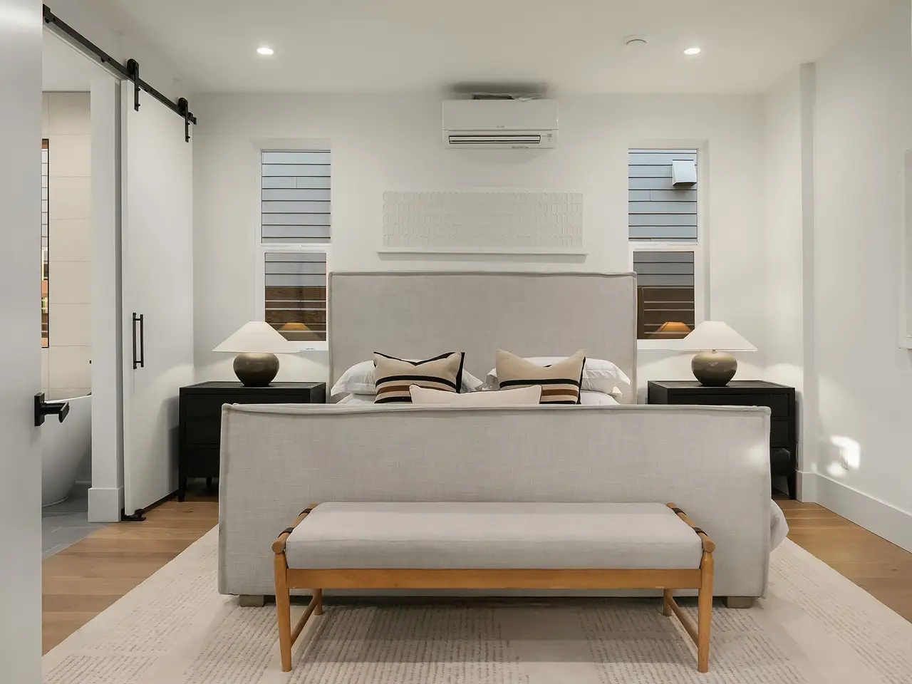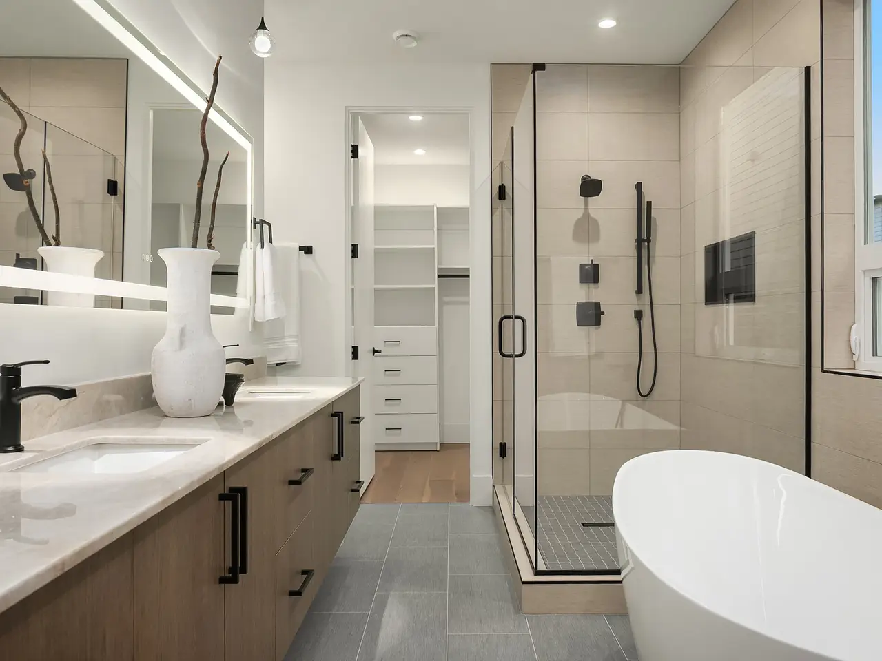 Located in coveted West of Market, this newly completed home blends luxury and comfort just steps to downtown, parks, and the waterfront. Upon entering, you are greeted by a stunning great room with 16-ft vaulted ceilings and a floor-to-ceiling fireplace. The spacious kitchen features a double waterfall quartz island, full slab backsplash, Dacor professional-grade appliances, and walk-in pantry. Main floor primary suite with lavish 5-piece spa bath featuring quartzite countertops, heated floors, and large soaking tub. Upper level features 2 additional bedrooms, and access to 600sf of entertainment deck including a 400sf rooftop with panoramic views of lake and mountains. No shared walls, fully fenced yard, A/C, 2-car garage w EV charger.