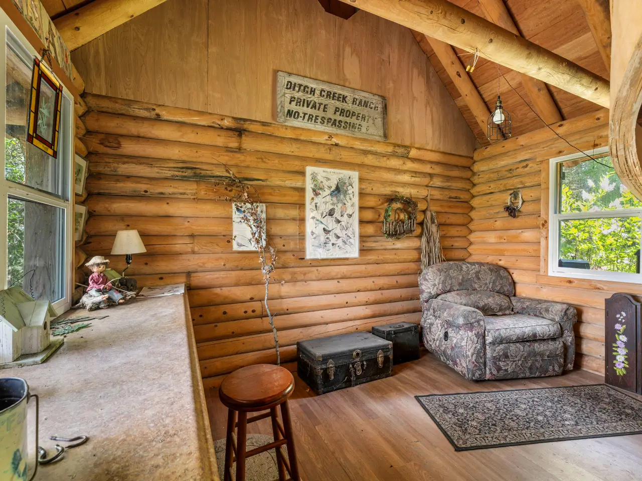 Log cabin hobby room with spiral staircase