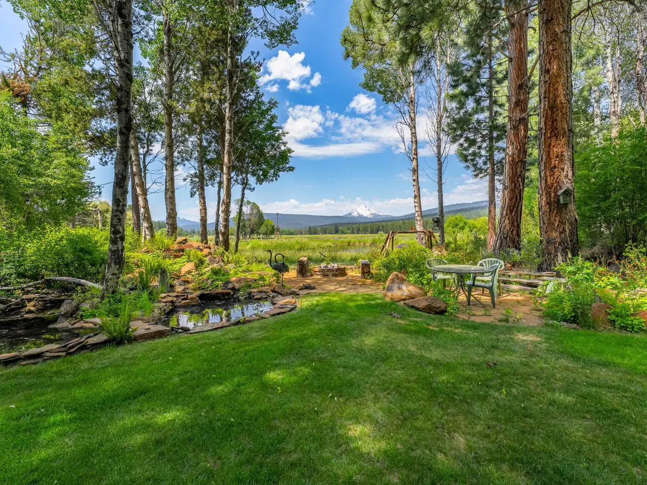 Landscaped lawn with water feature