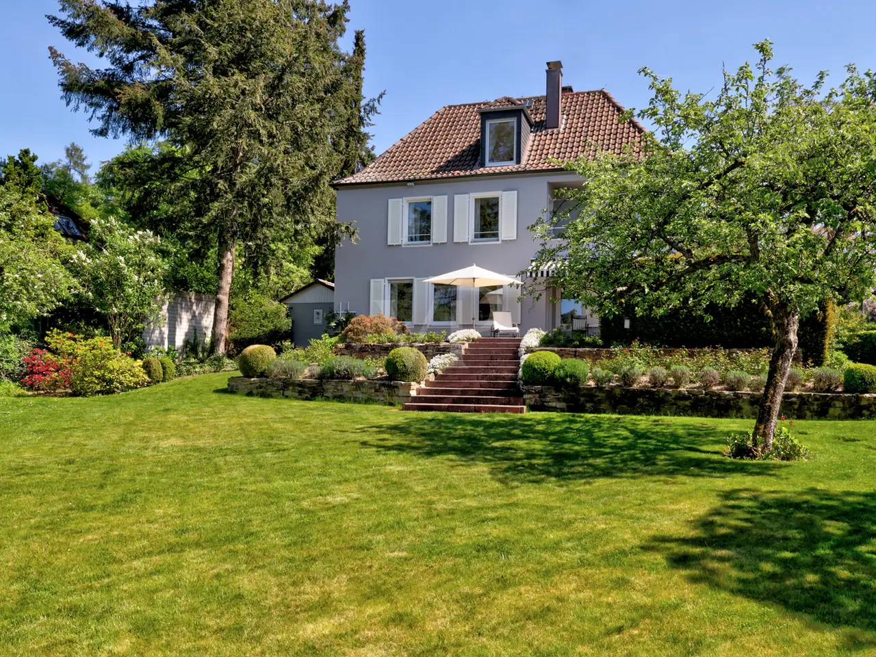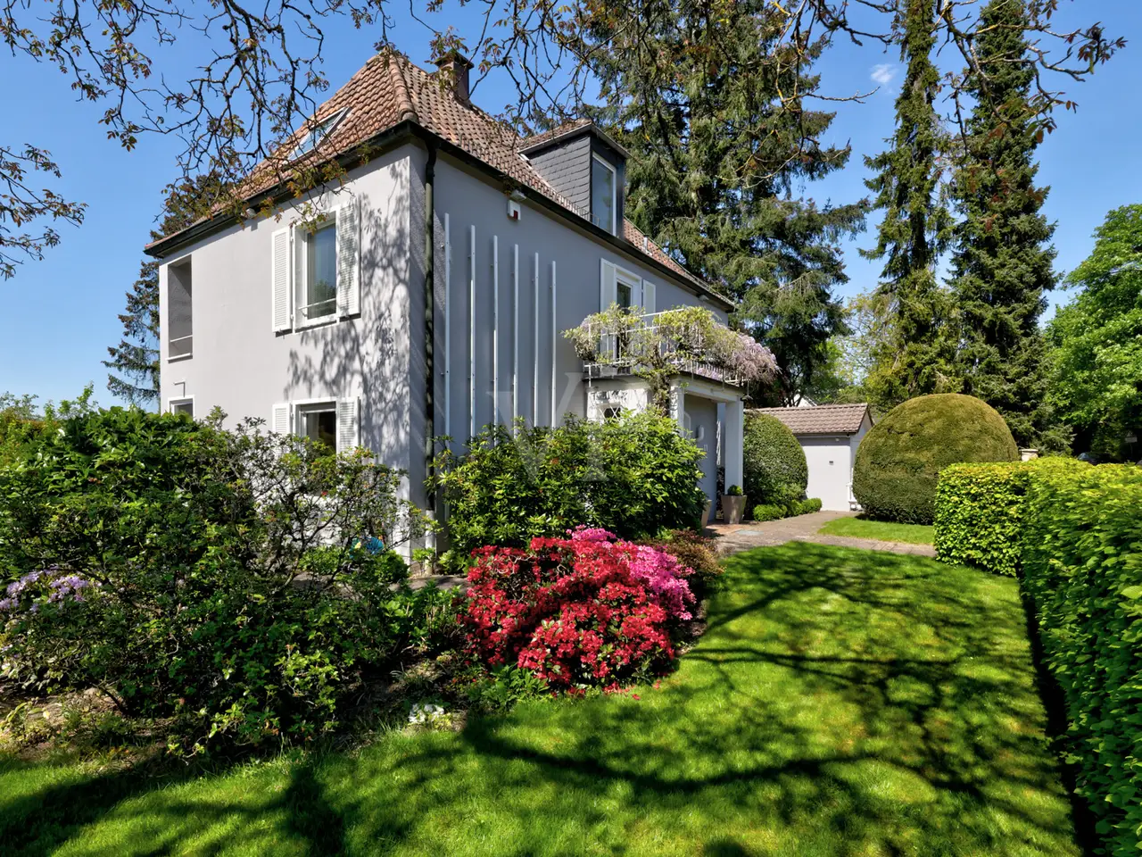 This stylish country house villa is located in one of the most exclusive micro-locations Königstein-Falkenstein has to offer and combines classic country house architecture with a solid amount of space and a high level of living comfort. The property was built in 1951 as a solid construction and extensively renovated in 1984 - including the renewal of electrics, water pipes and other central components. On a sunny, west-facing plot of approx. 1,181 m², the property offers around 186 m² of living space spread over three floors: first floor, second floor and a converted attic. The house also has a basement. The hipped roof with its hand-fired roof tiles, as well as additional dormers and shutters on the windows, give the house its typical country house charm. On the first floor, the villa impresses with its well thought-out and open room layout. An entrance hall, checkroom and a guest WC form the inviting entrance area. The light-flooded, open-plan living and dining area is the heart of the house and is characterized by large windows and the atmospheric open fireplace. From here, you have direct access to the spacious terrace and the beautifully landscaped garden. The adjoining fitted kitchen can be opened up to the living area if required to create a modern living concept. There are three beautifully designed bedrooms on the upper floor, two of which have access to a covered balcony with a wonderful view of the historic Falkenstein Castle. A daylight bathroom with bathtub and shower completes this area and ensures pleasant comfort. The converted attic extends the living space by approx. 40 m² and offers numerous possibilities for use. It has its own bathroom, practical built-in cupboards and existing connections for a kitchenette - ideal as a granny annexe, teenager's room or hobby room. In the basement there are two spacious storage rooms, a laundry room, a separate ironing room and the boiler room. The building services are modern: the villa is heated by a Viessmann gas central heating system (approx. 15 years old). Radiators provide cozy warmth in the living areas, while the bathrooms are equipped with electric underfloor heating. The well-kept property not only offers plenty of space for relaxation, but also an excellent infrastructure for vehicles: a spacious double garage with direct access to the garden, a separate single garage and several outdoor parking spaces are available. The successful combination of classic design, well thought-out floor plan and high-quality furnishings makes this villa an exceptional property with great potential. Expansion measures such as extensions or conversions are possible and offer space for individual design. Summary: This characterful villa in a prime location in Falkenstein offers a rare combination of charm, substance and development potential - ideal for discerning families or individualists with an eye for quality. We would be delighted to show you this special property during a personal viewing.