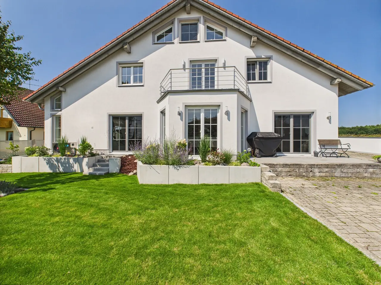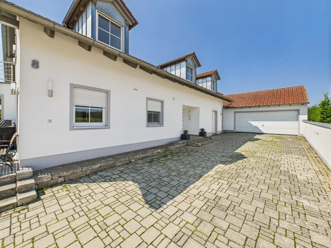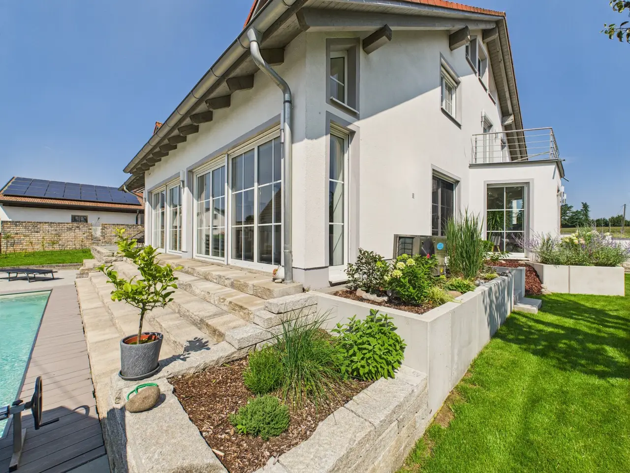 Spacious detached or semi-detached house with wellness area, pool and a variety of uses - close to Landshut in a quiet location in Oberdessing This property, built from scratch in 2001, impresses with its spaciousness, well-kept condition and upscale furnishings. A living space of approx. 350 m² is spread over three floors - currently used as a two-family house, with a declaration of division already in place. With little effort, the house can also be ideally designed as a spacious single-family home. On the first floor, you are greeted by an impressive living/dining area with fireplace and open kitchen concept. The modern fitted kitchen, high-quality materials such as parquet flooring and tiles, as well as the light-flooded architecture give the living space an almost loft-like ambience. There is a real highlight in the basement: a spacious fitness and wellness area with panoramic sauna, shower and relaxation zone - ideal for hobbies, home office or practice use. The second residential unit is fully self-contained and could be rented out as an investment or sold separately if required. The house is also perfect as a multi-generational solution. The approx. 850 m² plot offers a beautifully landscaped garden with pool, spacious driveway, several terraces as well as two garages and four parking spaces. The rural location combines tranquillity with ideal proximity to the city - you can reach the Landshut city limits in just a few minutes. A house with many options: whether as a spacious family home, a capital investment or living and working under one roof - many things are possible here.