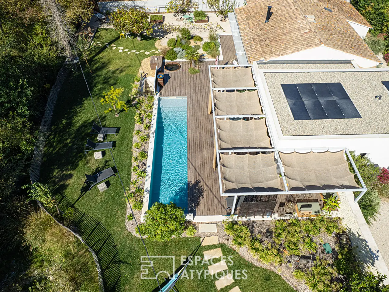 Hidden in a residential area just 1.8 kilometers from the historic center of Isle-sur-la-Sorgue, this magnificent house, completely renovated and extended, is an elegant and modern refuge. Under the guidance of a renowned architect and the mastery of passionate local craftsmen, the owners saw their dreams go from paper to reality. Every detail, every opening was designed with comfort and aesthetics in mind. The main part of the renovation and extension consisted of opening the house to the outside so that each space could benefit from the garden. Free of unnecessary partitions, the volumes favor space and beautiful perspectives. The beauty of the materials is revealed from the entrance with a large pivoting door with an offset glass axis. Light floods the house, and the gaze is drawn directly to the garden. A large kitchen, dining room with its ceramic worktop simply combines refinement and functionality. In the extension, the living room offers a view and direct access to the garden. Natural light dances on the large floor tiles and wide glass doors. A magnificent Focus fireplace warms the space during beautiful winter evenings. The master suite also benefits from the view of the garden, and from the bathtub, in its adjoining bathroom, the gaze is lost on the crown of trees. An office, which can also become a bedroom, as well as a second bedroom, complete the living space. The garden, created from scratch by a landscape artist, is home to a swimming corridor and a Nordic spa, all surrounded by agapanthus and Mediterranean species. Four large steel tubs form a vegetable garden where strawberries, tomatoes and aromatic herbs grow next to fruit trees and vines. Photovoltaic solar panels are installed on the roof of the kitchen, scullery and garage. An application on the phone facilitates the management of the video portal, the alarm and the integrated watering and the garden lighting can be done remotely. Everything has been designed to provide the greatest comfort in this house entirely designed on one level. ENERGY CLASS: C / CLIMATE CLASS: A Average energy prices indexed for the years 2021, 2022, 2023 (including subscriptions): between EUR1,590 and EUR2,200 euros. REF. 856EAA Additional information * 5 rooms * 2 bedrooms * 1 bathroom * 1 bathroom * Outdoor space : 1377 SQM * Parking : 6 parking spaces * Property tax : 2 100 €