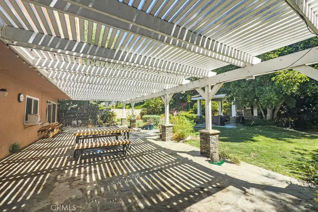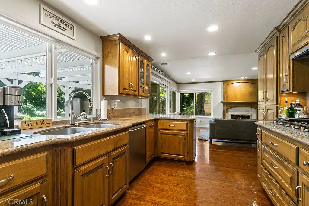 Country Hills East - Meticulously Maintained Cul-de-Sac Home Leaded glass entry doors welcome you into a stunning two-story foyer. Travertine flooring flows seamlessly through the formal living and dining rooms, creating an elegant first impression. The upgraded kitchen is a chef's delight, featuring beautiful custom pecan cabinetry, granite countertops, and stainless steel appliances. Open to the kitchen, the spacious family room is warm and inviting with matching pecan cabinetry, rich wood flooring, a stone fireplace, and recessed lighting. A sliding glass door extends the living space outdoors to a truly one-of-a-kind backyard retreat. Designed for year-round entertaining, it boasts exquisite hardscape, lush greenery, detailed stonework, and a large covered gazebo complete with an outdoor fireplace and TV. Upstairs, you'll find generously sized bedrooms with vaulted ceilings and cedar-lined closets. One bedroom is currently set up as an office with a built-in desk. The remodeled hall bathroom features the same high-quality finishes carried throughout the home for a cohesive design. The primary suite offers a bright, airy retreat with a romantic fireplace, a spa-inspired en-suite with dual vanities, and an expansive mirrored closet. Additional highlights include custom woodwork, plantation shutters, solid wood doors, and thoughtful upgrades throughout. Conveniently located near shopping, dining, movie theaters, and beautiful Laguna Lake, this home truly has it all.
