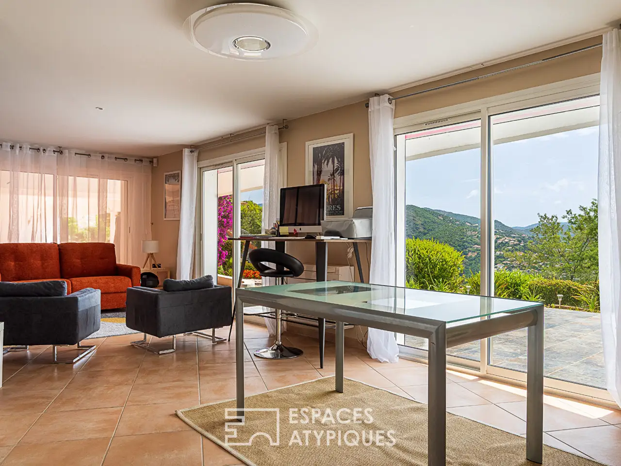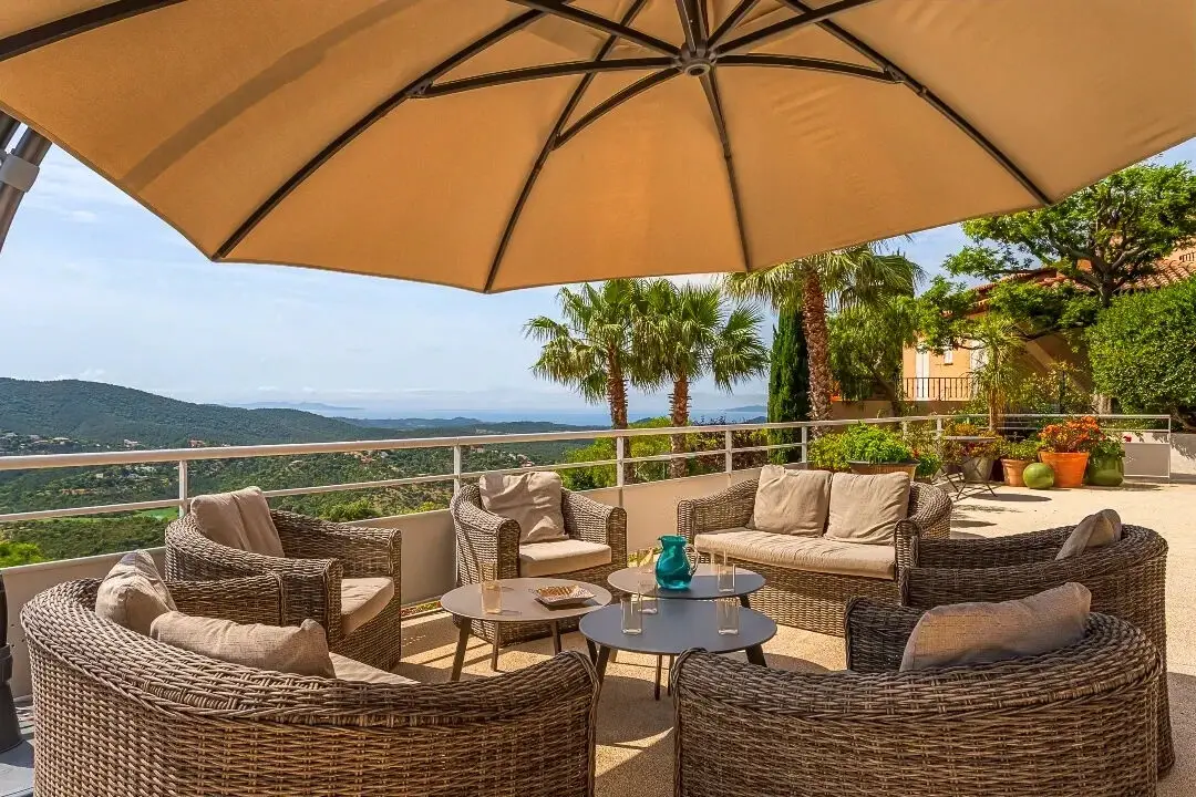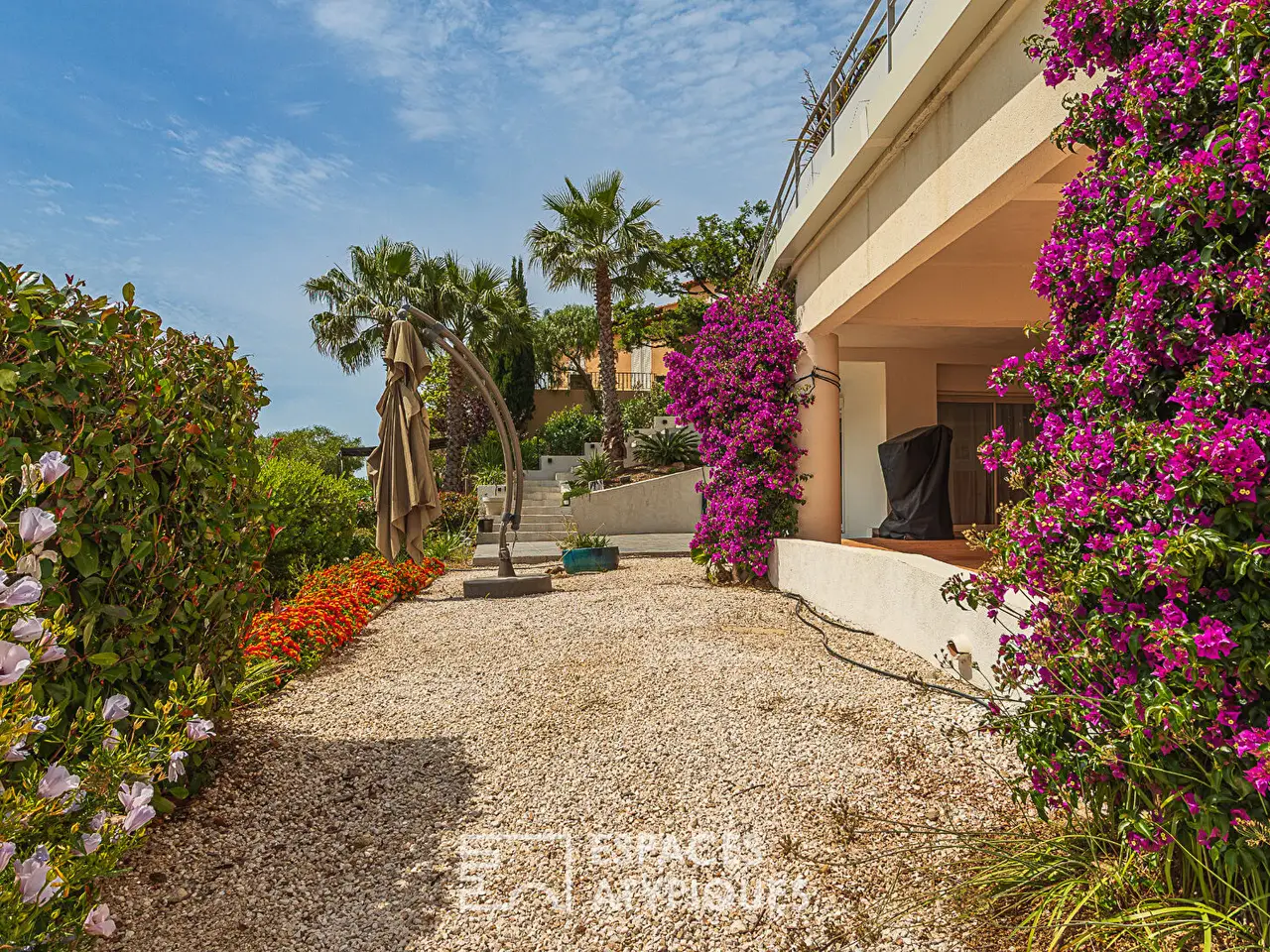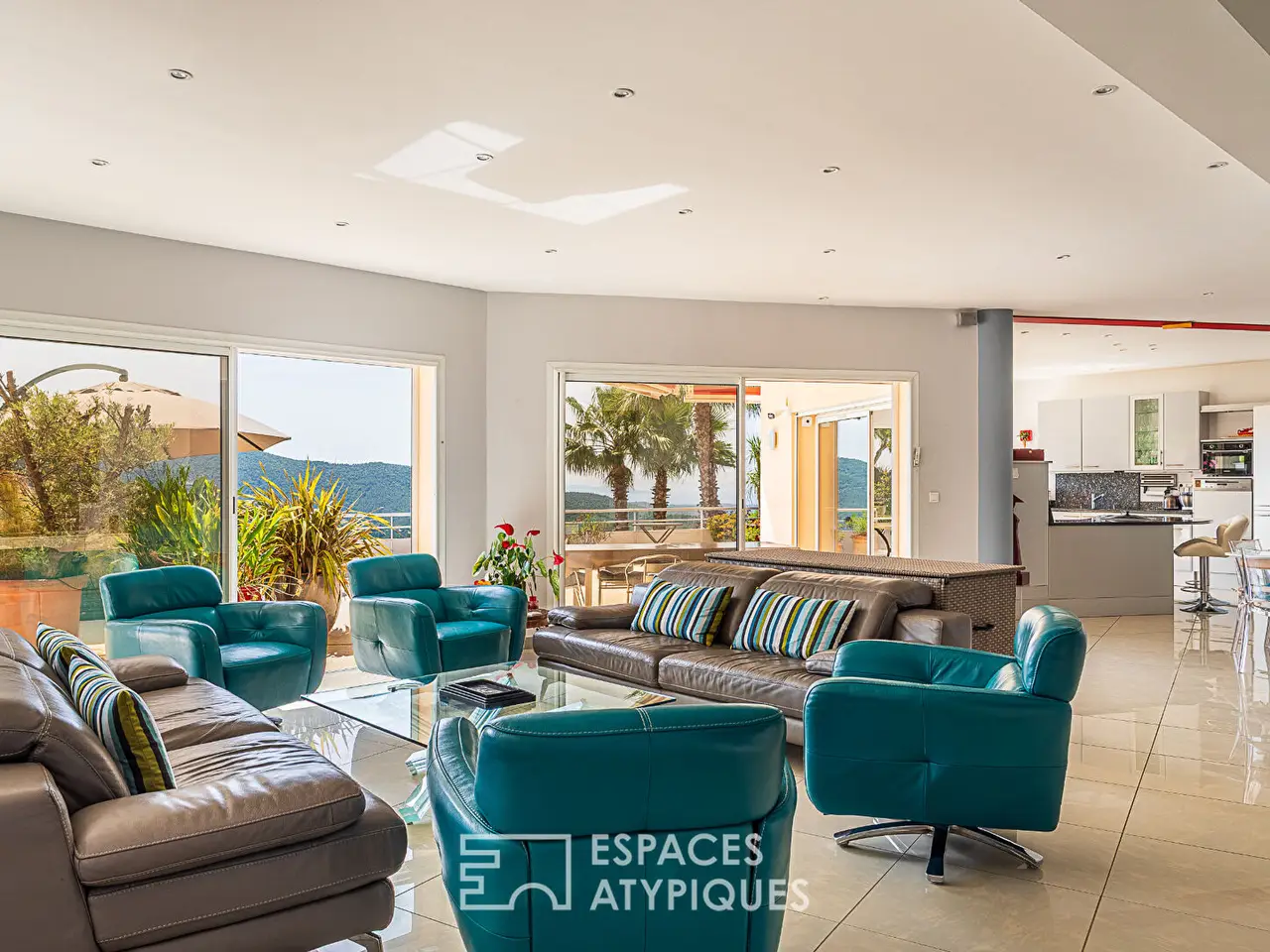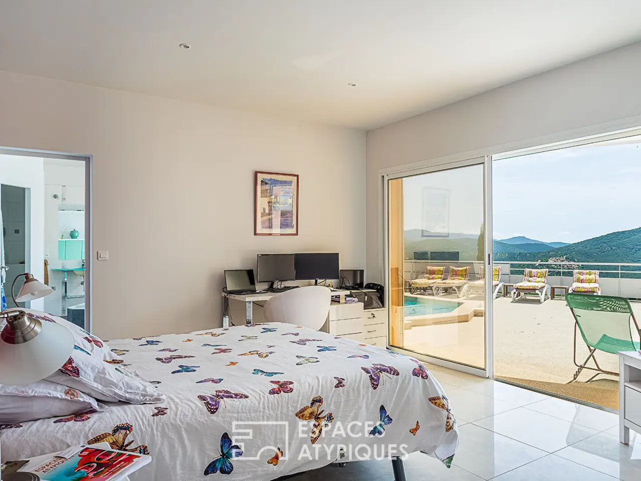 In the lush green setting of the private Valcros estate in La Londe-les-Maures, this architect-designed villa of approximately 250 sqm flourishes on a landscaped plot of 1,300 sqm, offering a striking panoramic view of the sea, the golf course, and the surrounding hills. Its contemporary silhouette dialogues with nature and invites tranquility. Extremely well designed to combine volume, comfort, and light, the property reveals, from its private elevator, a vast living space of 90 sqm extended by a contemporary kitchen with clean lines and functional spaces. The south-facing master suite invites calm with its custom-made dressing room and bathroom overlooking the jacuzzi and the swimming pool. Upstairs, a suite, bathed in light, opens onto an intimate solarium, while a spacious independent one-bedroom apartment on the garden level offers an ideal space to welcome family or guests. Outside, large terraces invite you to relax facing the sea, between a sparkling swimming pool and shaded corners conducive to contemplation. The peaceful and preserved environment allows you to savor the sweetness of the South in complete serenity and at any time, from sunrise to sunset. Just a few minutes from the beaches, golf course and amenities, this property stands out for its unique character and elegance, designed for a life focused on comfort and light. ENERGY CLASS: C 119 kWh/m2.year - CLIMATE CLASS: A 3kg CO2/m2.year Estimated average amount of annual energy expenditure for standard use, established from 2021 energy prices between EUR2,160 and EUR2,980. For more information on risks, visit the Georisques website: www.georisques.gouv.fr. ?Muriel CLADE 06.51.66.21.71. REF. 11193 Additional information * 6 rooms * 4 bedrooms * 4 shower rooms * 2 floors in the building * Outdoor space : 1350 SQM * Parking : 4 parking spaces * 40 co-ownership lots * Property tax : 1 500 € Energy Performance Certificate Primary energy consumption c : 119 kWh/m2.year High performance housing