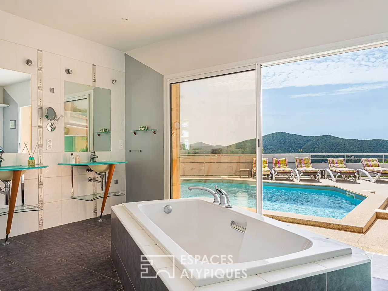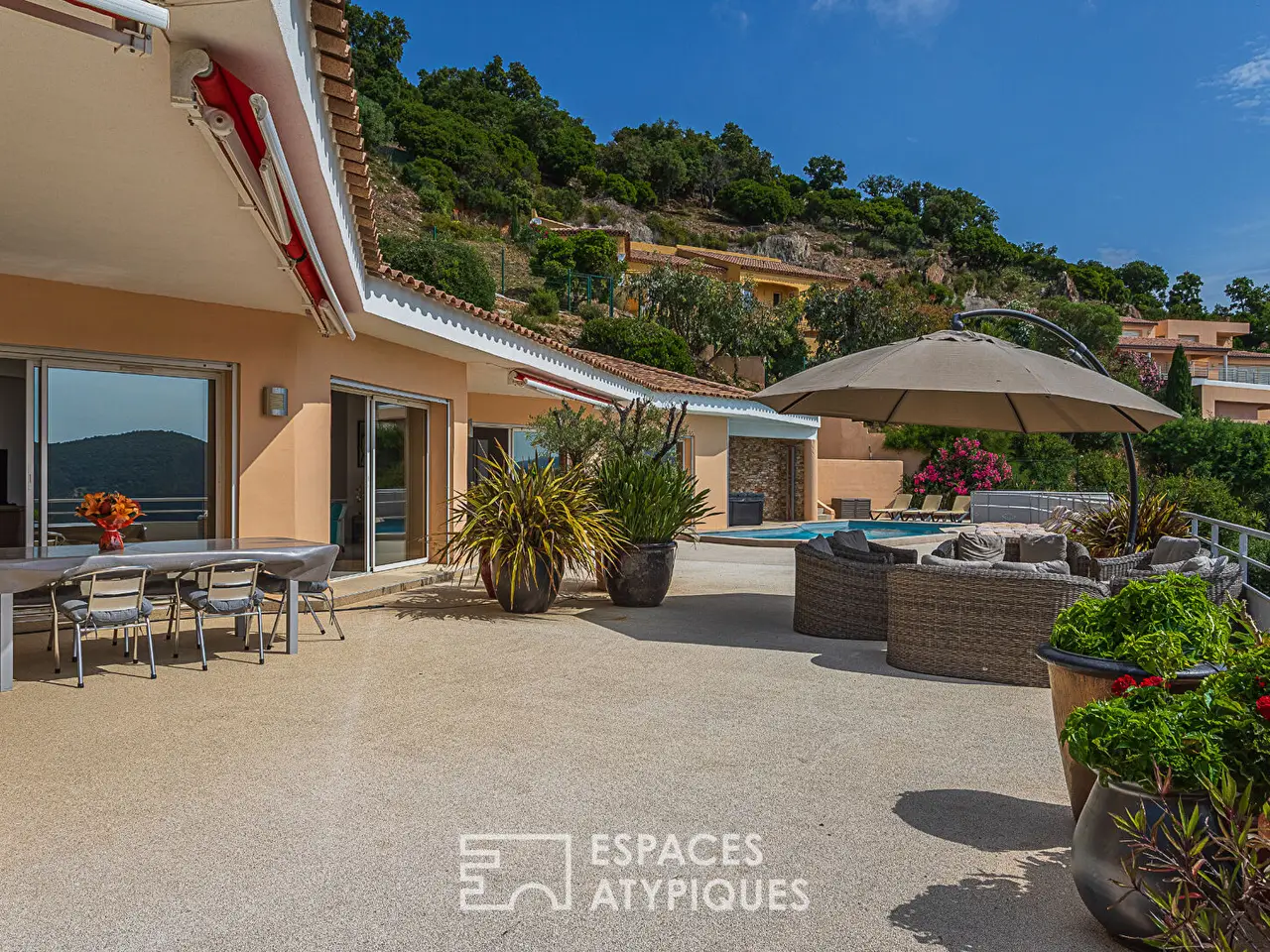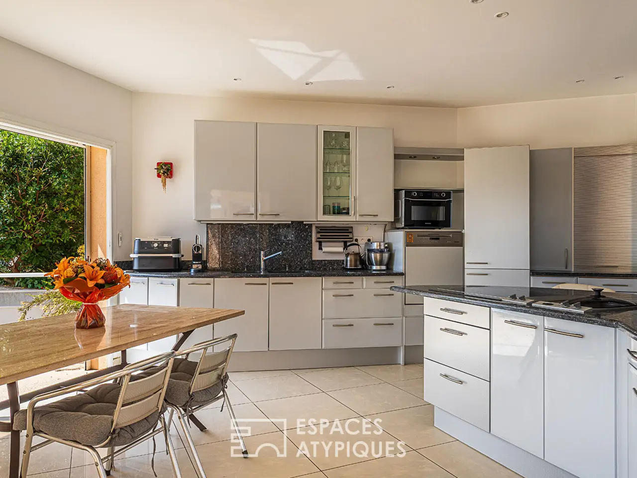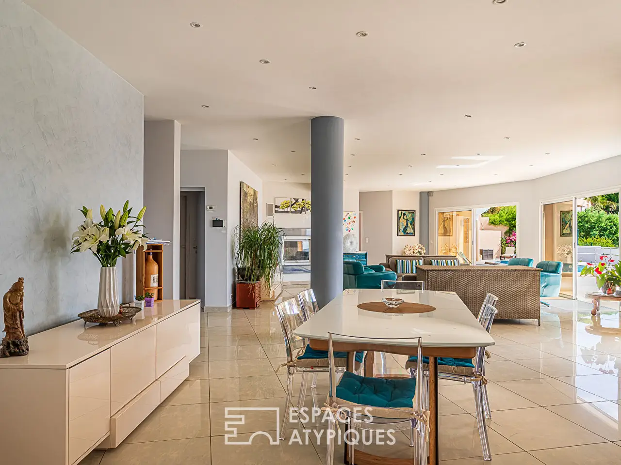 In the lush green setting of the private Valcros estate in La Londe-les-Maures, this architect-designed villa of approximately 250 sqm flourishes on a landscaped plot of 1,300 sqm, offering a striking panoramic view of the sea, the golf course, and the surrounding hills. Its contemporary silhouette dialogues with nature and invites tranquility. Extremely well designed to combine volume, comfort, and light, the property reveals, from its private elevator, a vast living space of 90 sqm extended by a contemporary kitchen with clean lines and functional spaces. The south-facing master suite invites calm with its custom-made dressing room and bathroom overlooking the jacuzzi and the swimming pool. Upstairs, a suite, bathed in light, opens onto an intimate solarium, while a spacious independent one-bedroom apartment on the garden level offers an ideal space to welcome family or guests. Outside, large terraces invite you to relax facing the sea, between a sparkling swimming pool and shaded corners conducive to contemplation. The peaceful and preserved environment allows you to savor the sweetness of the South in complete serenity and at any time, from sunrise to sunset. Just a few minutes from the beaches, golf course and amenities, this property stands out for its unique character and elegance, designed for a life focused on comfort and light. ENERGY CLASS: C 119 kWh/m2.year - CLIMATE CLASS: A 3kg CO2/m2.year Estimated average amount of annual energy expenditure for standard use, established from 2021 energy prices between EUR2,160 and EUR2,980. For more information on risks, visit the Georisques website: www.georisques.gouv.fr. ?Muriel CLADE 06.51.66.21.71. REF. 11193 Additional information * 6 rooms * 4 bedrooms * 4 shower rooms * 2 floors in the building * Outdoor space : 1350 SQM * Parking : 4 parking spaces * 40 co-ownership lots * Property tax : 1 500 € Energy Performance Certificate Primary energy consumption c : 119 kWh/m2.year High performance housing