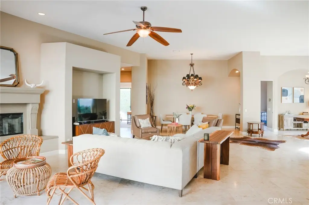 Experience the epitome of luxury living with unparalleled views and a prime location in the esteemed Point Happy Estates of La Quinta. This FULLY FURNISHED TURN KEY retreat is nestled against the majestic mountains in a tranquil neighborhood, this rare opportunity offers a secluded retreat within walking distance to exquisite dining, shopping, and coffee shops. Perfectly positioned for outdoor enthusiasts, it's just minutes away from exceptional hiking trails. Step inside to discover a home adorned with exquisite upgrades, including a Thermidor gas range, built-in stainless steel refrigerator, and luxurious travertine tile floors complemented by lofty 12' ceilings. Recent upgrades include a new 2-zone A/C system, garage A/C, patio misters, and a retractable awning, ensuring comfort and convenience year-round. Wake up to breathtaking mountain vistas from your primary suite, complete with a cozy fireplace for added ambiance. Indulge in the spa-like primary bathroom featuring a walk-in shower and spacious dual sinks. Two additional generously sized guest bedrooms offer private en-suite bathrooms, providing the perfect accommodations for visitors. Entertain in style in the open-concept living room, seamlessly flowing onto the poolside patio, where the awe-inspiring mountain views serve as a stunning backdrop. Enjoy the serenity of your own private oasis amidst meticulously manicured grounds on an oversized lot. Discover the ultimate blend of luxury, comfort, and natural beauty in this extraordinary La Quinta retreat.