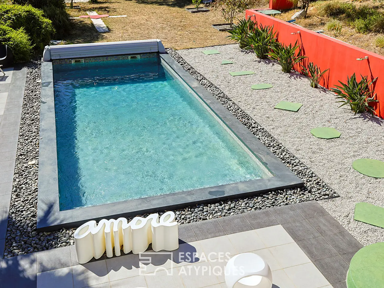 Swimming pool and shaded petanque court